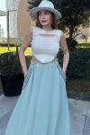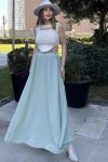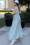 Kadın Mint Beli Lastikli, Cepleri Hasır İşlemeli, Rahat Kesim, Uzun Kiloş Etek