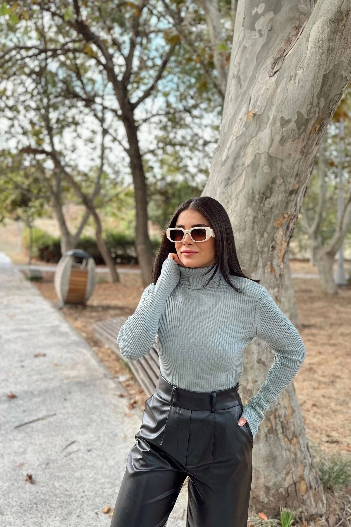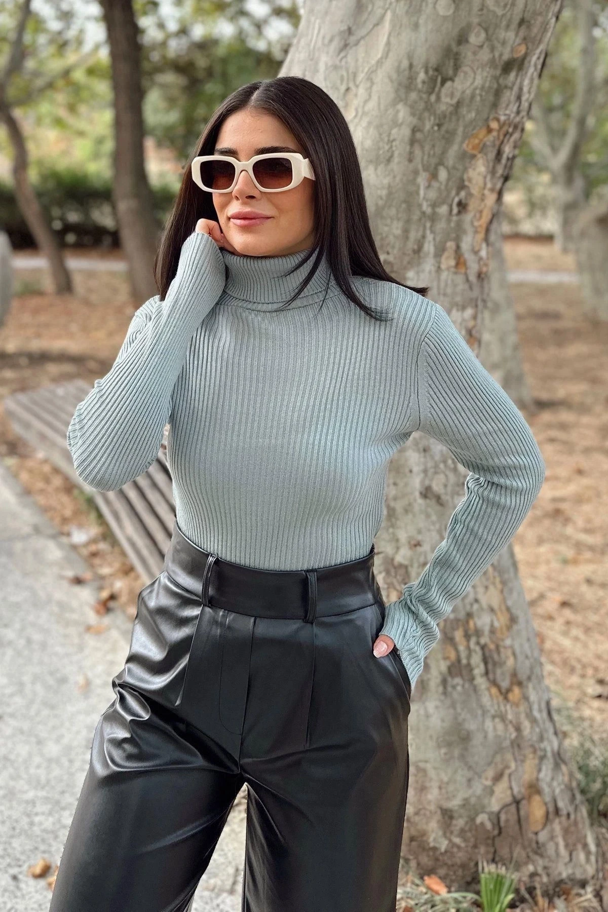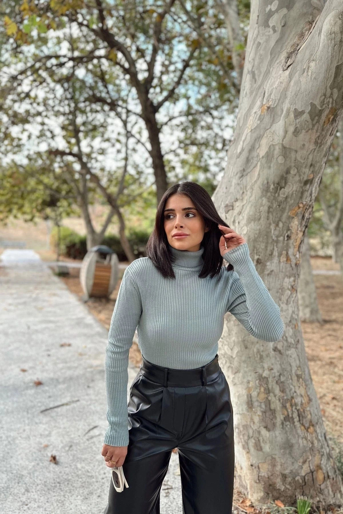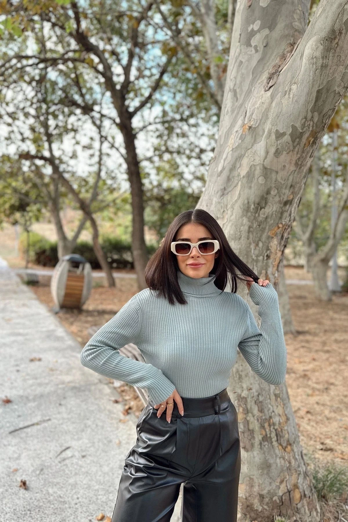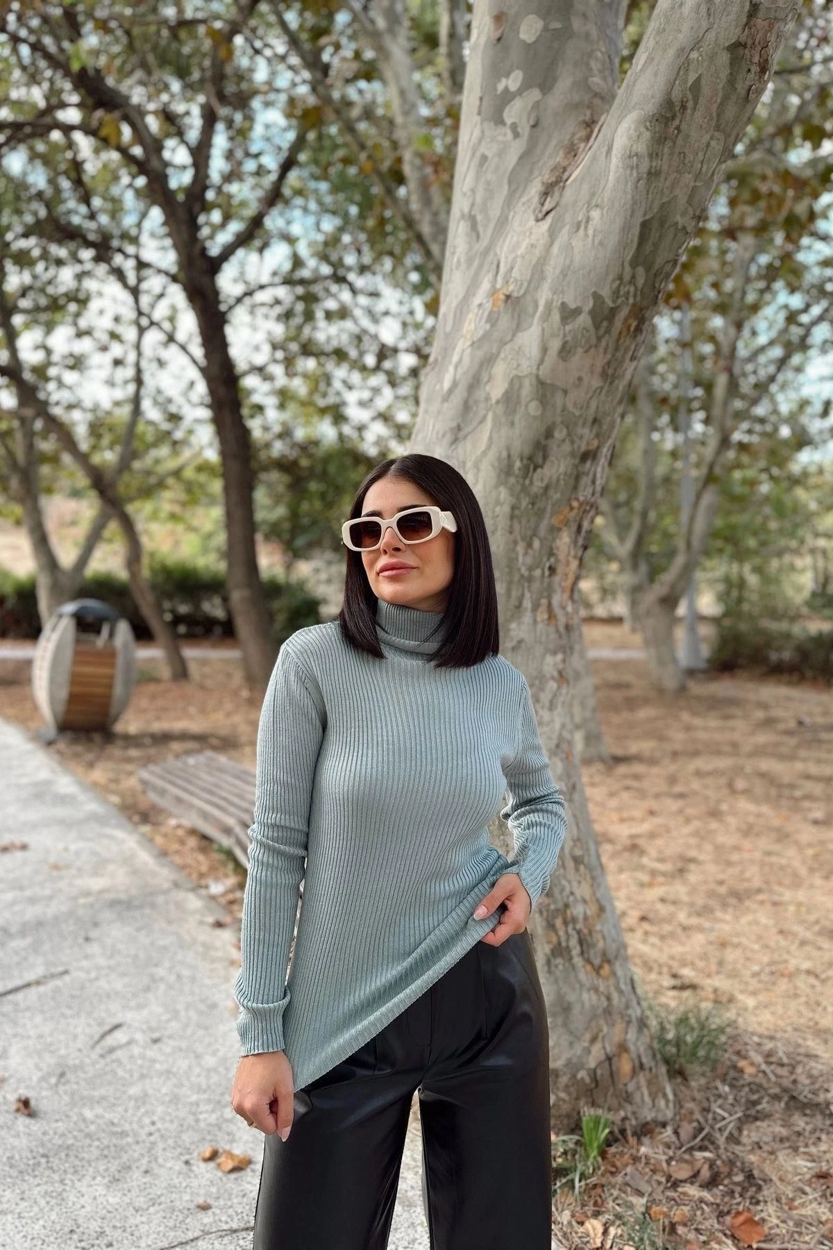 Kadın Mint Boğazlı Yaka, Uzun Kol, Vucüda Oturan Kalıp, Esnek Kumaş, Düz Desen, Triko Bluz