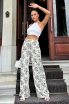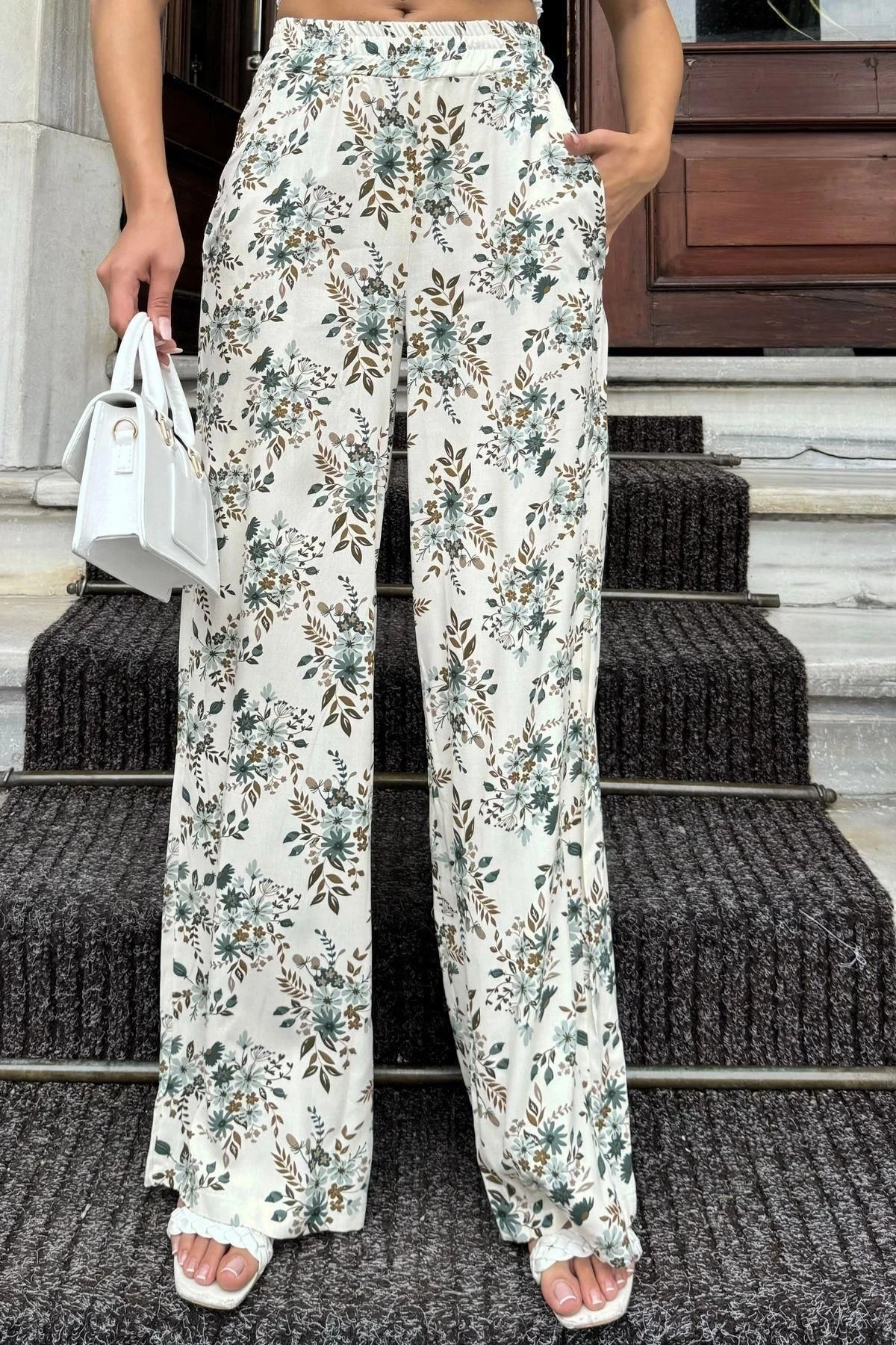 Kadın Mint & Ekru Çiçek Desenli, Yüksek Bel, Geniş Paça, Rahat Kesim Pantolon