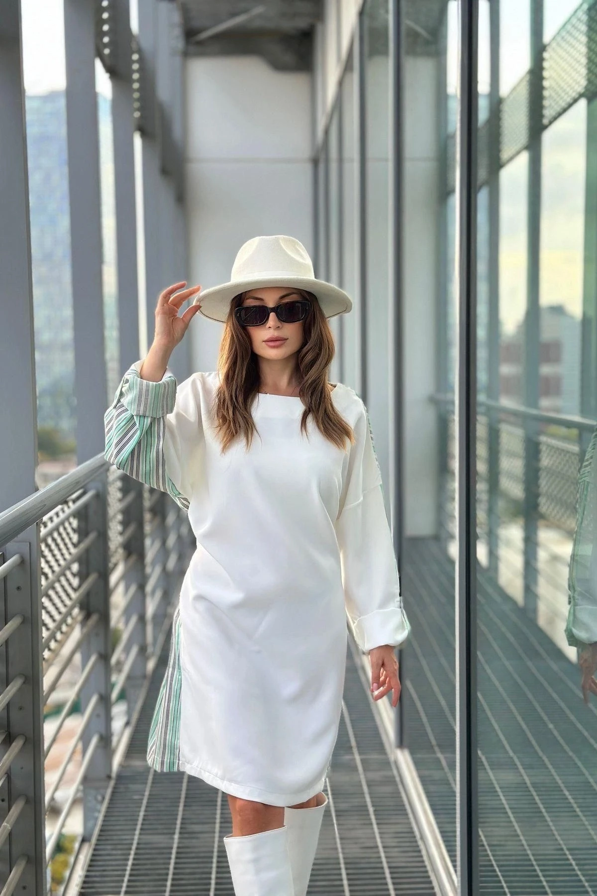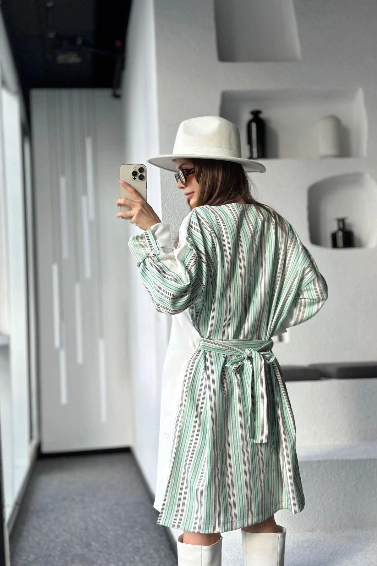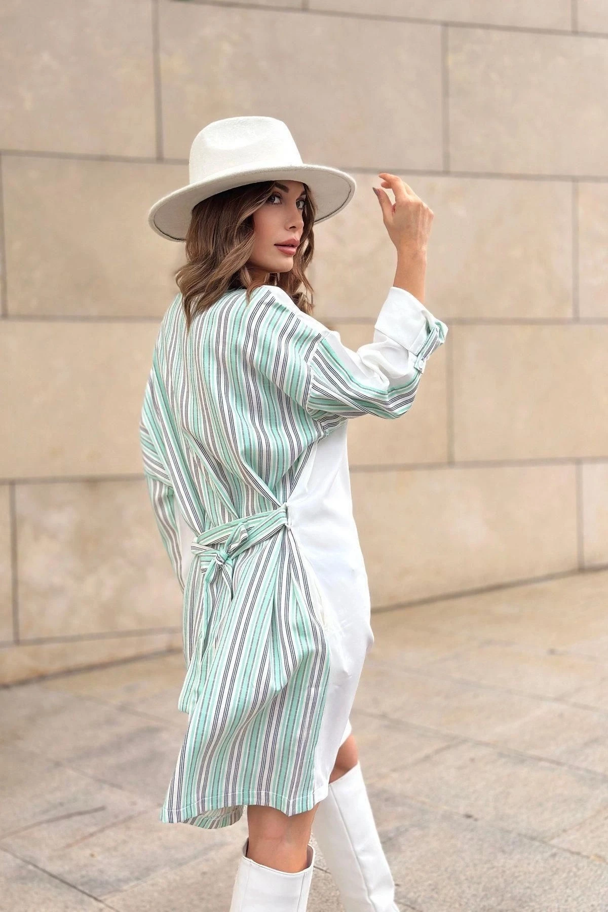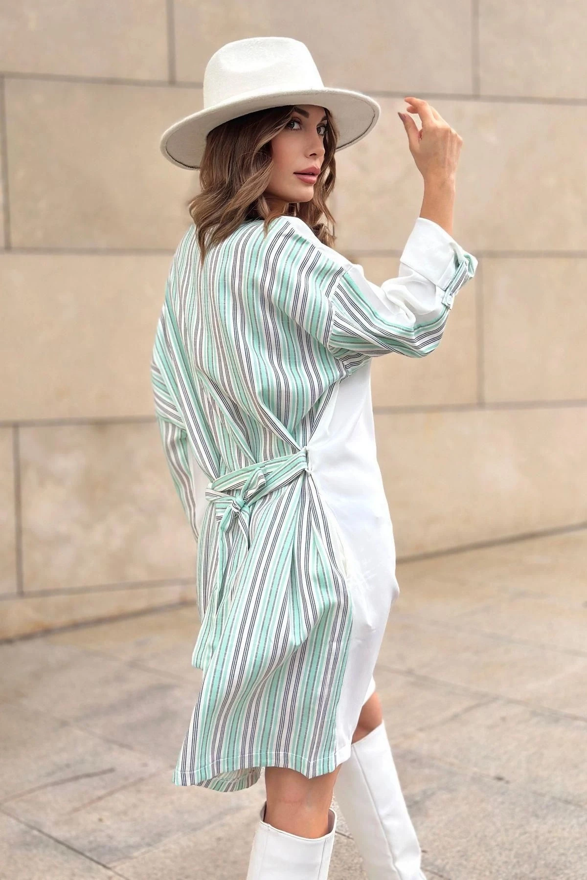 Kadın Mint & Ekru Kolu Katlamalı, Beli Kuşaklı, Yuvarlak Yaka, Salaş Elbise