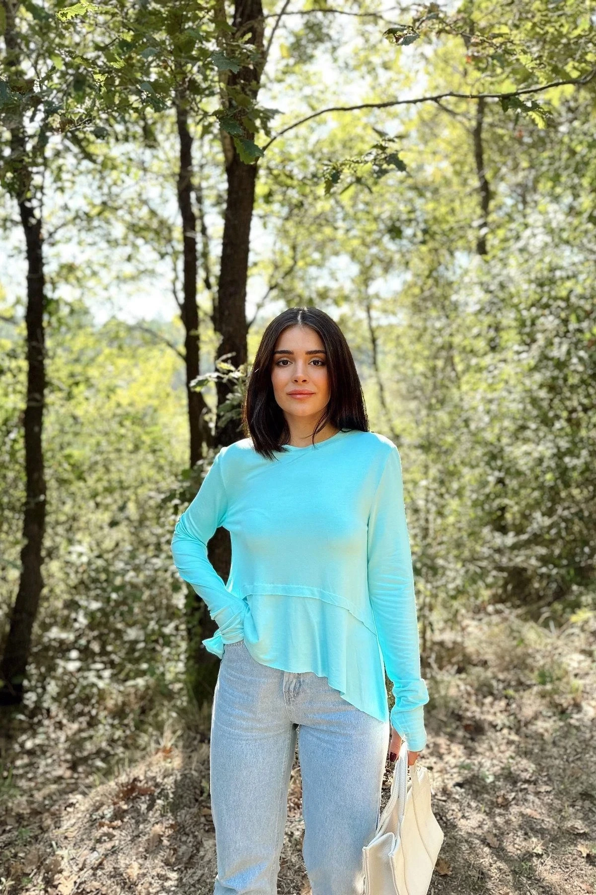 Kadın Mint Elleri Eldiven Detaylı, Asimetrik Kesim, Bisiklet Yaka, Eteği Pliseli, Salaş Spor Bluz