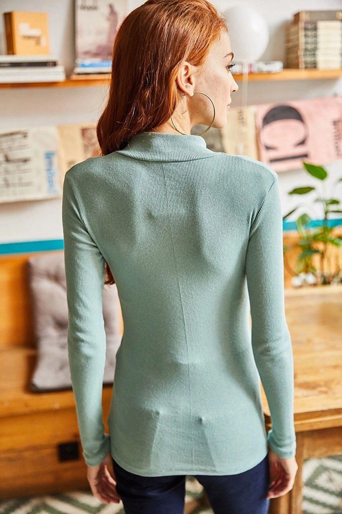 Kadın Mint Fermuar Detaylı, Dik Yaka, Uzun Kol, Basic, Regular Kesim, Standart Boy Bluz