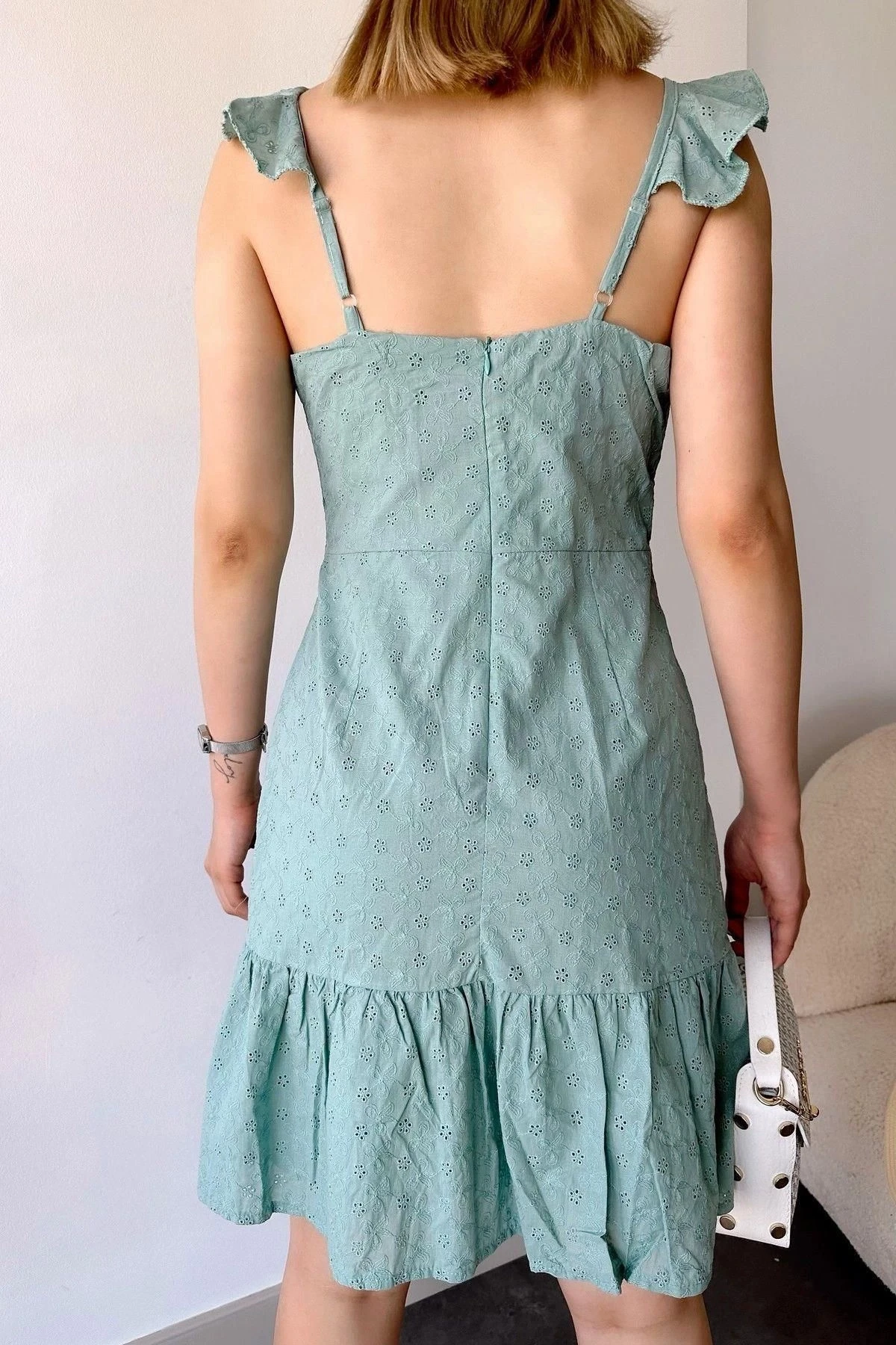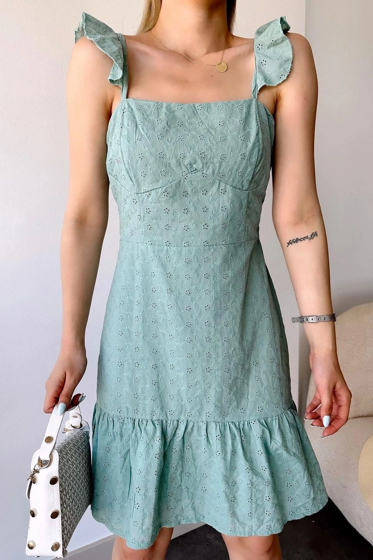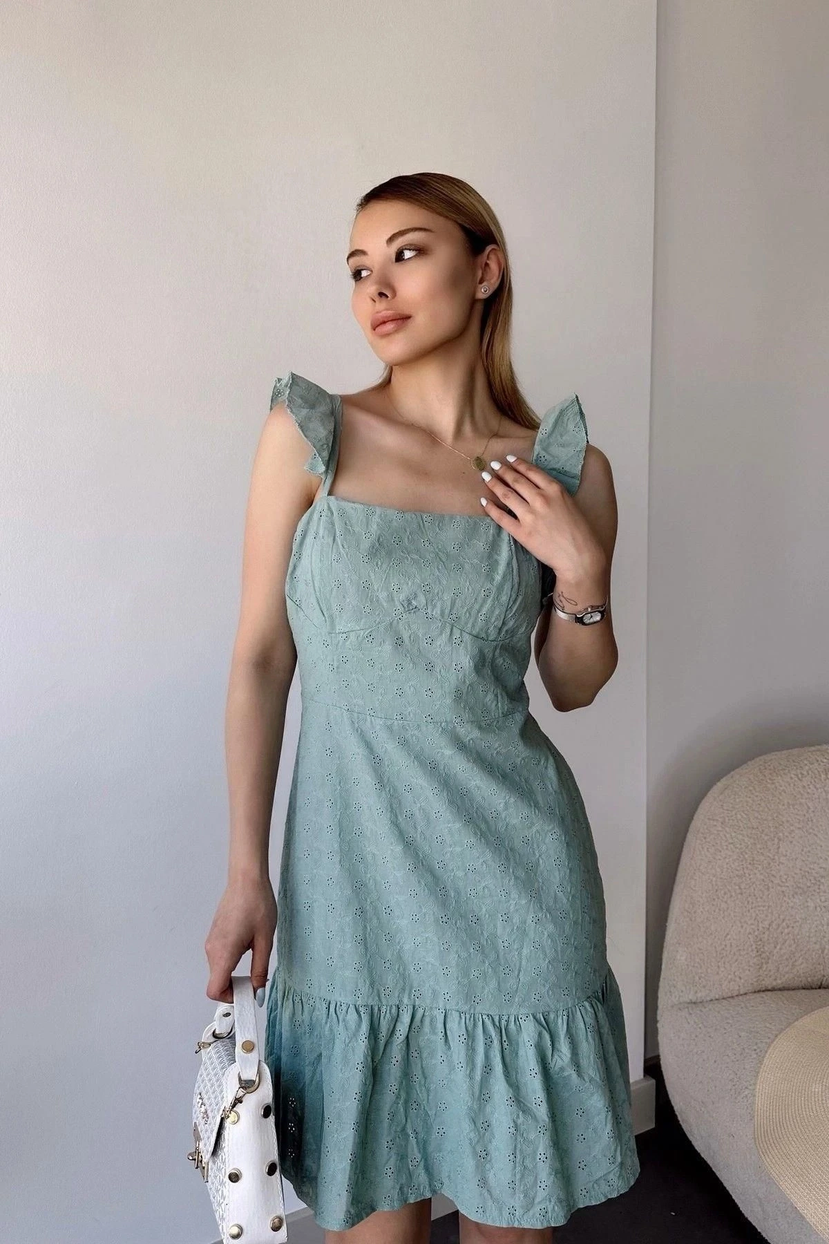 Kadın Mint İnce Askılı, Kare Yaka, Dantel/Güpür Desen, A-line Kalıp/Kesim, Midi Fisto Elbise