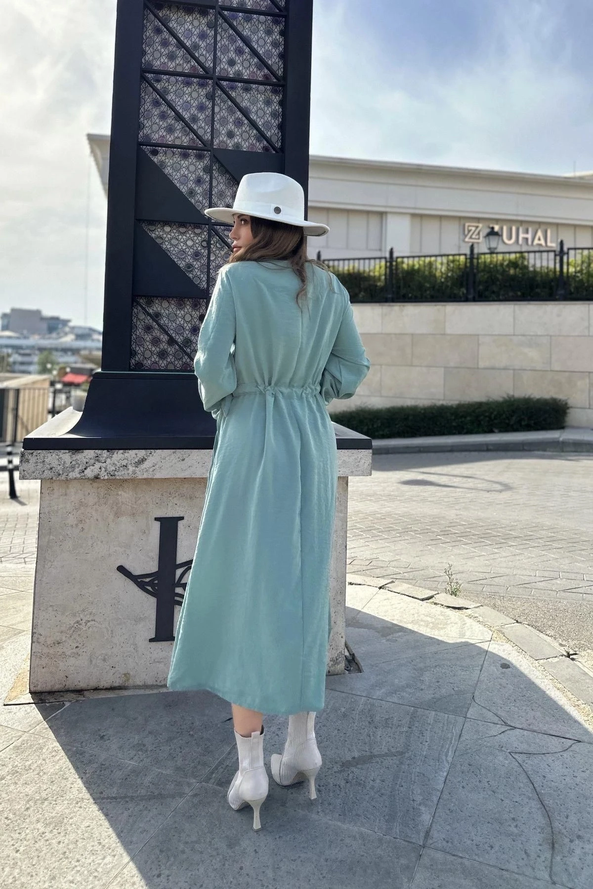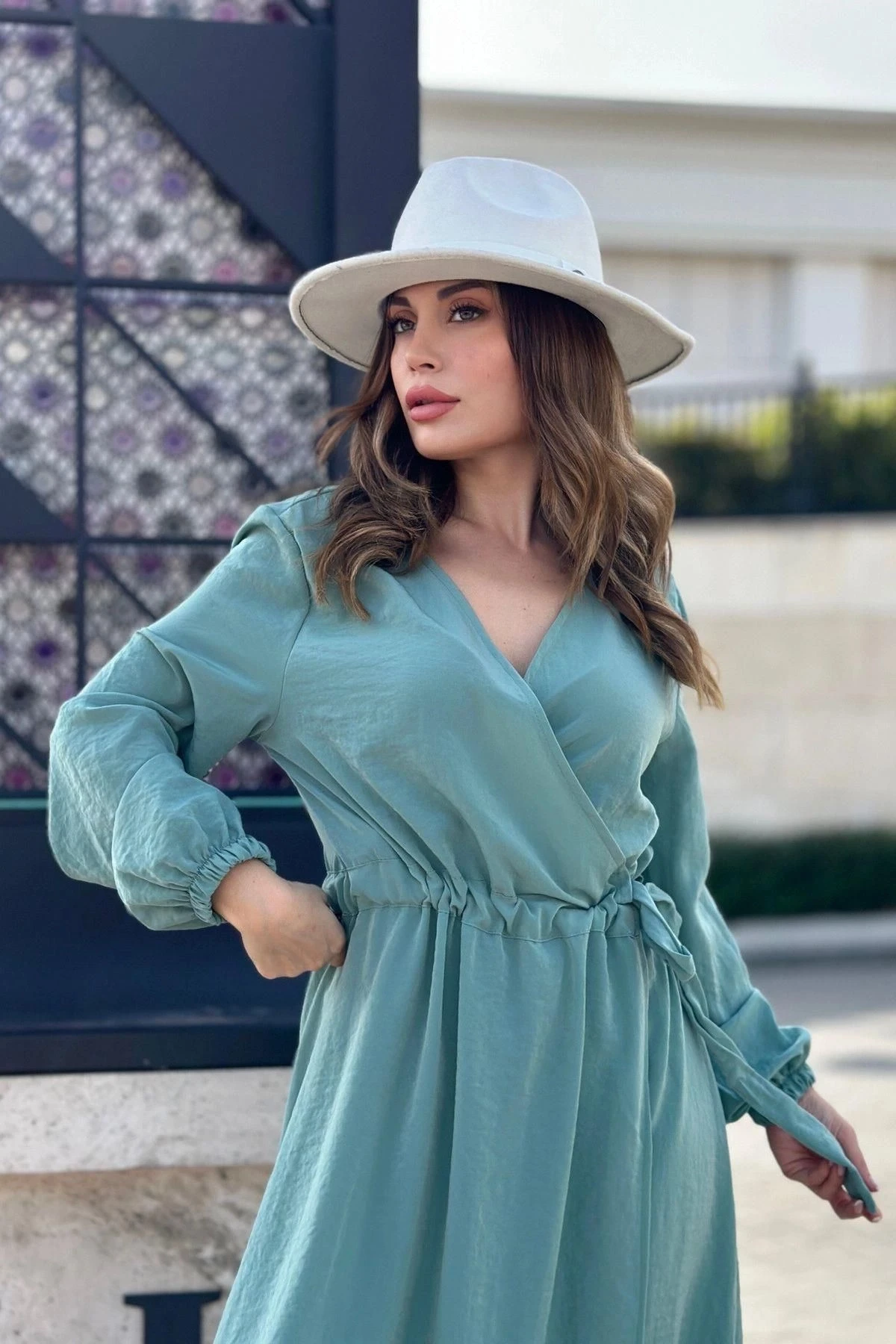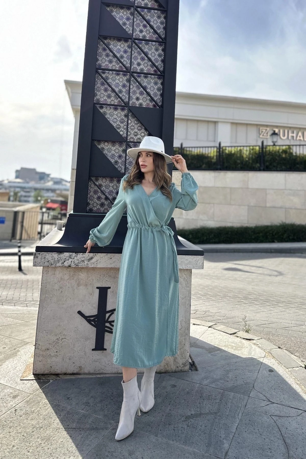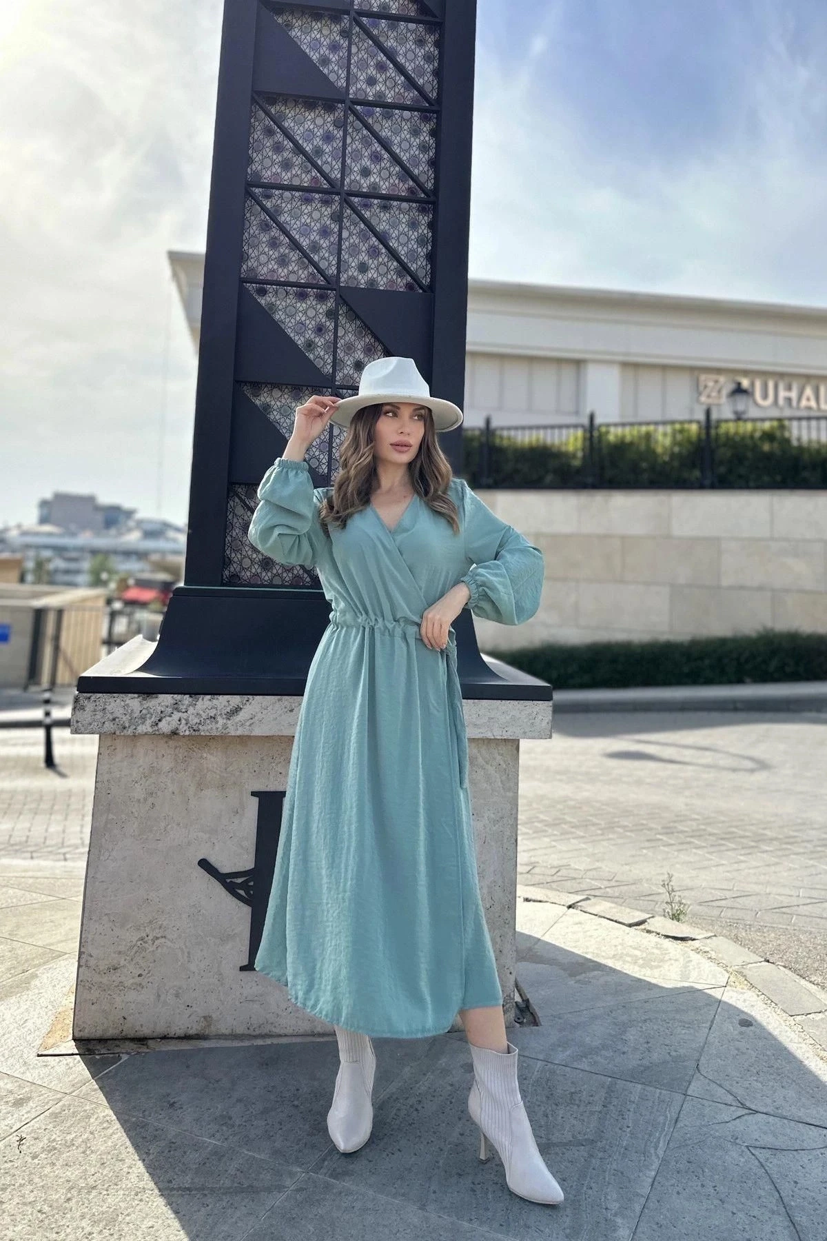 Kadın Mint Kruvaze Yaka, Yırtmaçlı, Beli Kuşaklı, Kol Bilekleri Lastikli, Salaş, Uzun Elbise