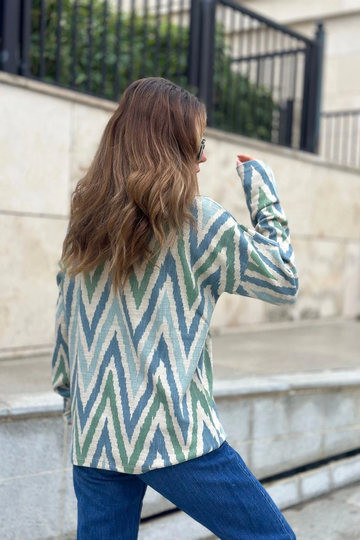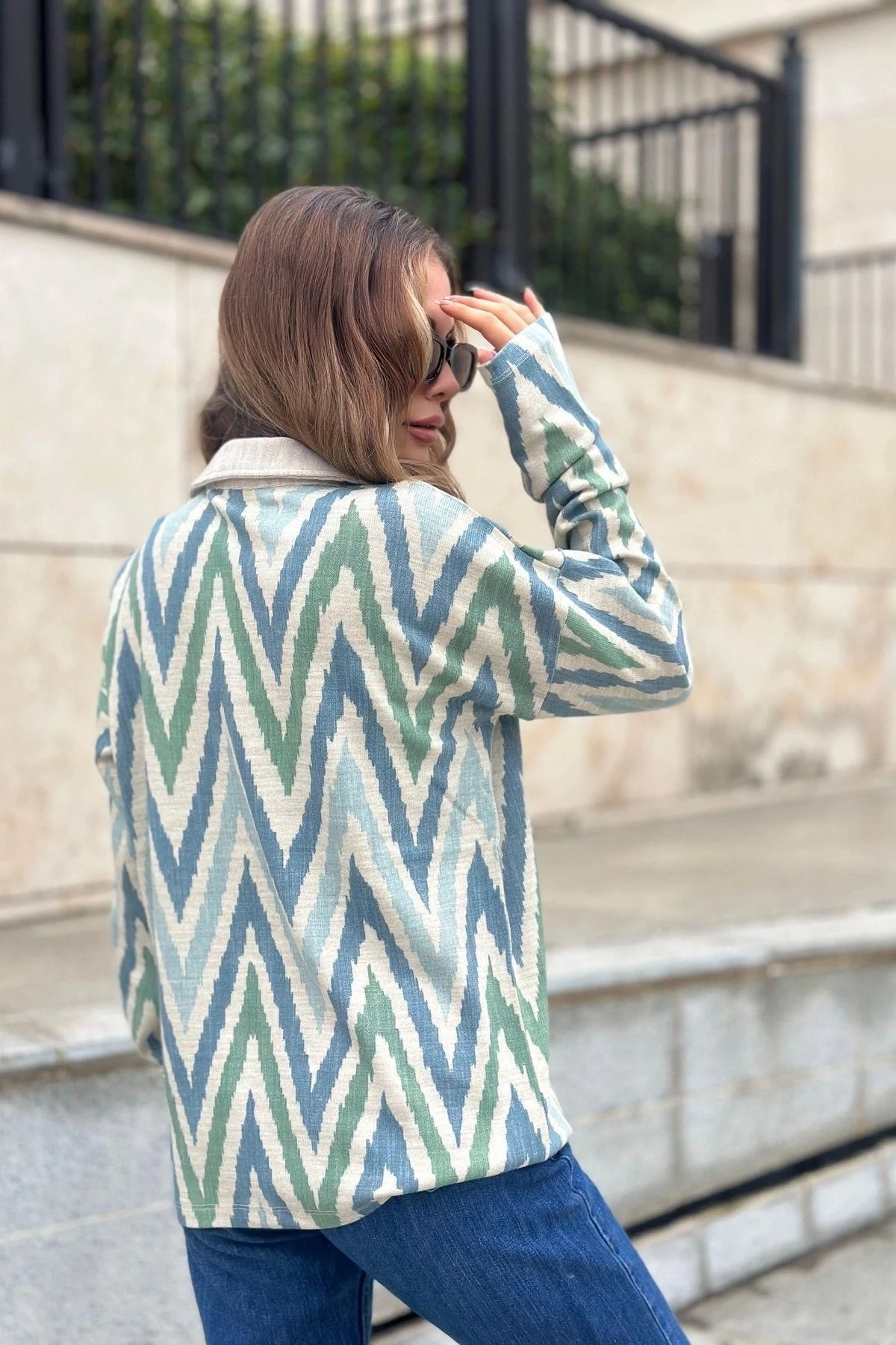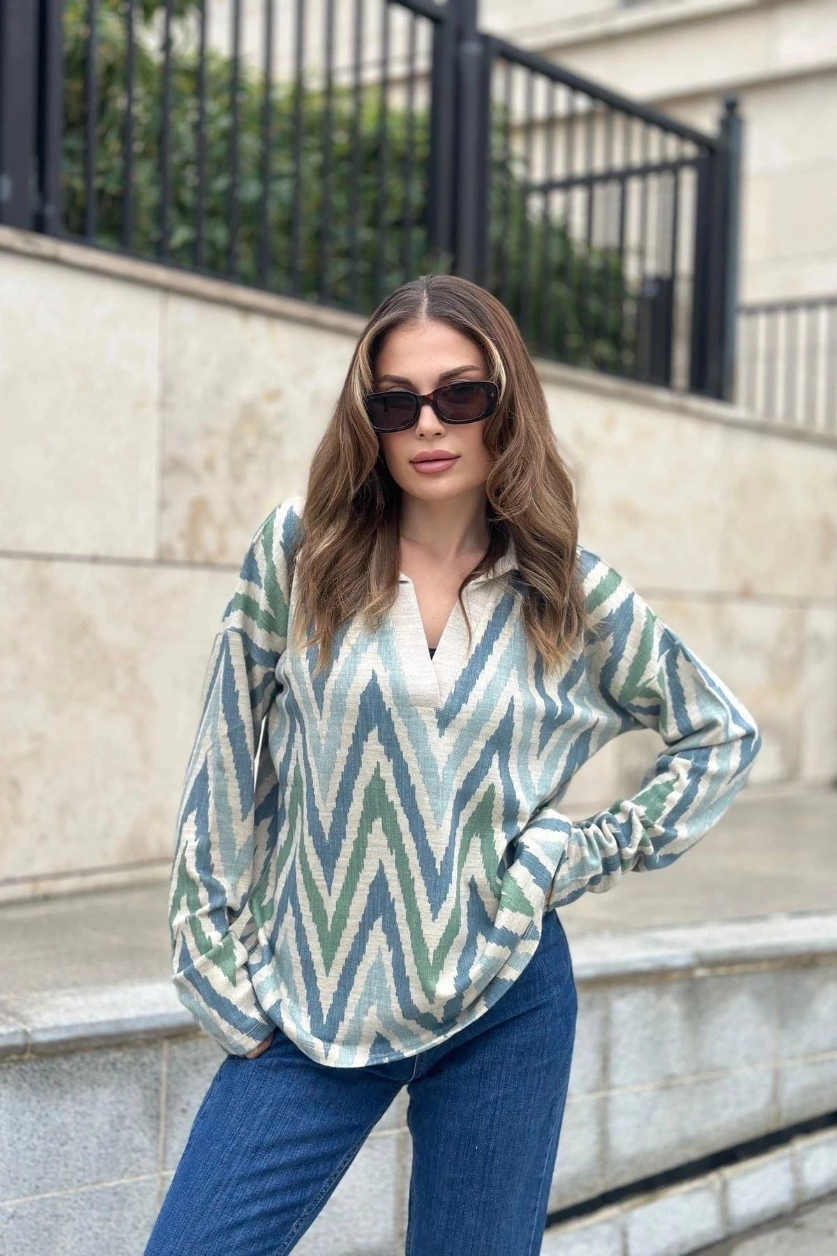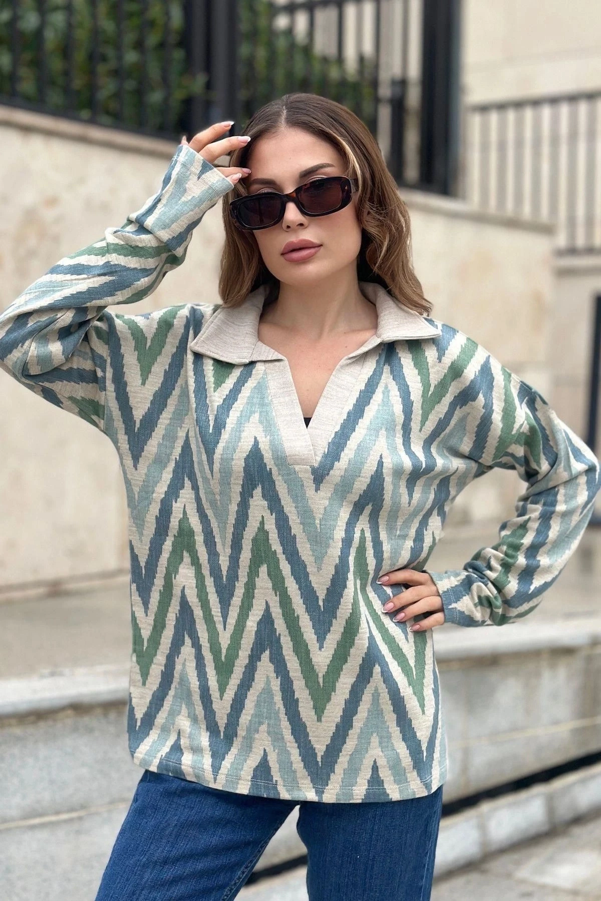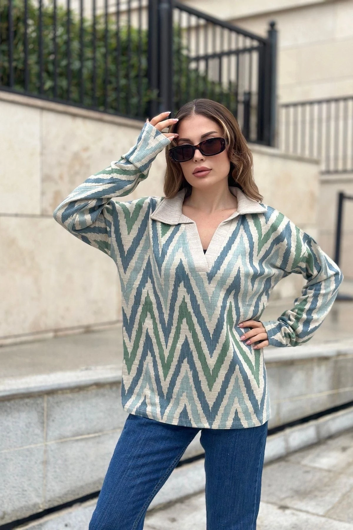 Kadın Mint & Mavi Polo Yaka, Uzun Kollu, Çizgili, Salaş Dokuma Bluz