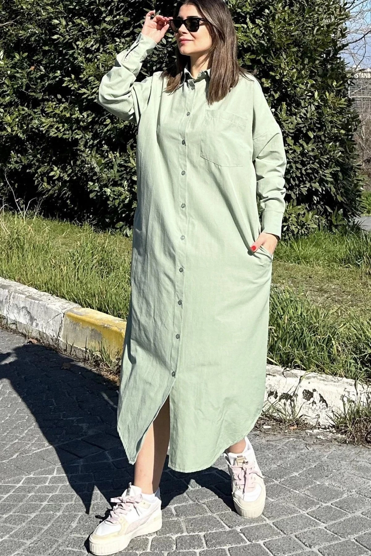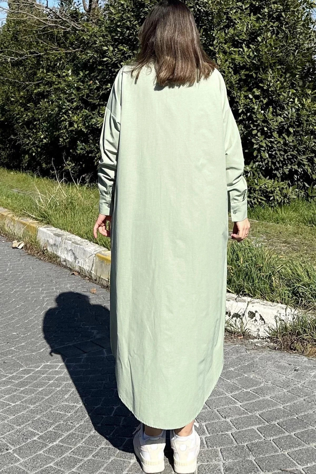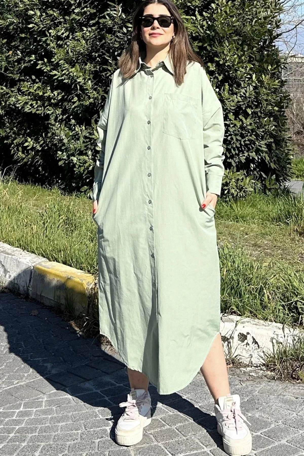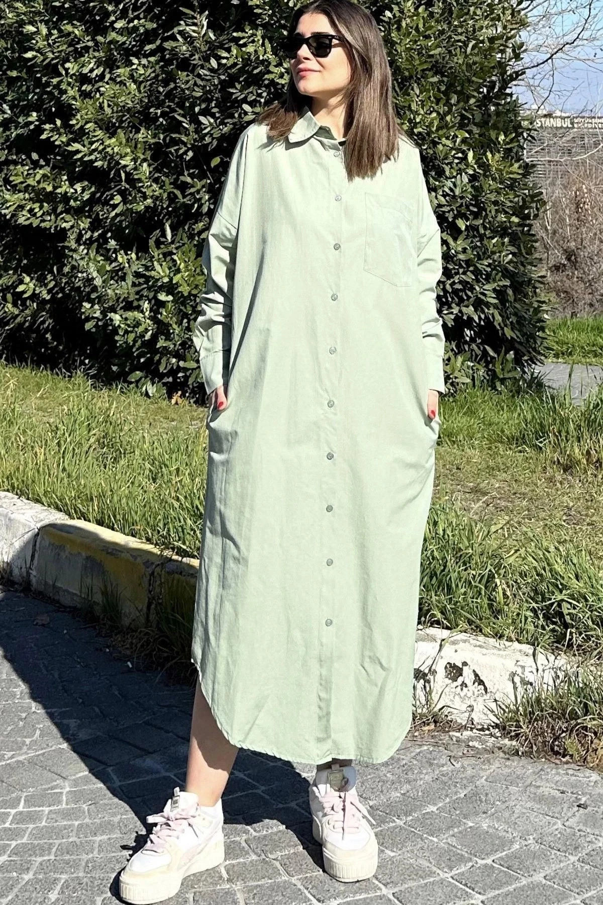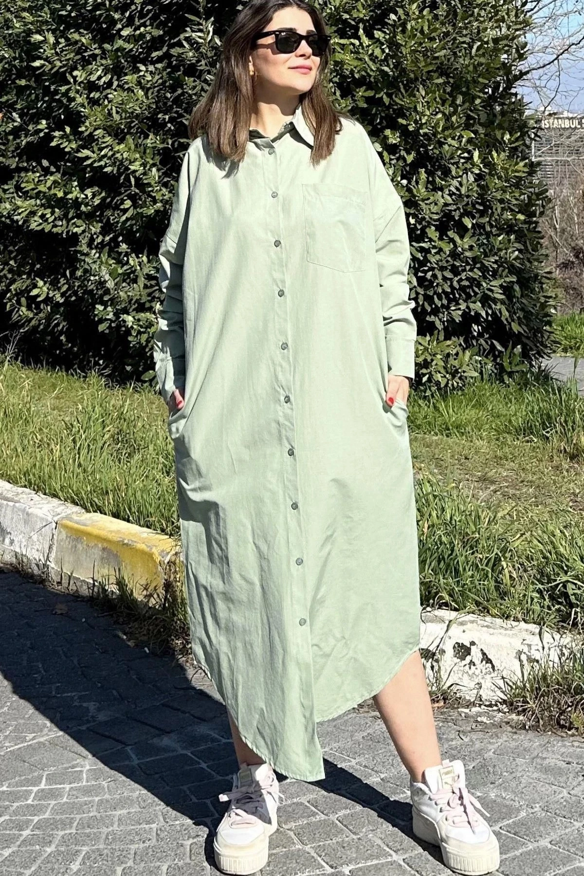 Kadın Mint Yeşil Uzun Kol, Eteği Oval Kesim, Uzun Ve Salaş, Poplin Gömlek Elbise