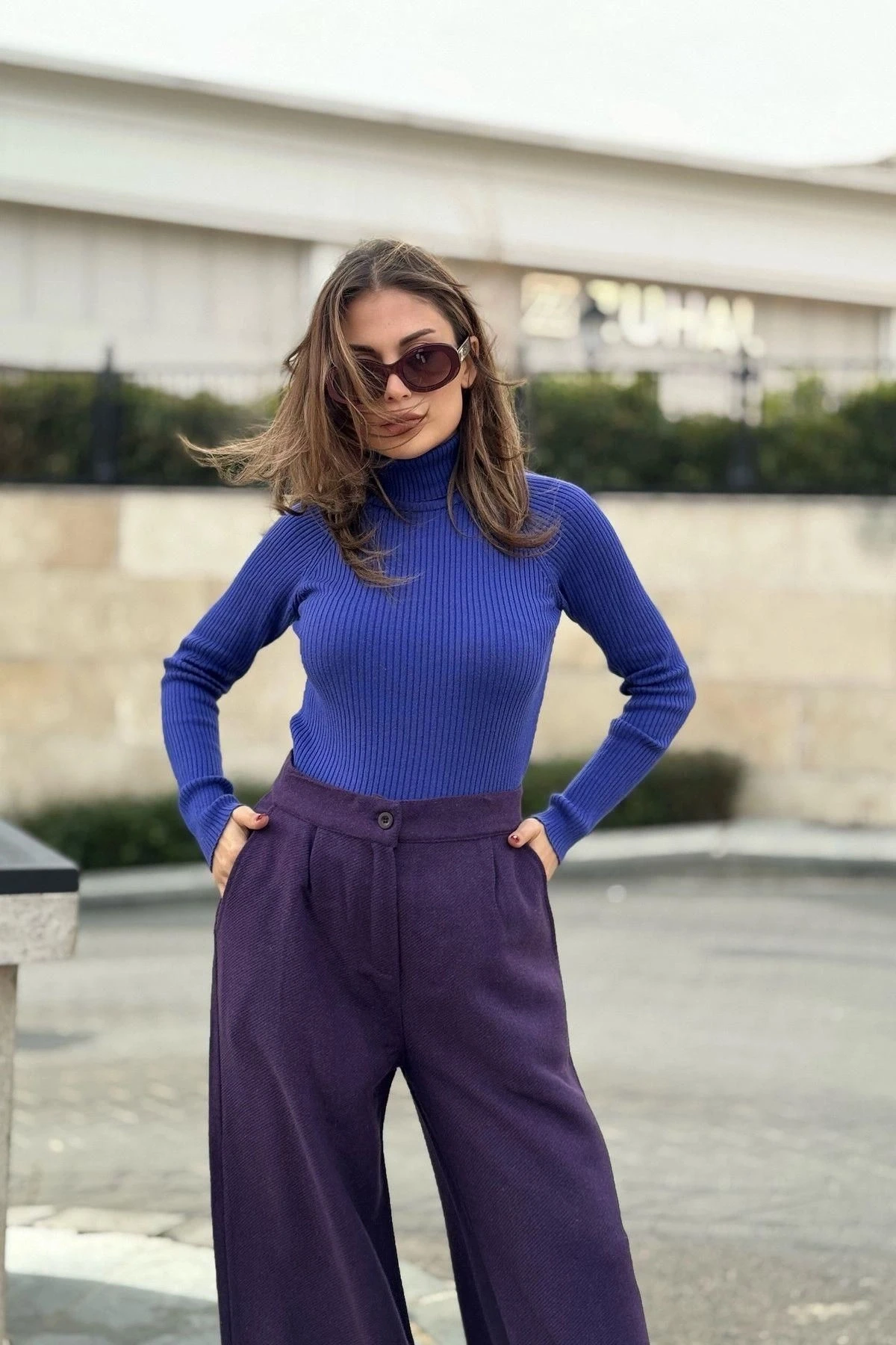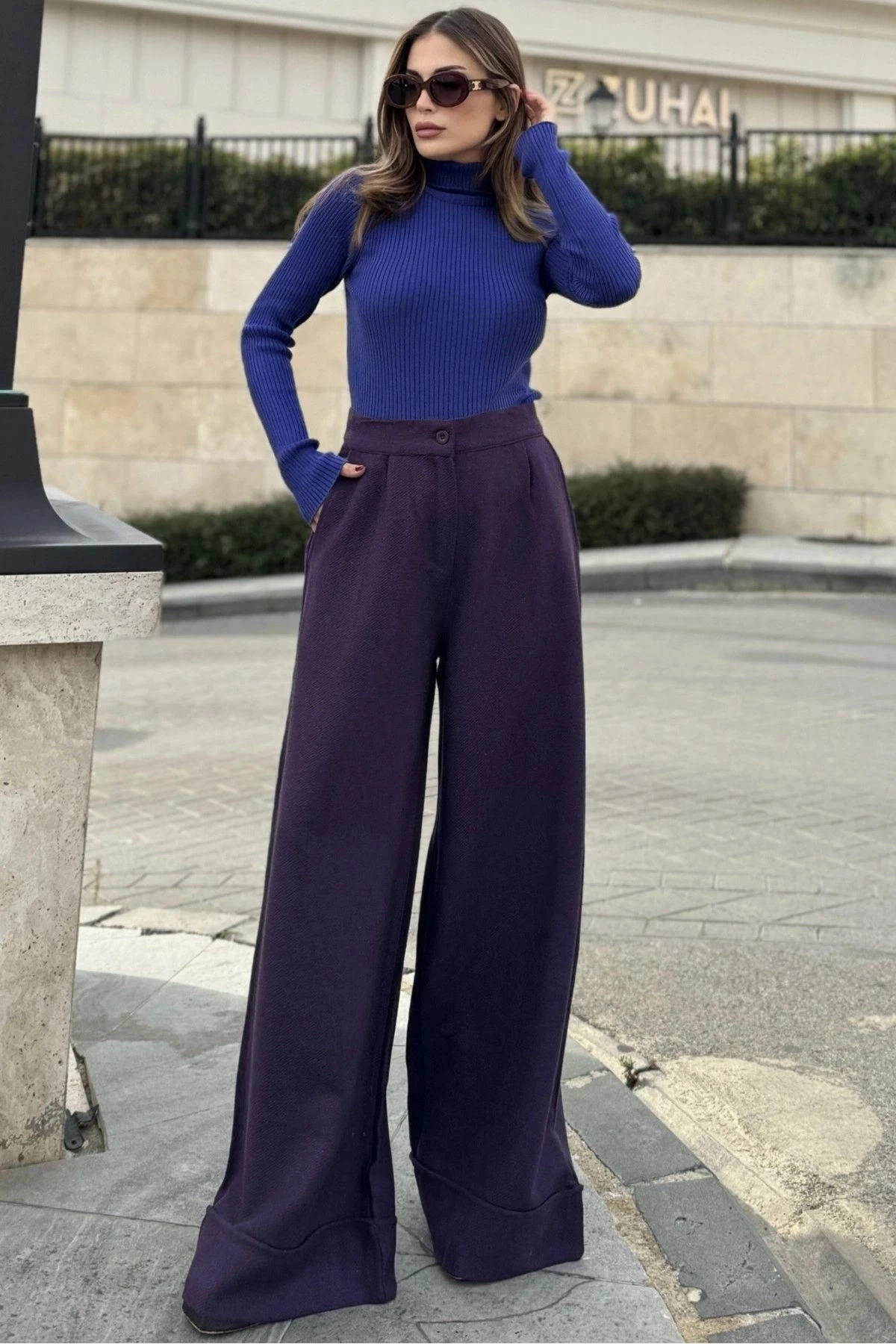 Kadın Mor Duble Paça, Beli Pliseli, Fitilli Kaşe Kumaş, İspanyol Pantolon