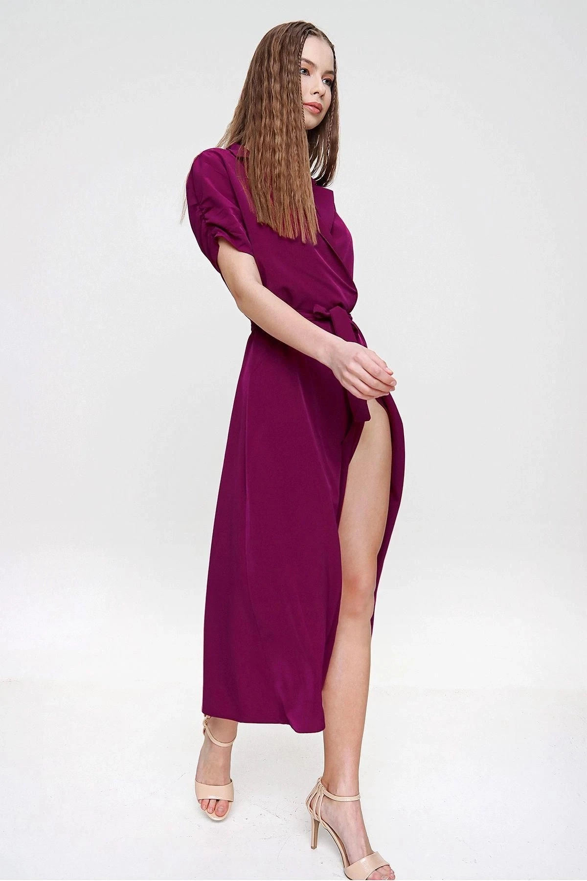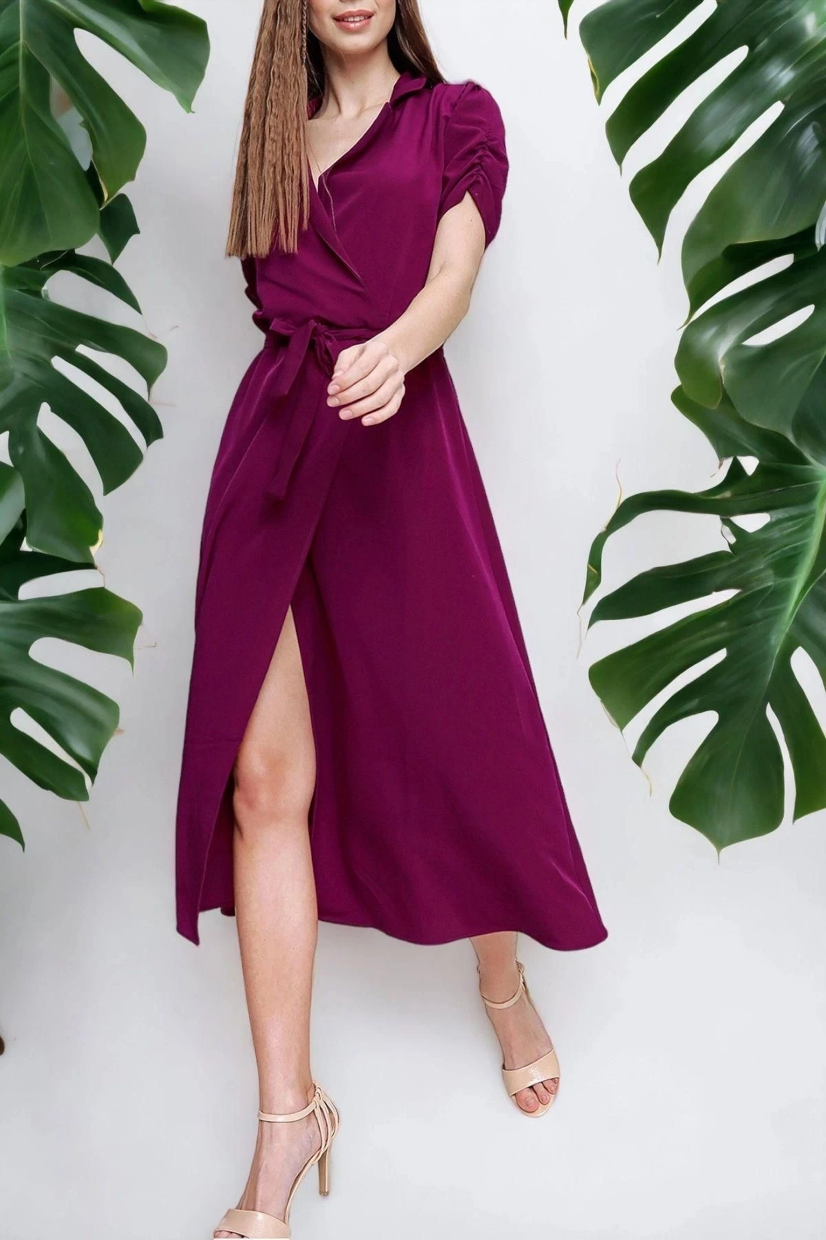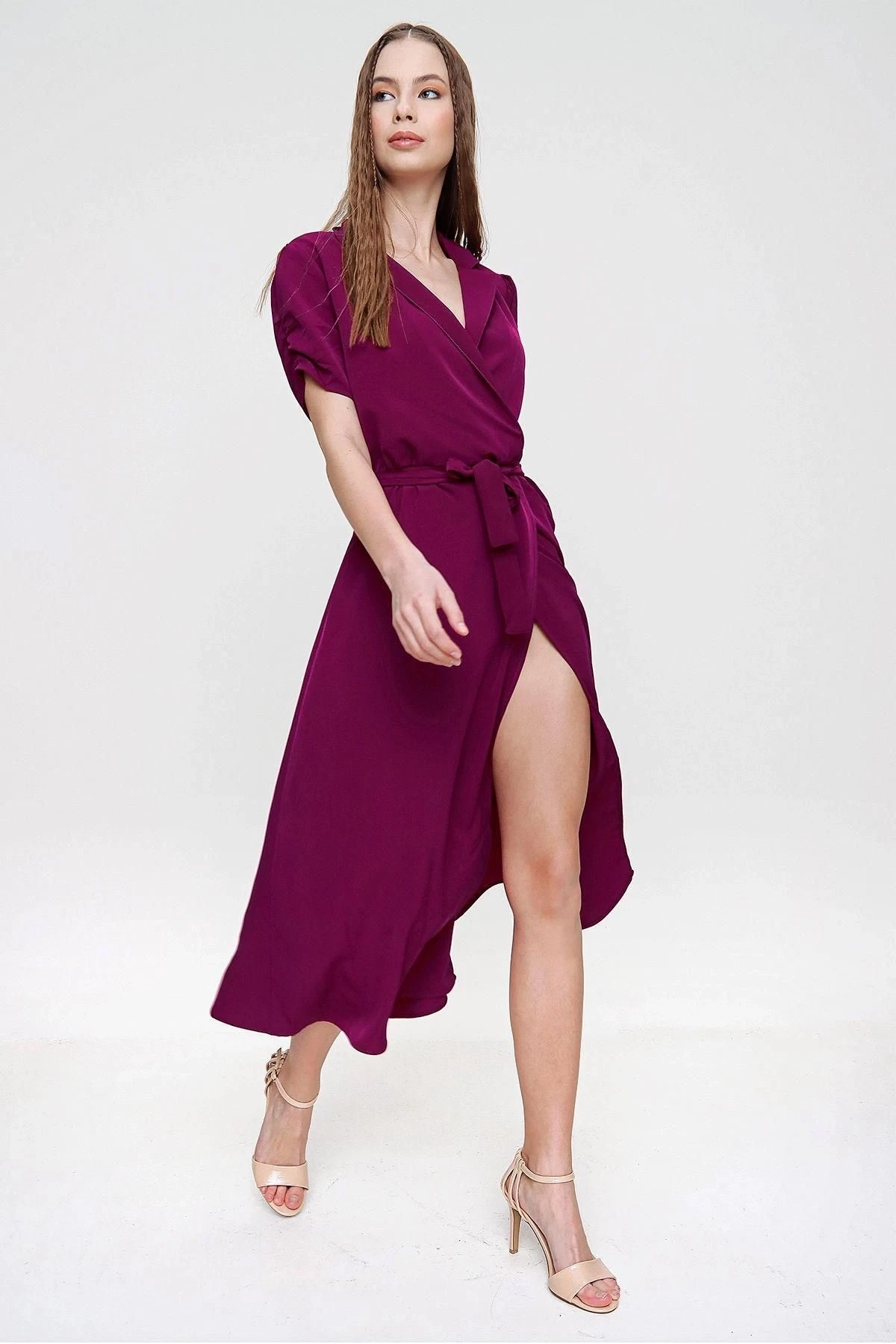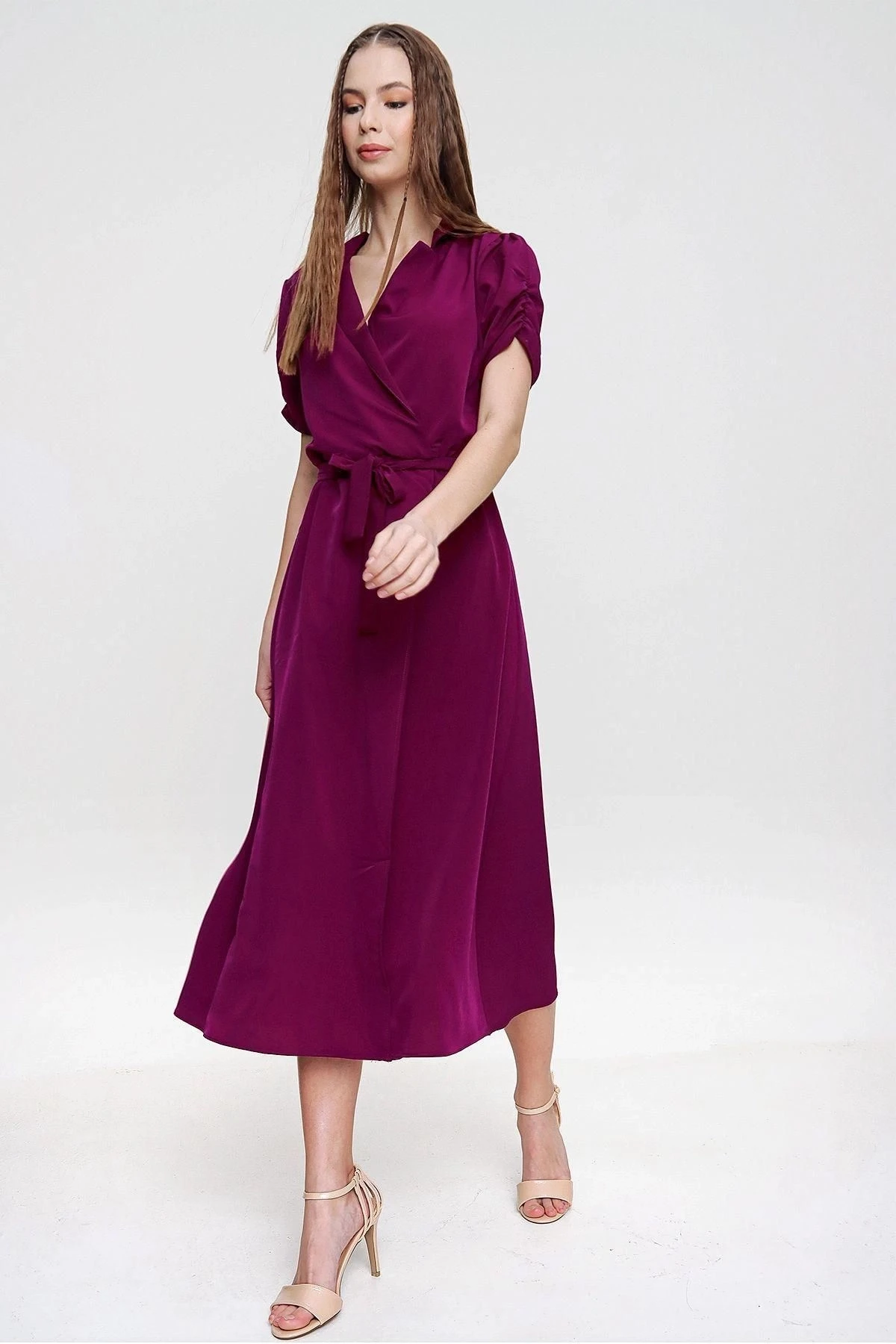 Bu özel tasarım kruvaze yaka kısa kollu elbise, zarafetiyle herkesin dikkatini çekecek.; Maksi boyuyla modern bir görünüm sunarken, omuz detayları ve kemer ayrıntısıyla da tarzınızı tamamlar.; Elbisenin kumaşı %60 polyester ve %40 pamuktan oluşur, böylece dayanıklılığı ve yumuşak dokusuyla size konfor sağlar.; Polyester, uzun süreli kullanıma dayanıklılık katarken, pamuk cildinizi rahat ve nefes alabilen bir şekilde sarar.; Bu kombinasyon, elbisenin kalitesini ve uzun ömürlülüğünü garanti eder.; Renk olarak, bu elbise birçok stile uyum sağlayabilecek olan mor tonlarında tasarlanmıştır.; Zerafeti ve stil sahibi görünümüyle öne çıkan bu renk, her mevsimde giyilebilir ve farklı aksesuarlarla kolayca tamamlanabilir.; Bu elbisenin kalıbı düzenli kesimlidir, böylece vücudunuza mükemmel bir uyum sağlar ve her bedene uygun olabilir.; Kruvaze yaka tasarımı, şıklığı ve feminen bir hava katarken, kısa kollu yapısı yaz aylarında serin ve rahat hissetmenizi sağlar.; Bu elbise, günlük hayatta veya özel bir etkinlikte rahatlıkla kullanabileceğiniz çok yönlü bir parçadır.; Tarzınızı yansıtmak için farklı aksesuarlarla kombinleyebilir veya kendi başına şık bir seçenek olarak tercih edebilirsiniz.; Göz alıcı tasarımı ve kaliteli kumaşıyla bu kruvaze yaka kısa kollu elbise, gardırobunuzun vazgeçilmez parçalarından biri olacak.; Her adımda zarafetinizi sergilemeniz için ideal bir seçenektir.
