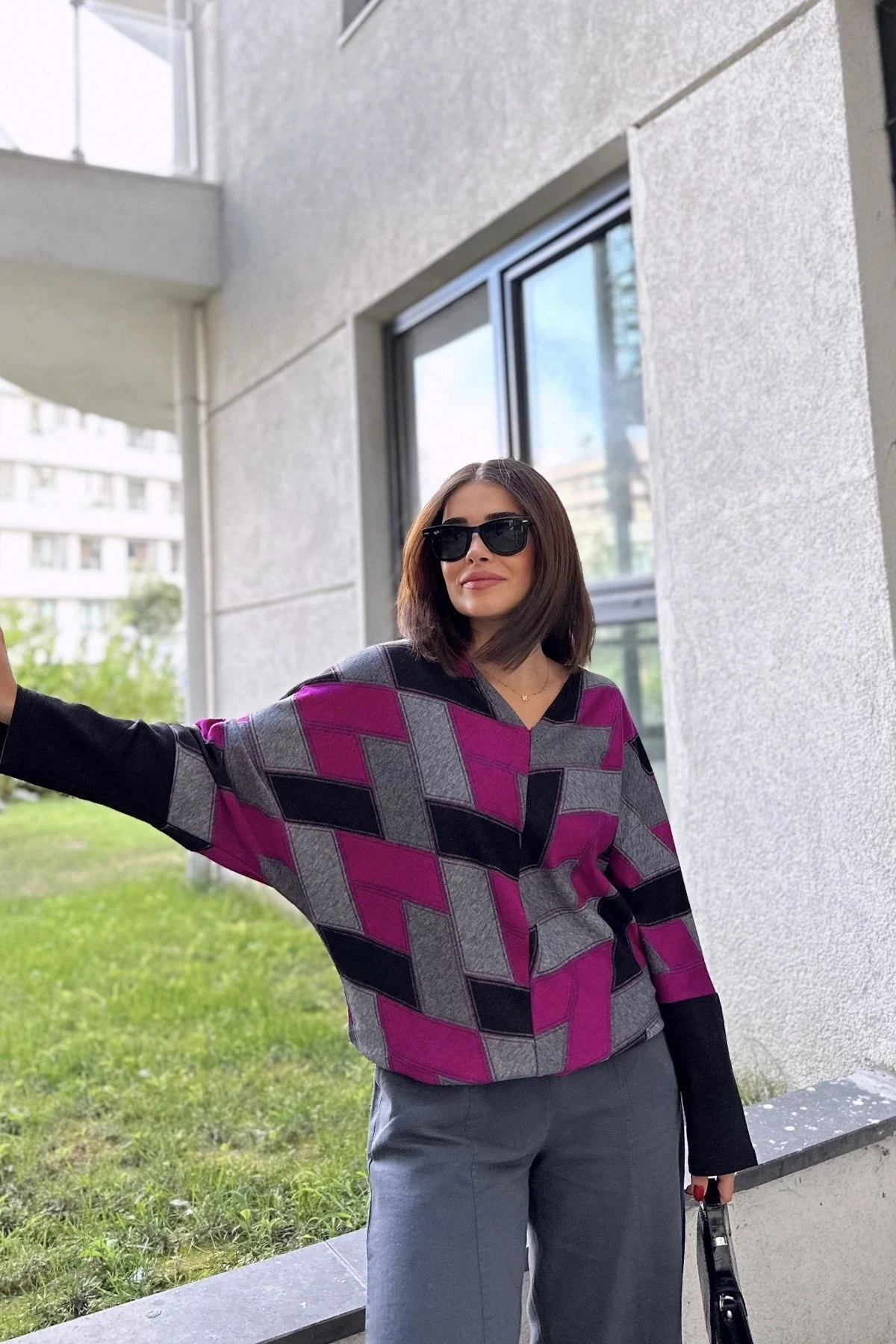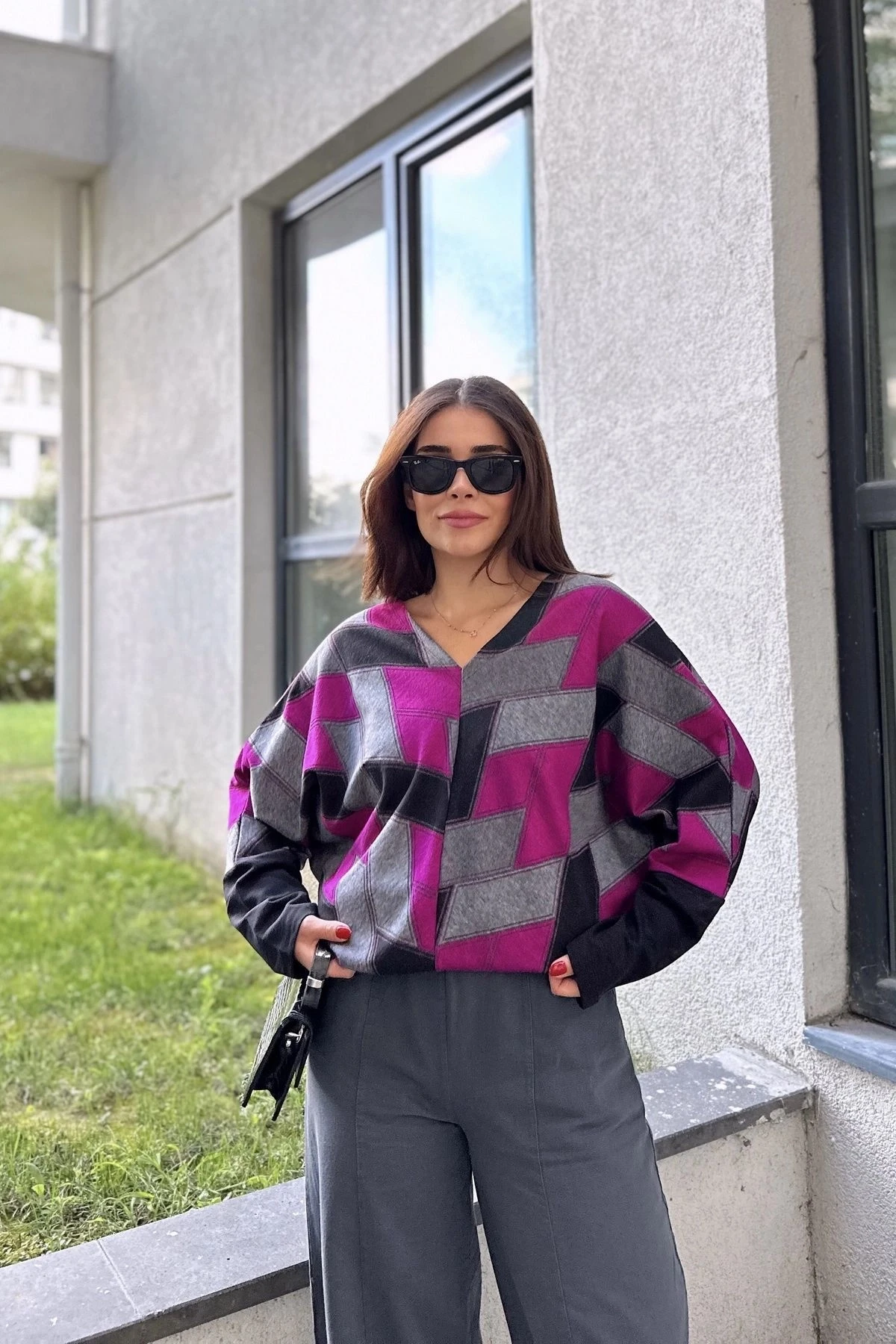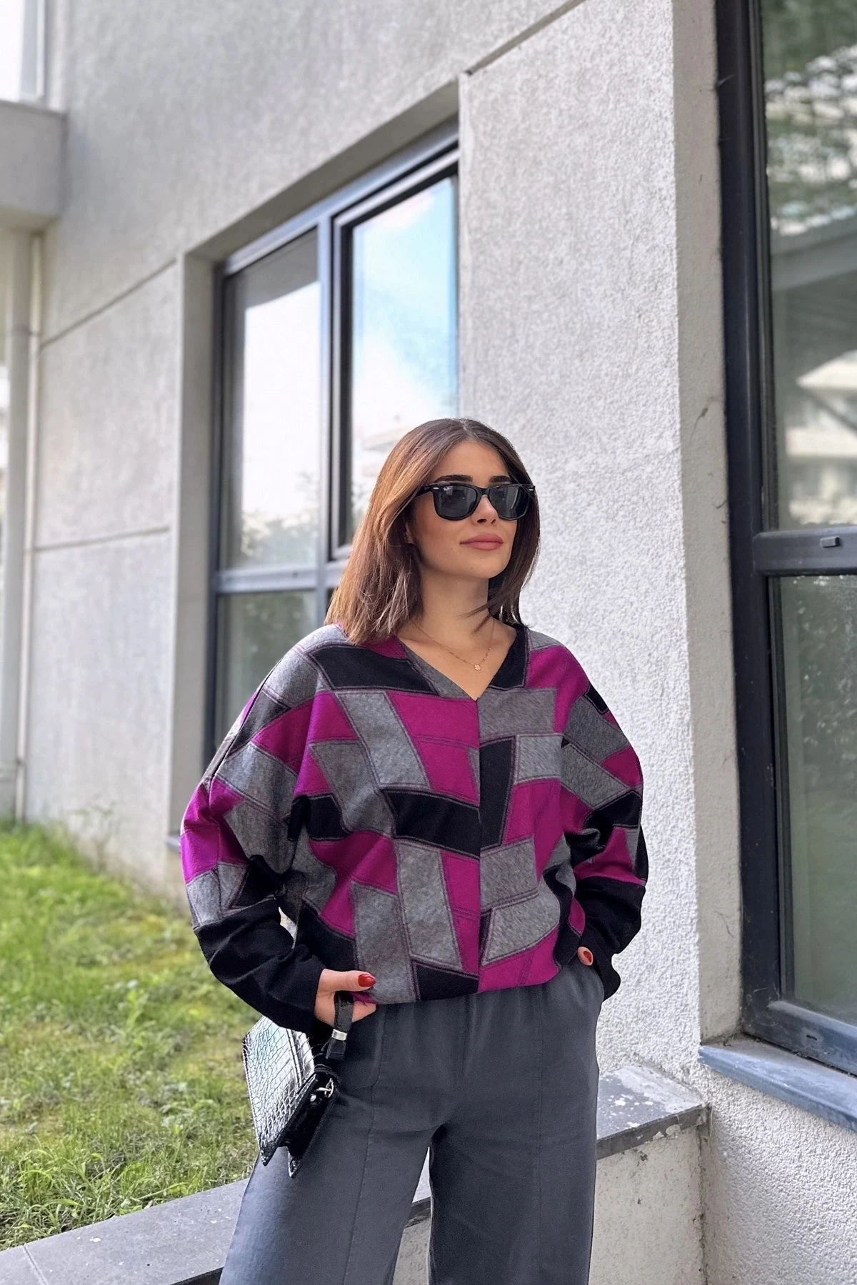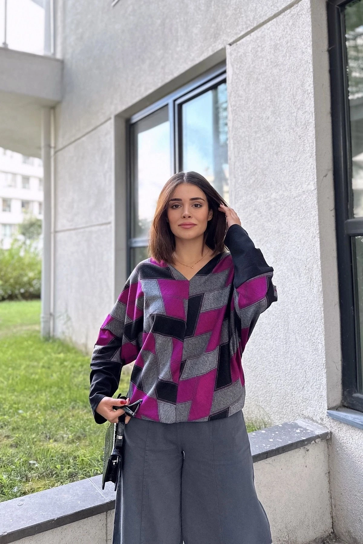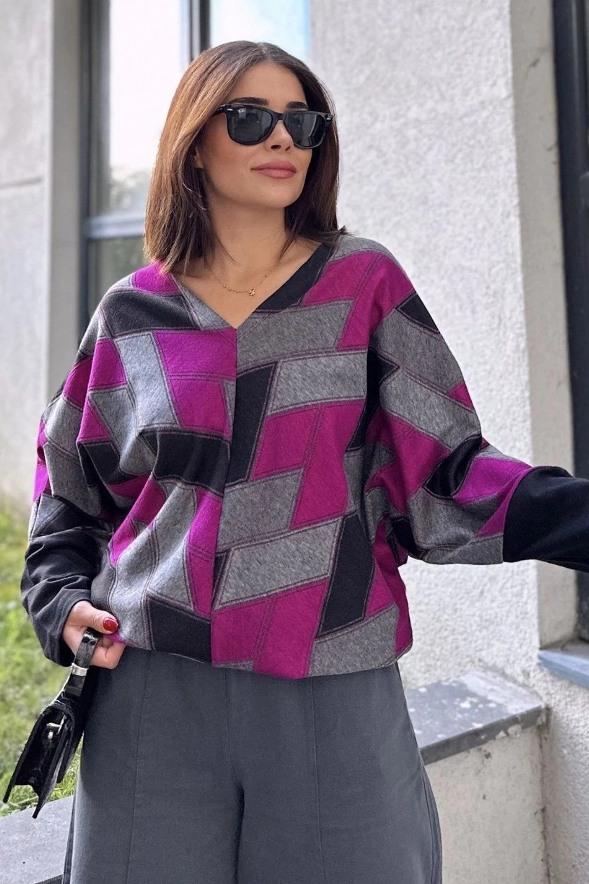 Kadın Mor & Siyah V Yaka Geometric Desen, Color Block Yarasa Kol Kazak & Bluz