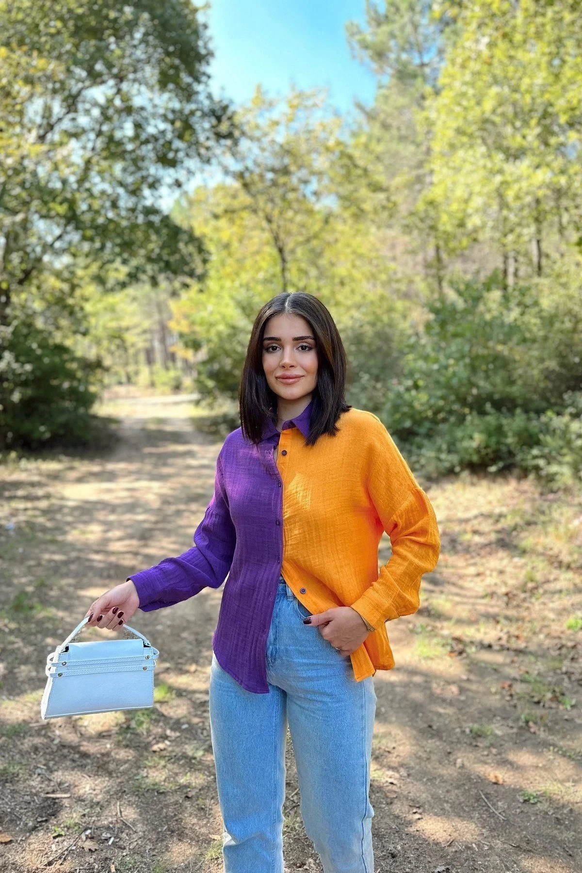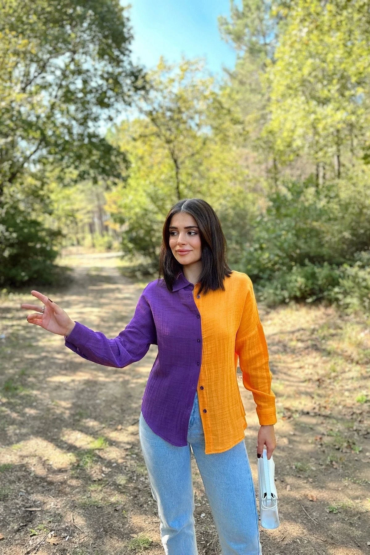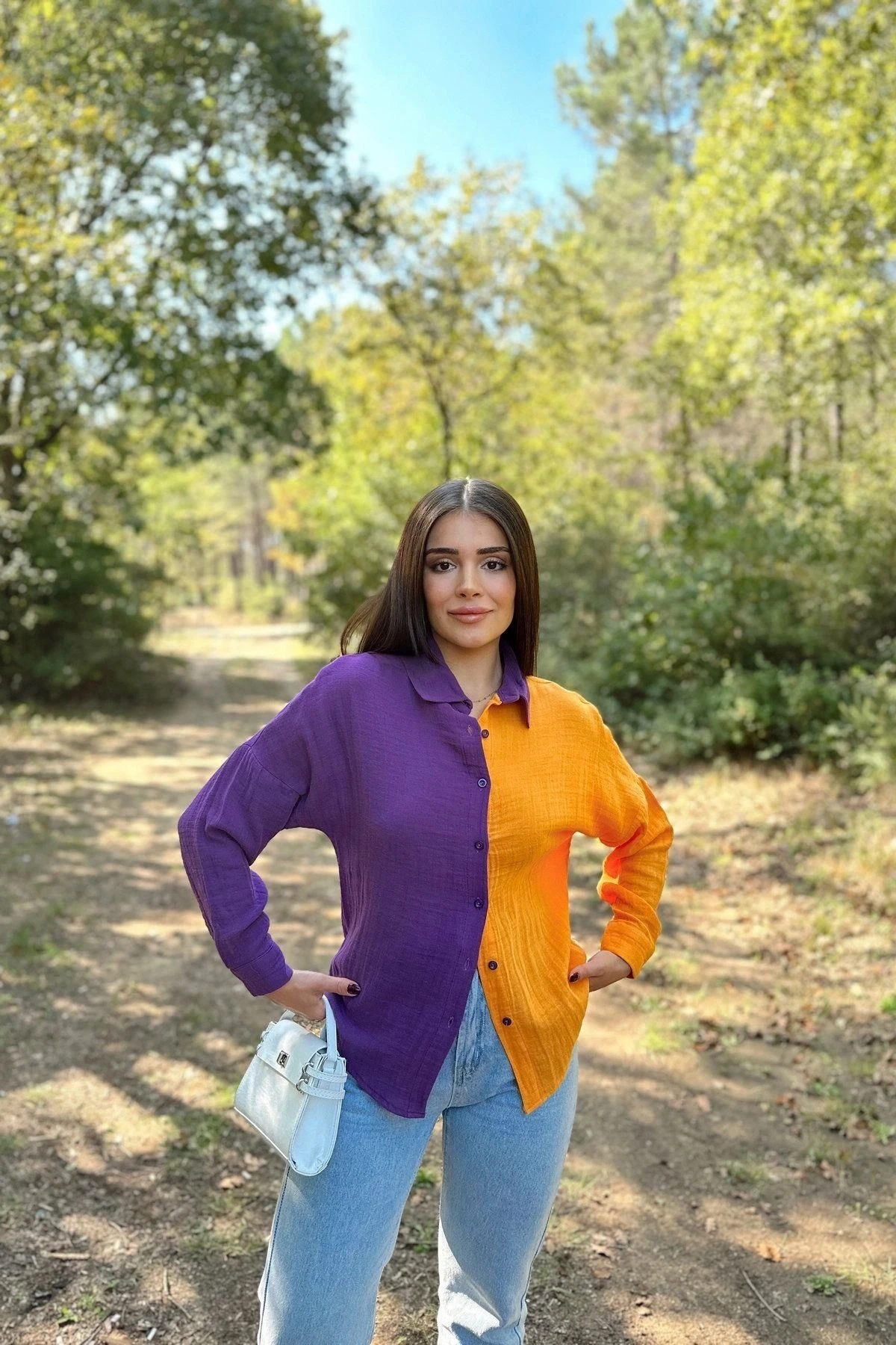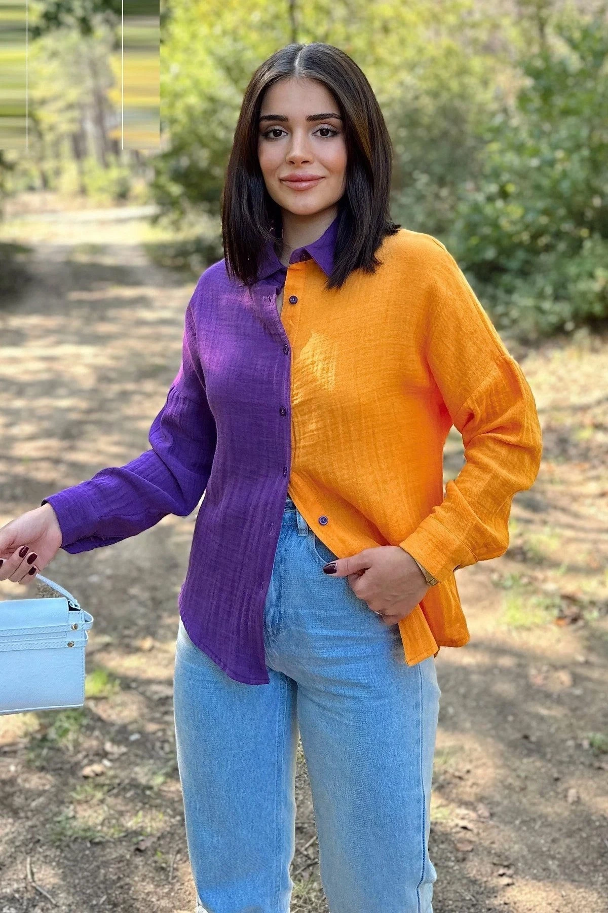 Kadın Mor & Turuncu Muslin Kumaş, Çift Bloklu, Eteği Oval, Uzun Kol, Regular Kesim Gömlek