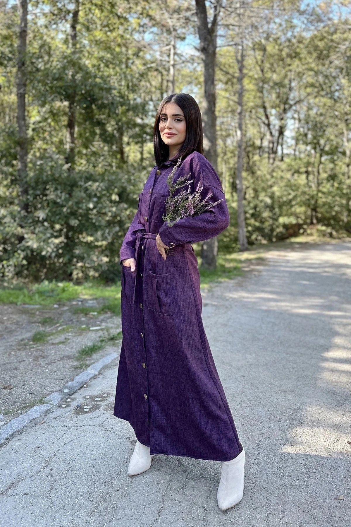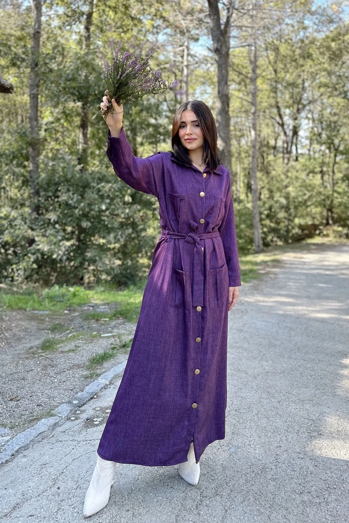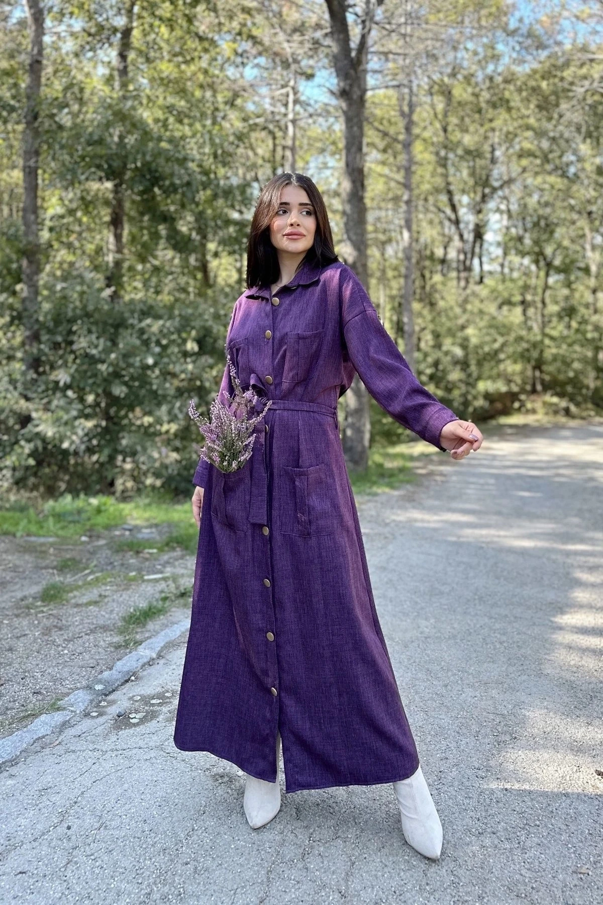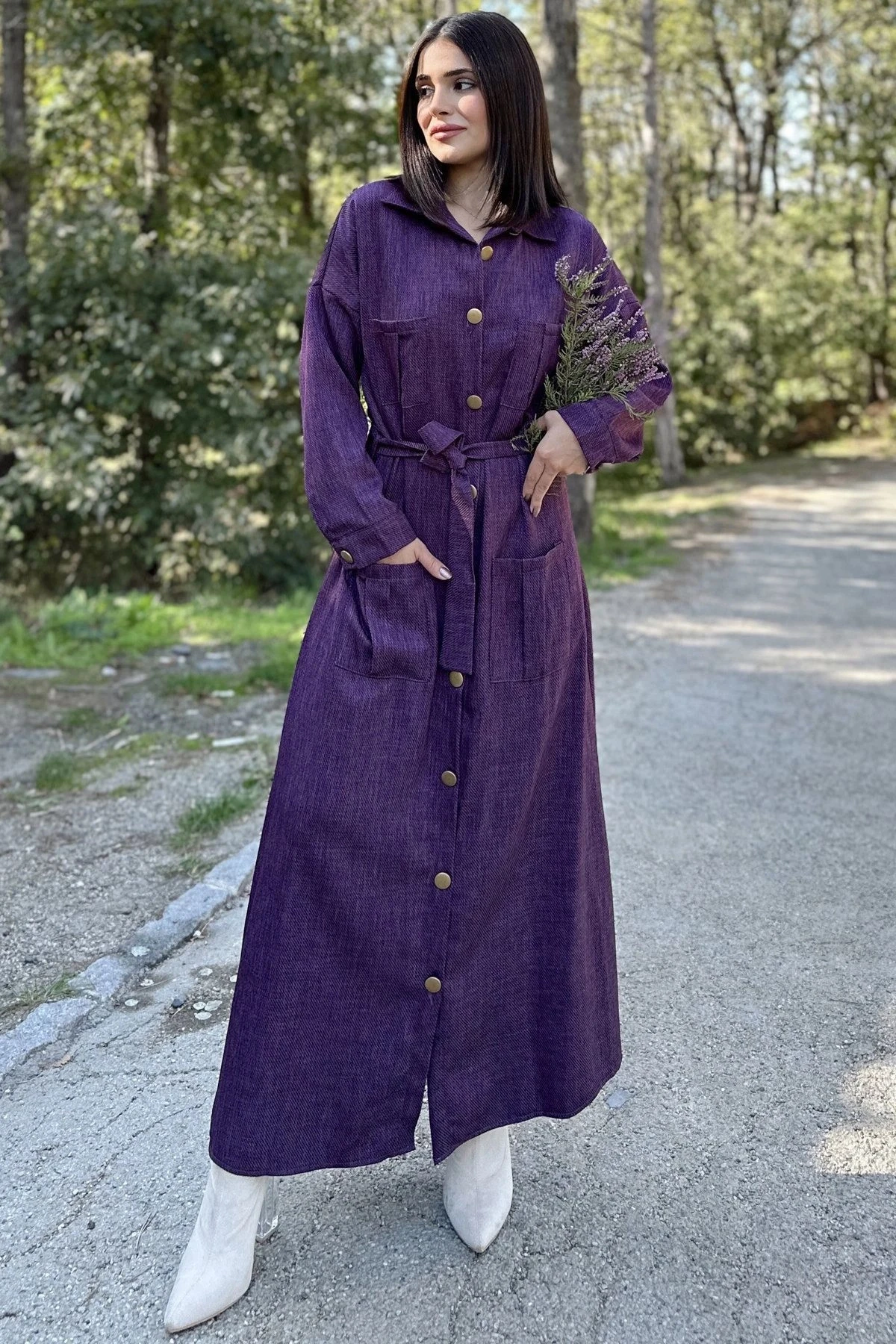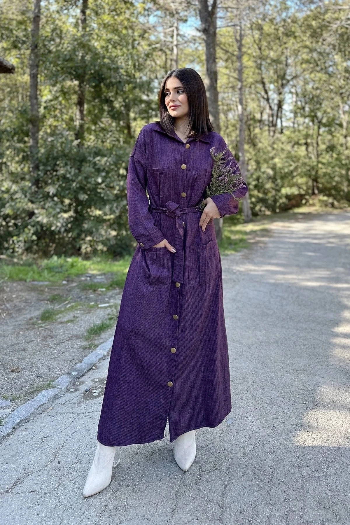 Kadın Mor Uzun Kol, Rahat Beli Kemerli, 4 Cepli, Gabardin Keten, Maksi Gömlek Elbise