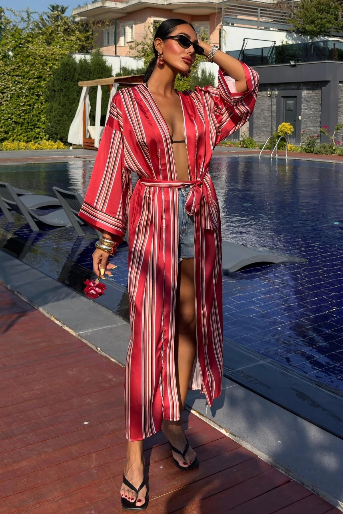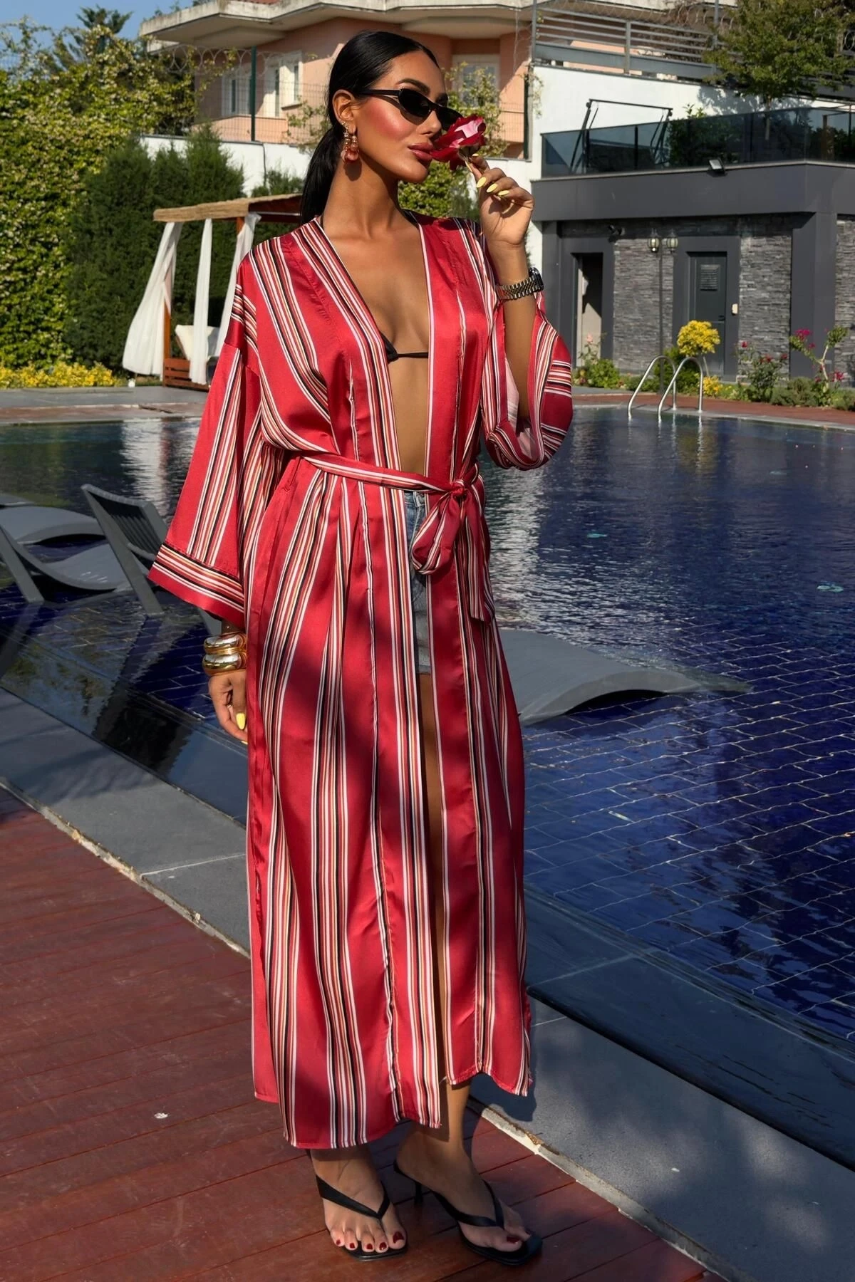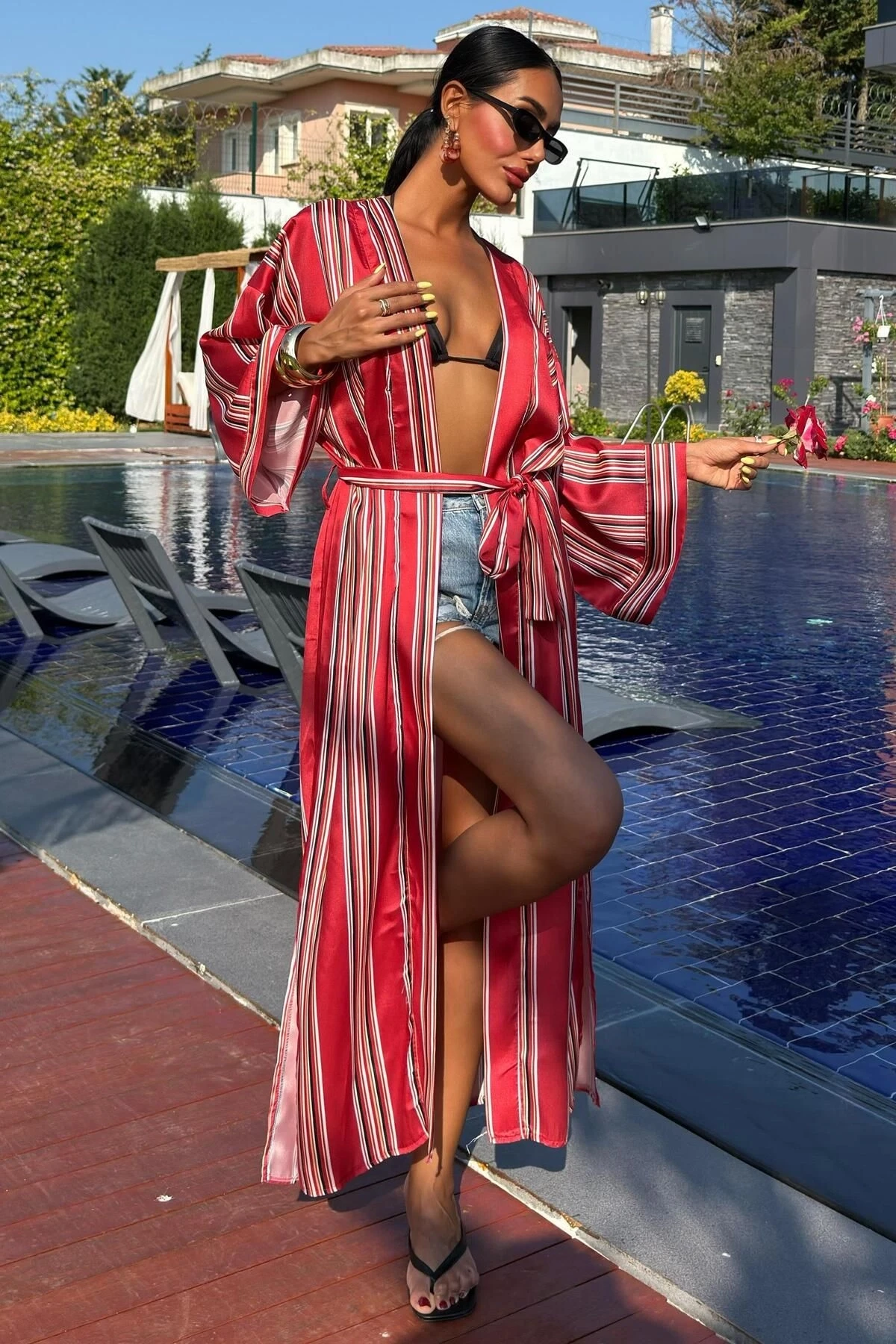 Kadın Multi Kruvaze Çizgili Uzun Dokuma Kimono