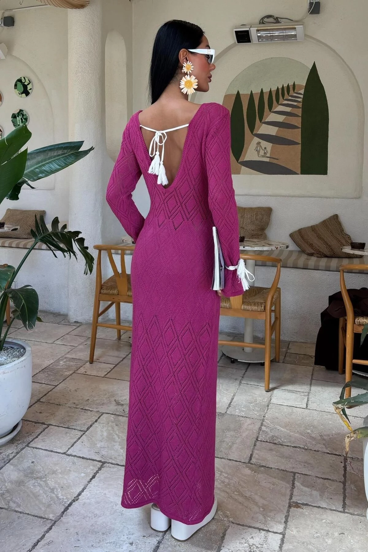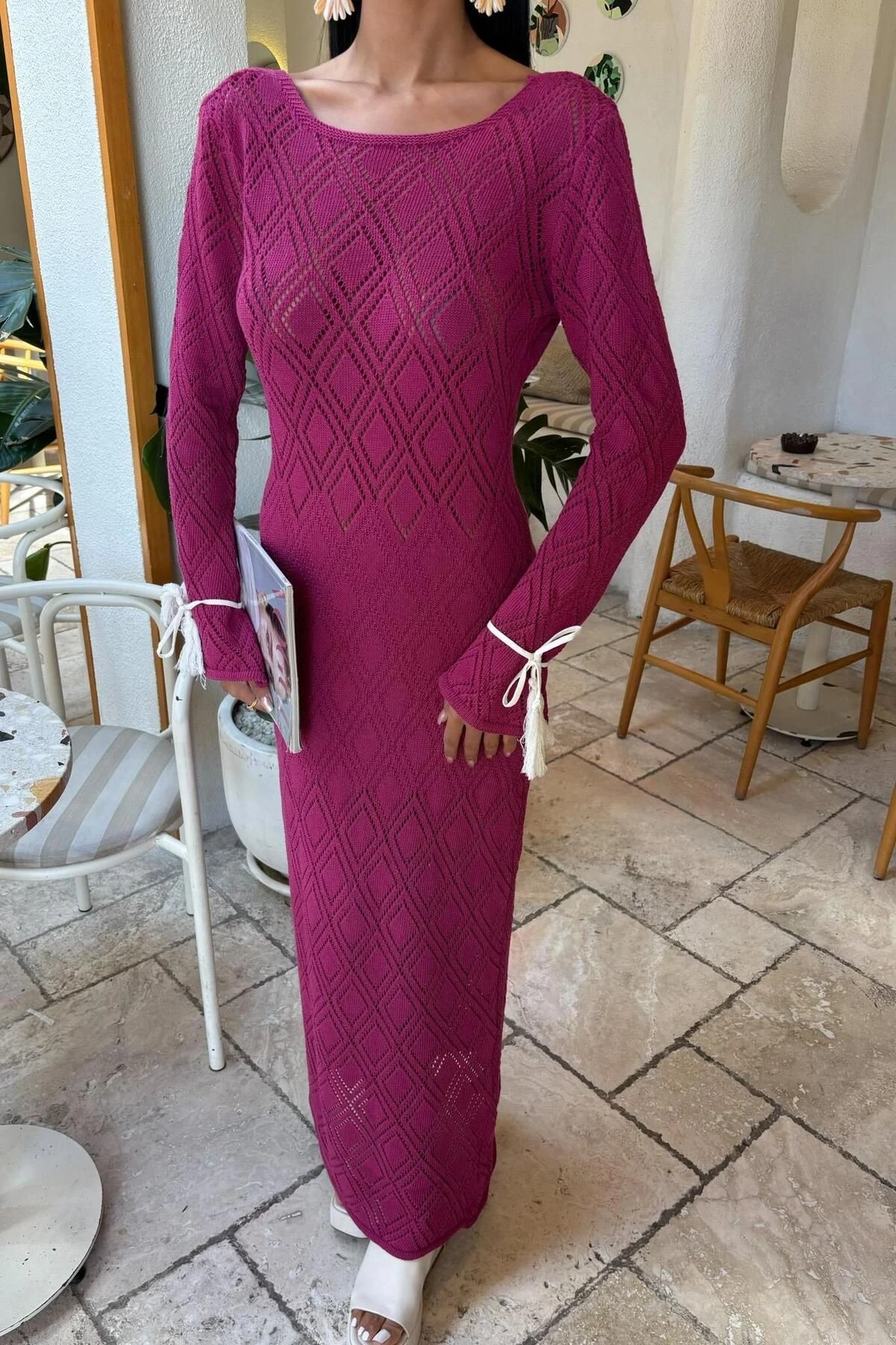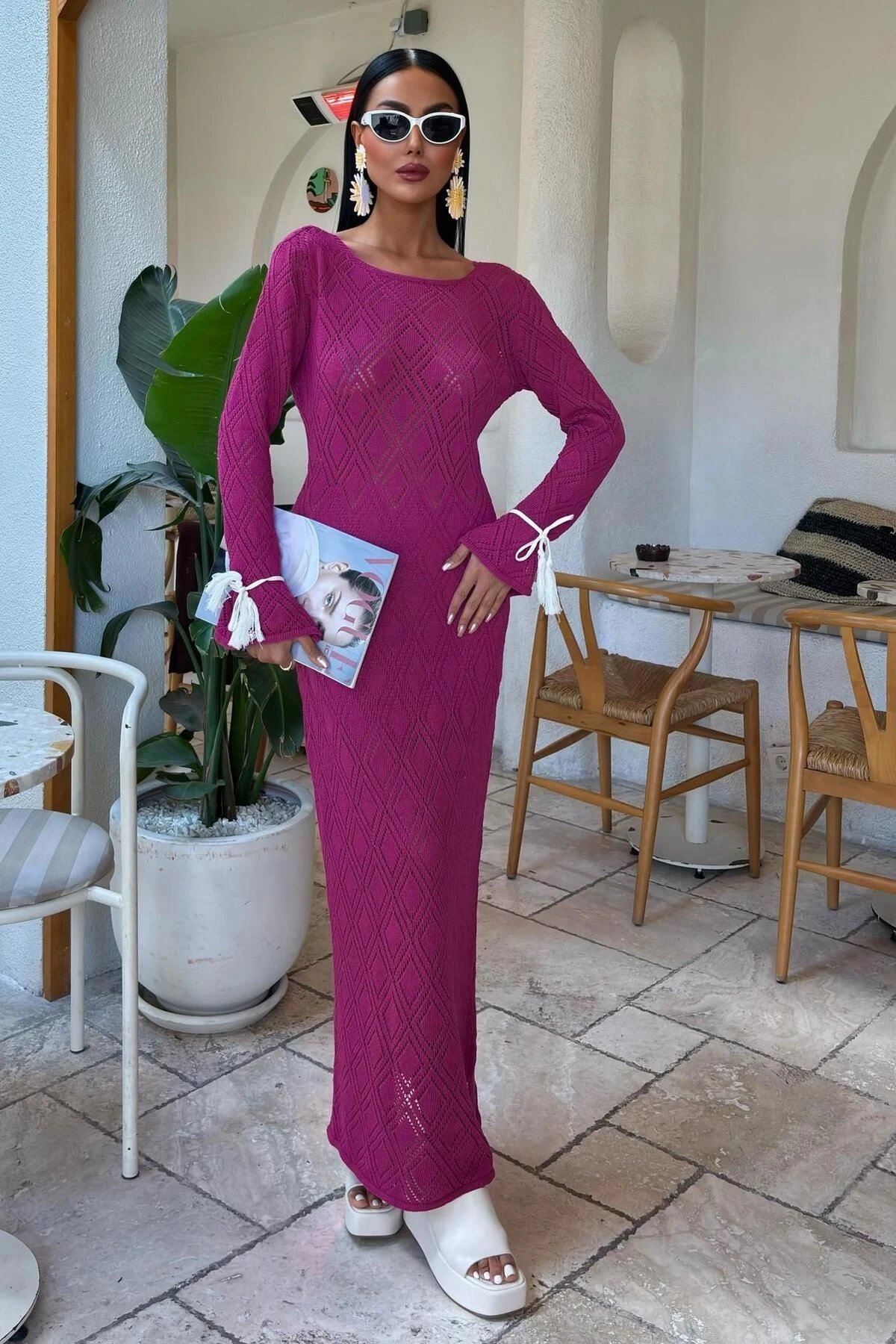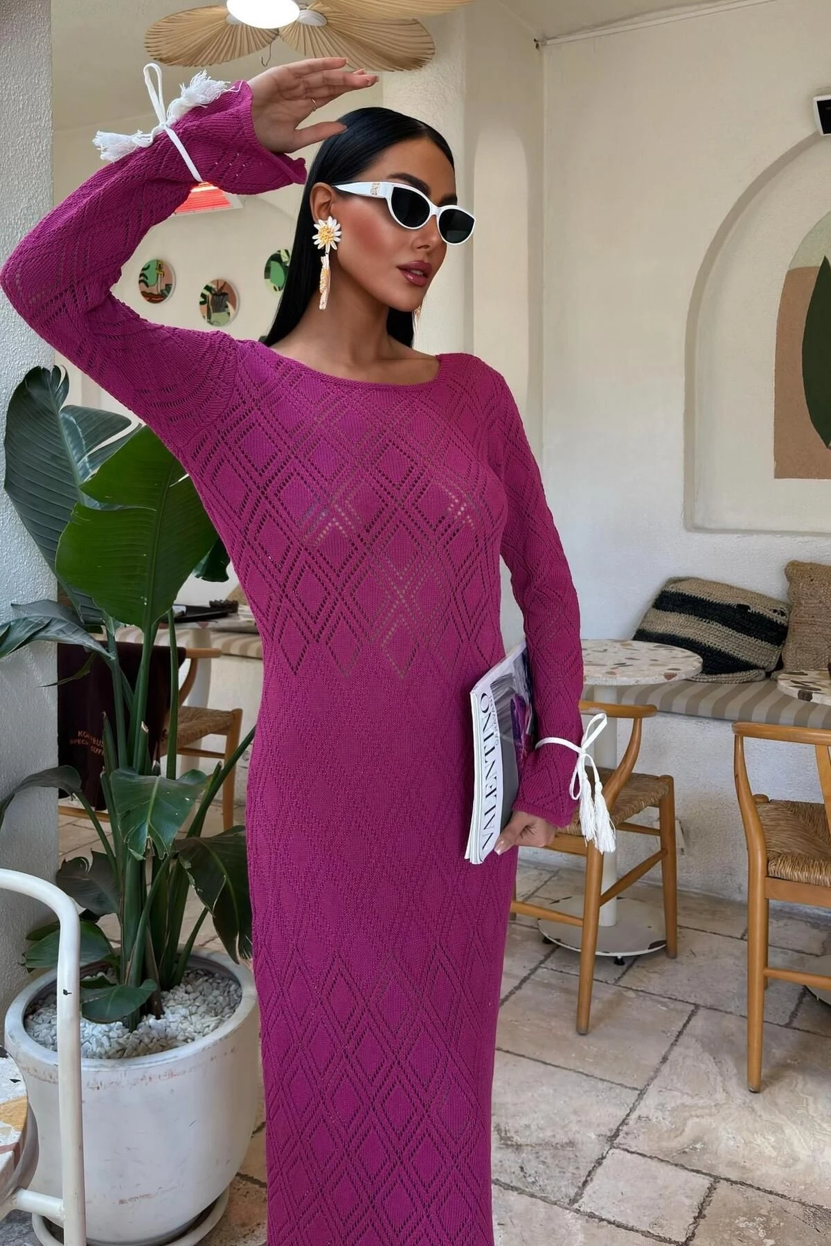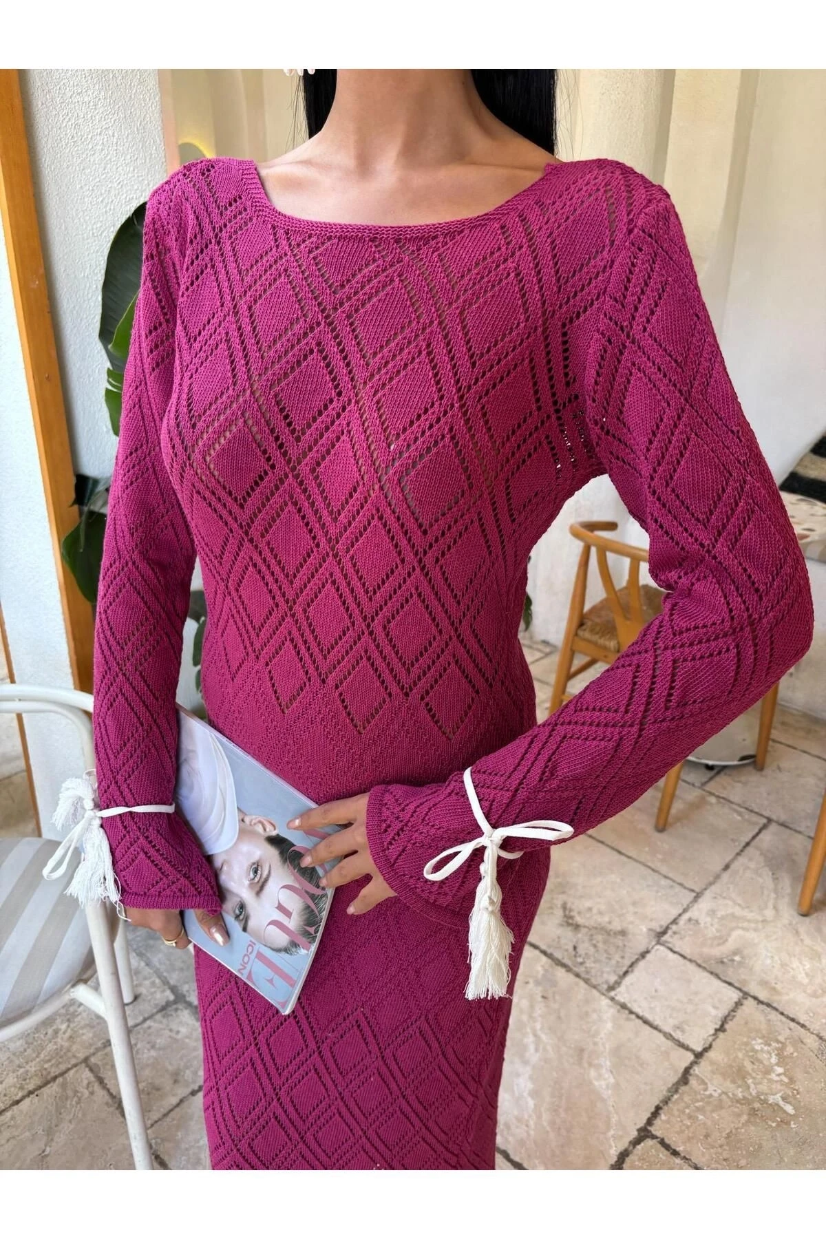 Kadın Mürdüm Ajurlu Örme Uzun V Yaka Elbise
