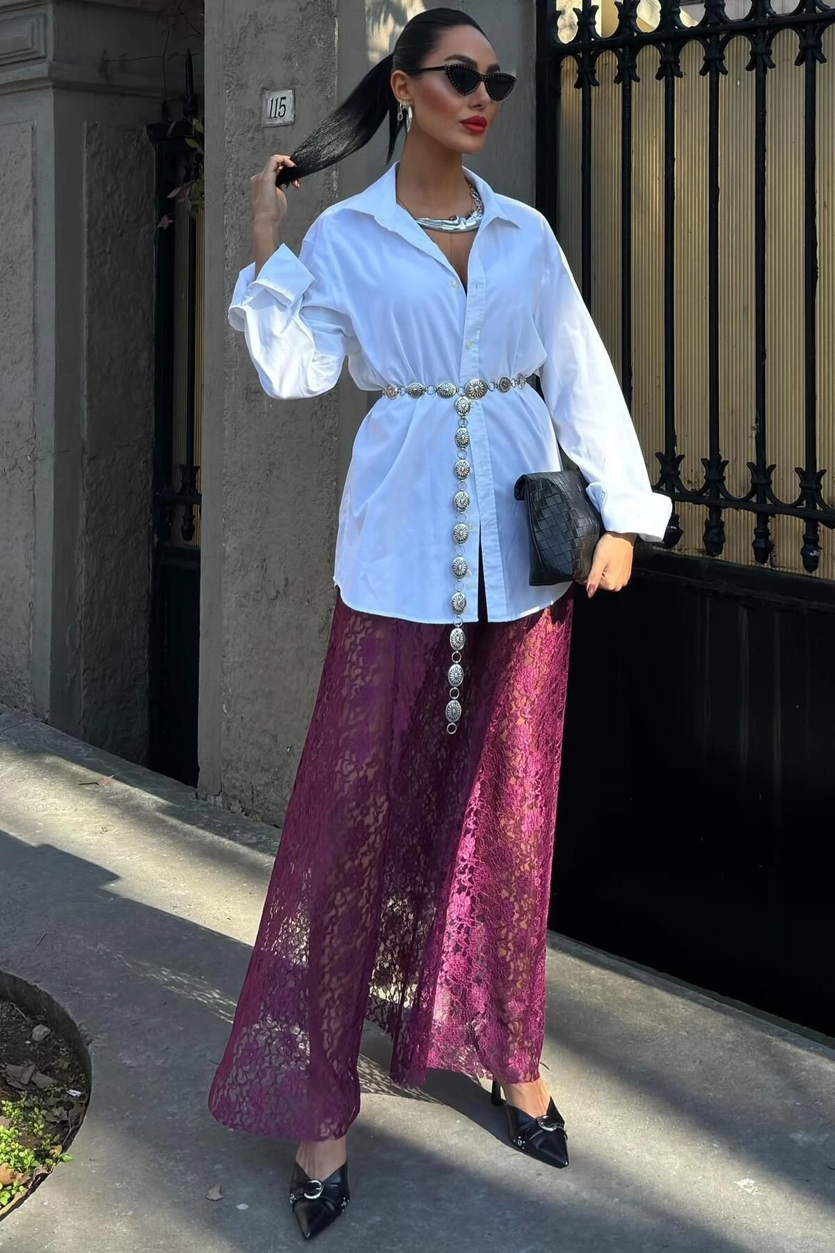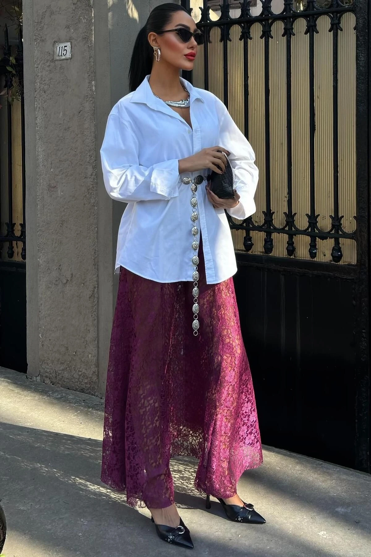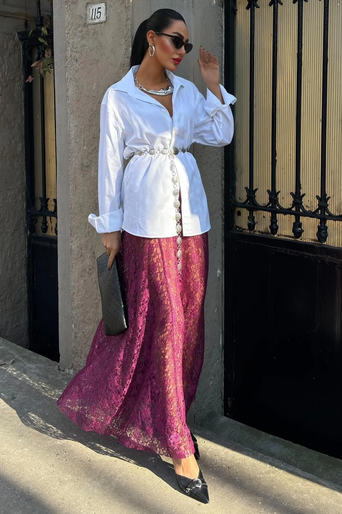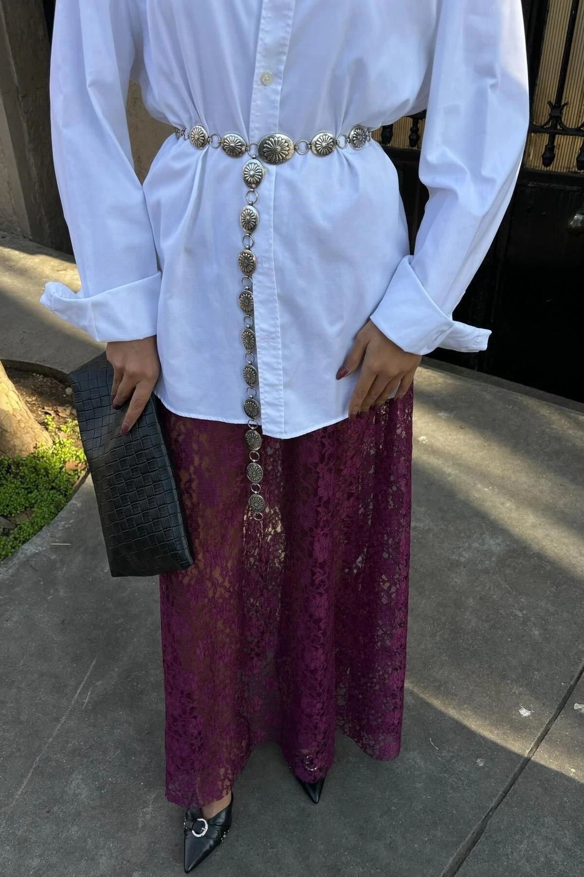 Kadın Mürdüm Dantel Maxi Uzun Etek