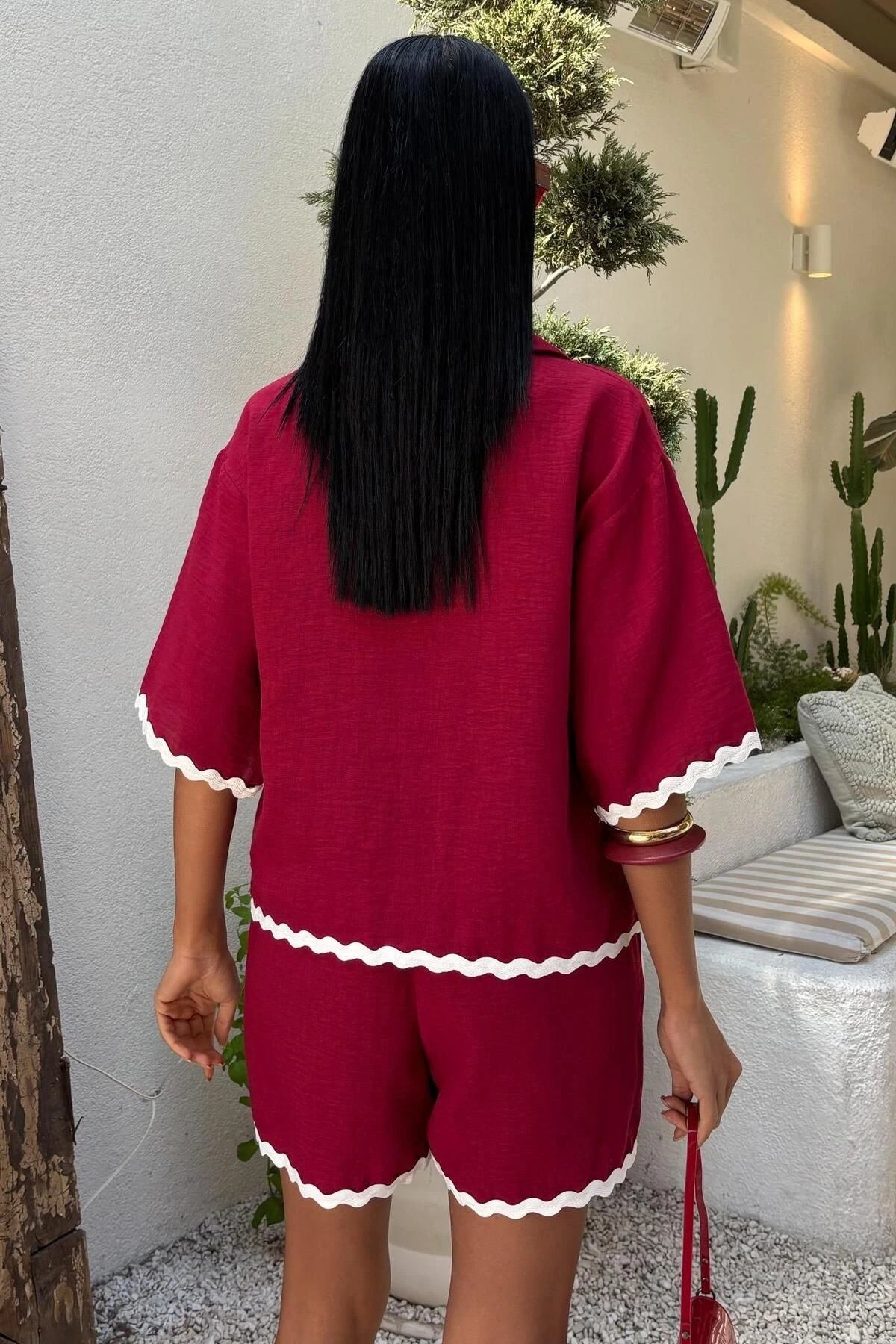 Kadın Mürdüm Keten Biye Detaylı Kısa Kollu Takım