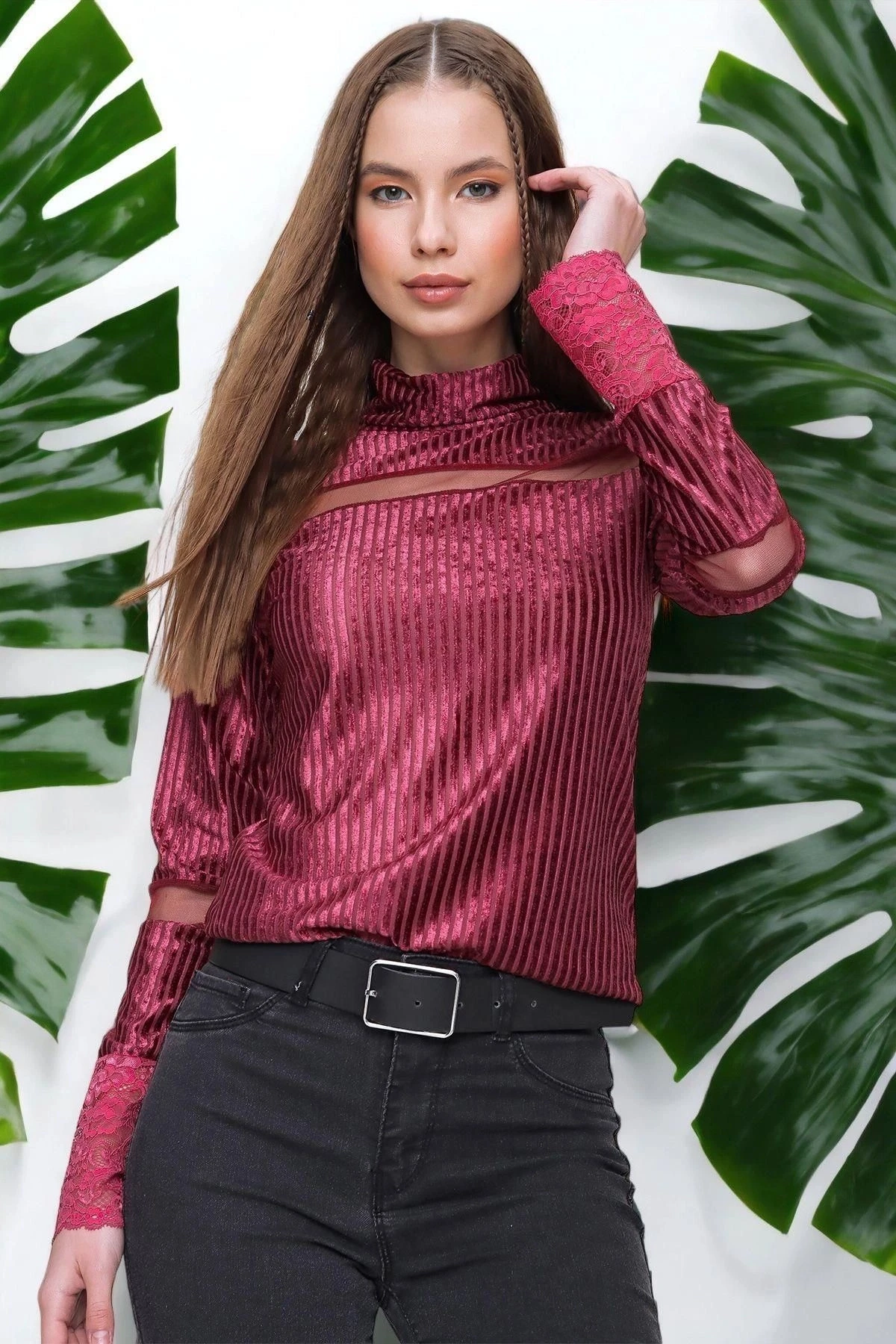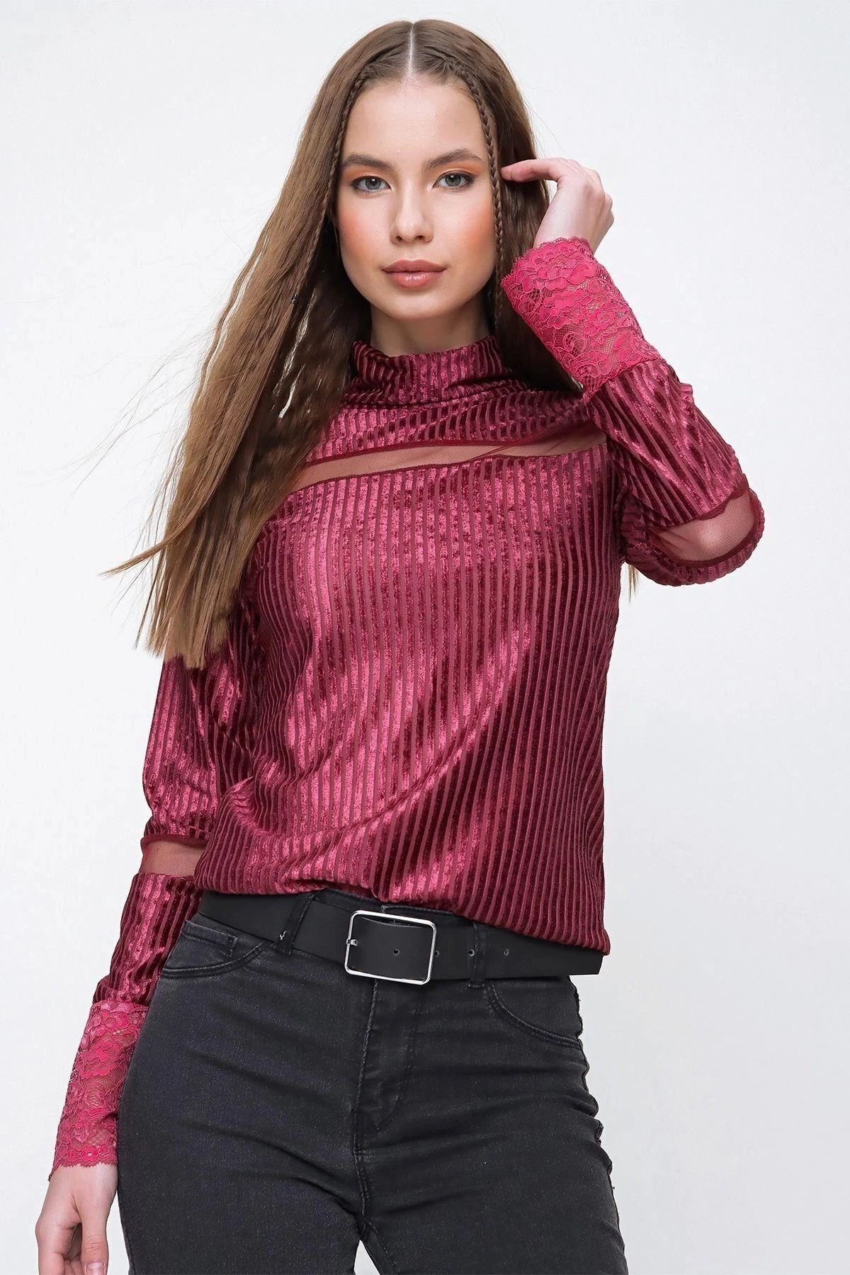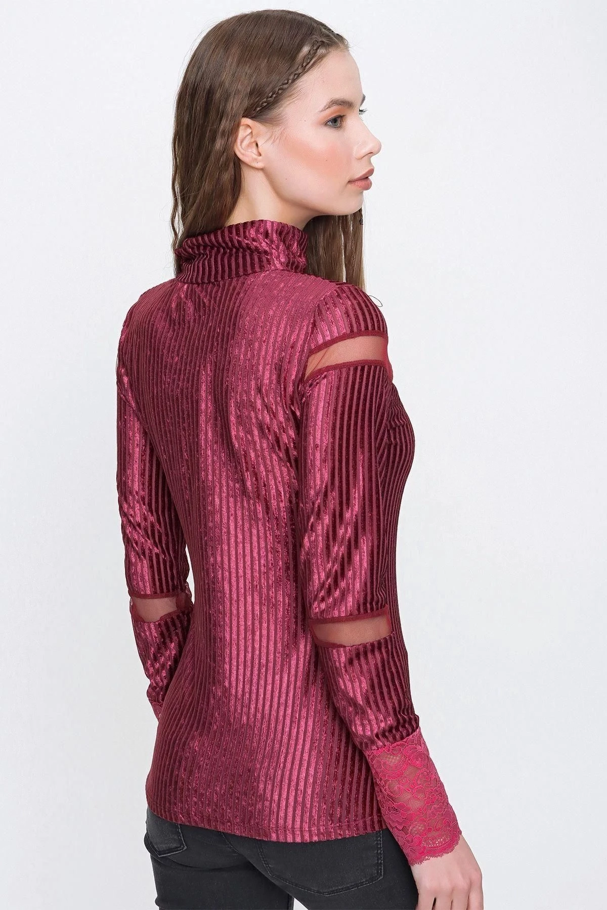Kadın Mürdüm Uzun Kol Tül Detaylı Yumuşak Dokulu Kadife Kumaş Boğazlı Bluz - , Standart Boy