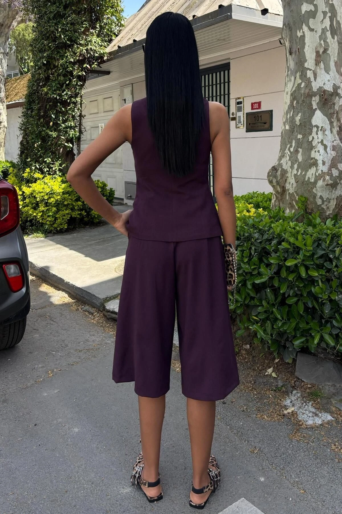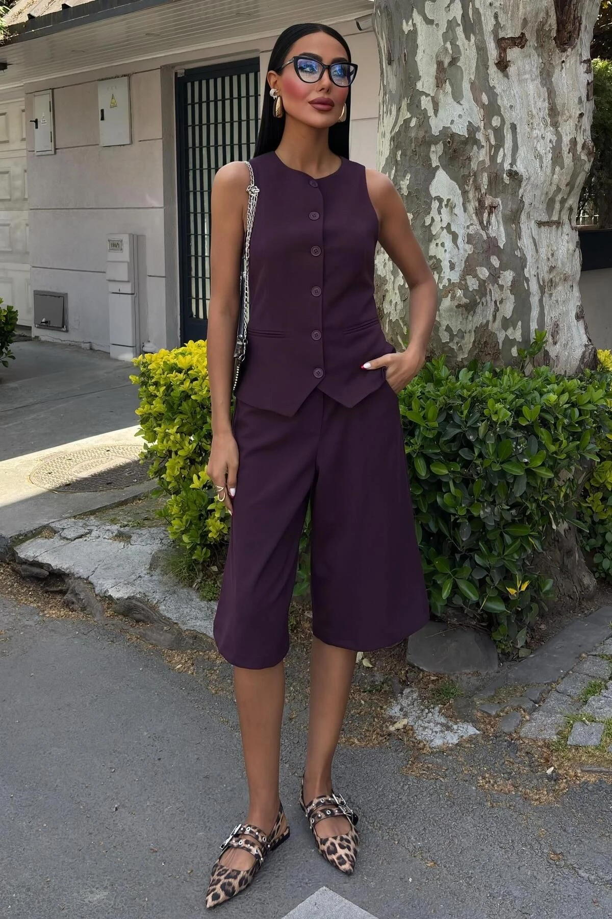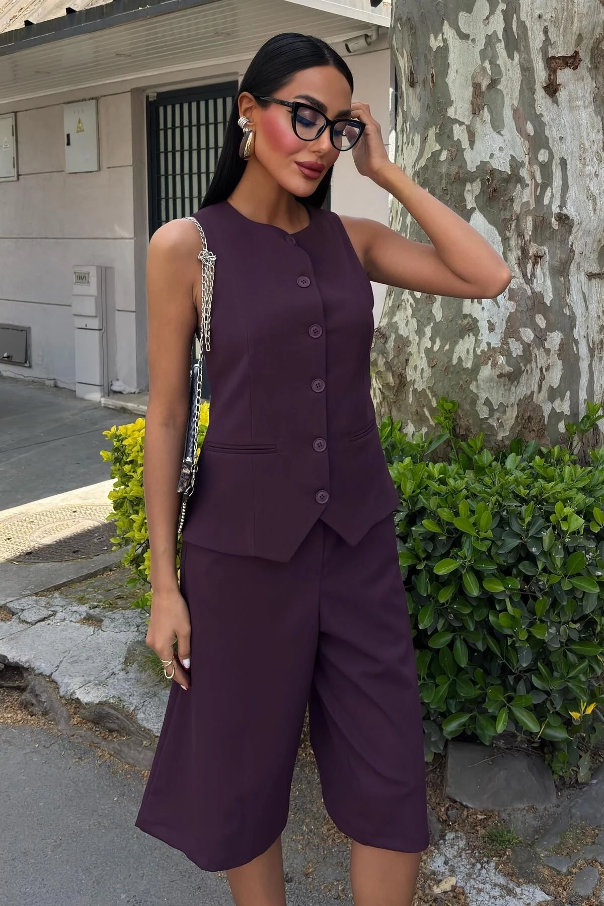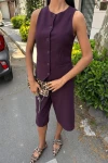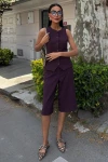 Kadın Mürdüm Viskon Midi Şortlu Kolsuz Standart Takım