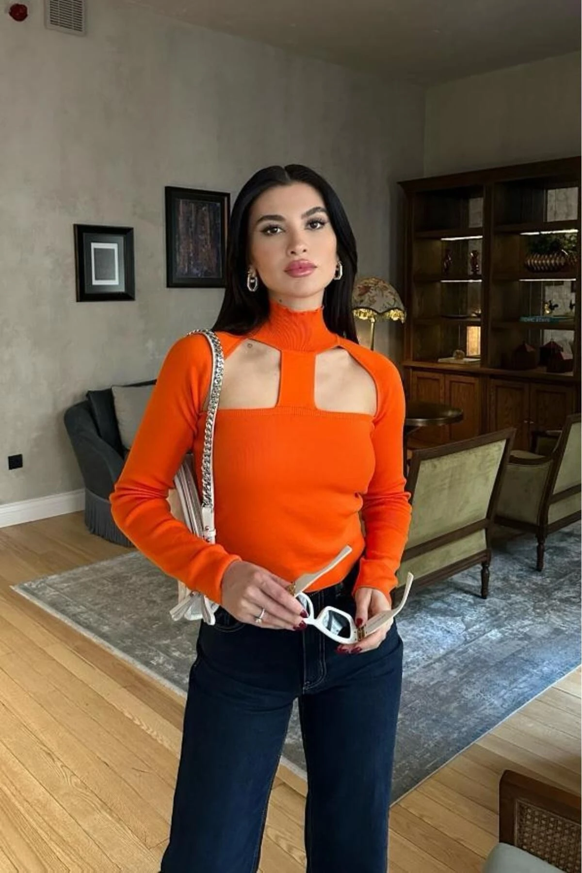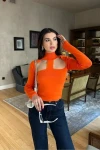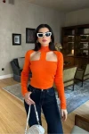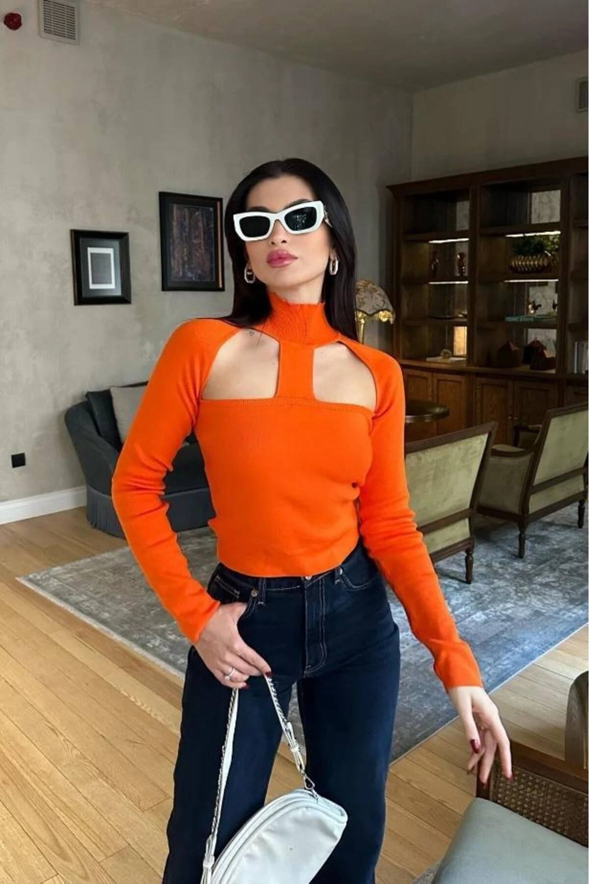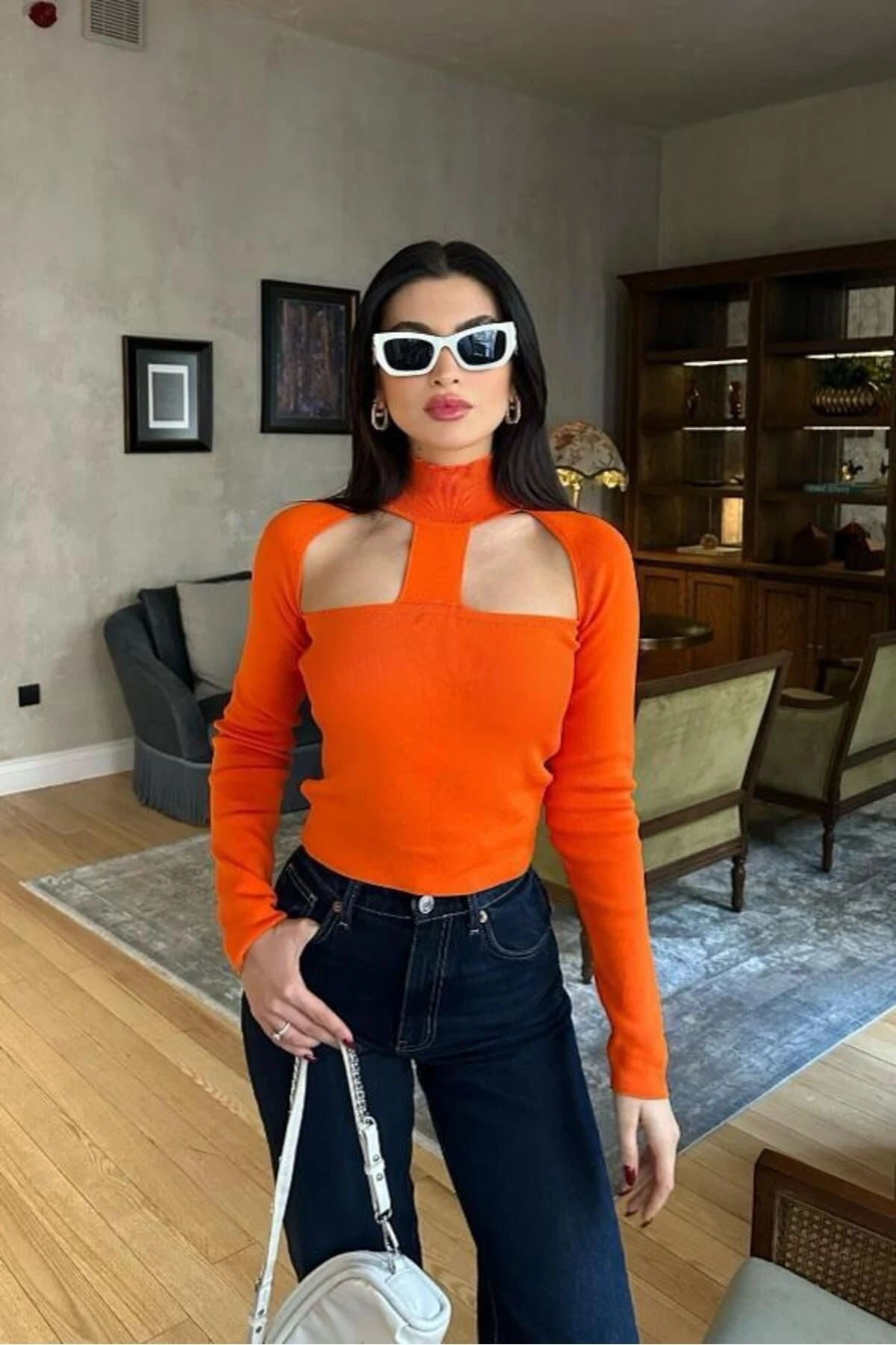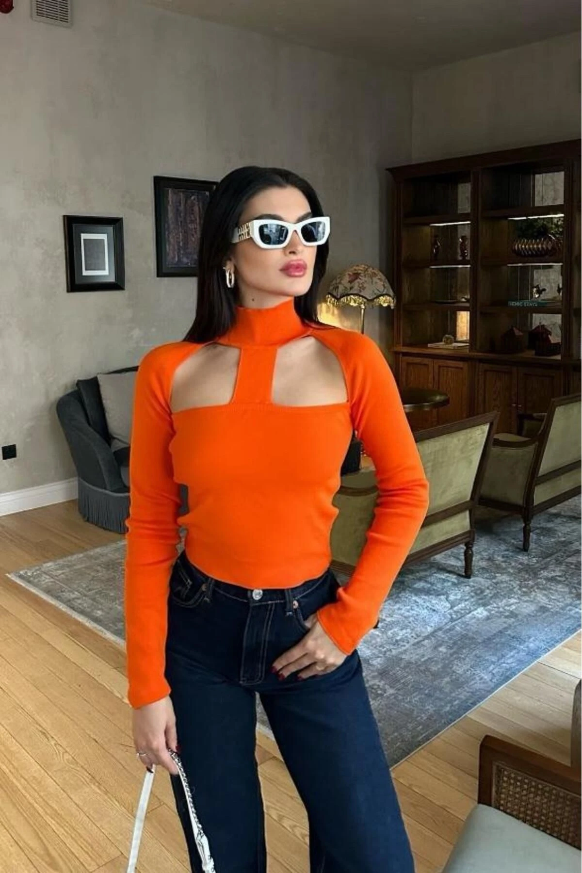 Kadın Oranj Akrilik Yarım Balıkçı Yaka Kısa Bluz