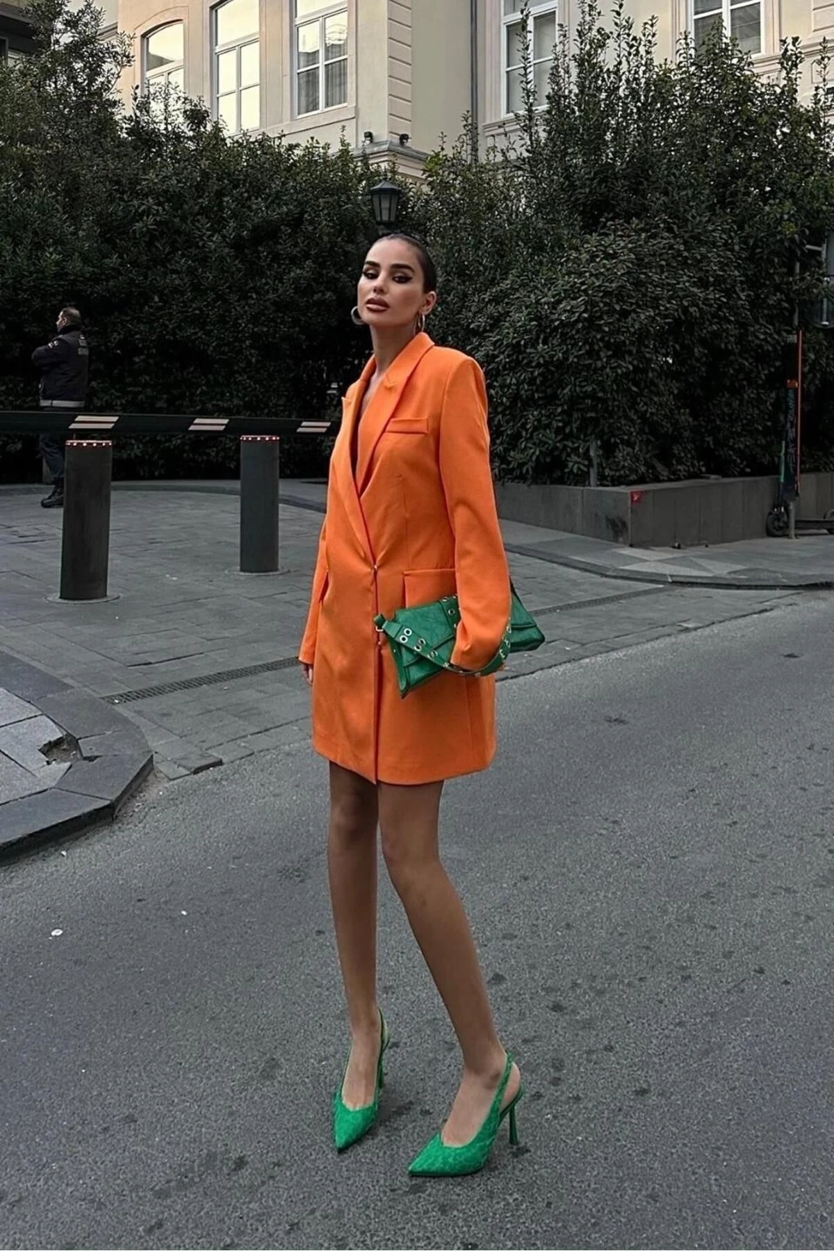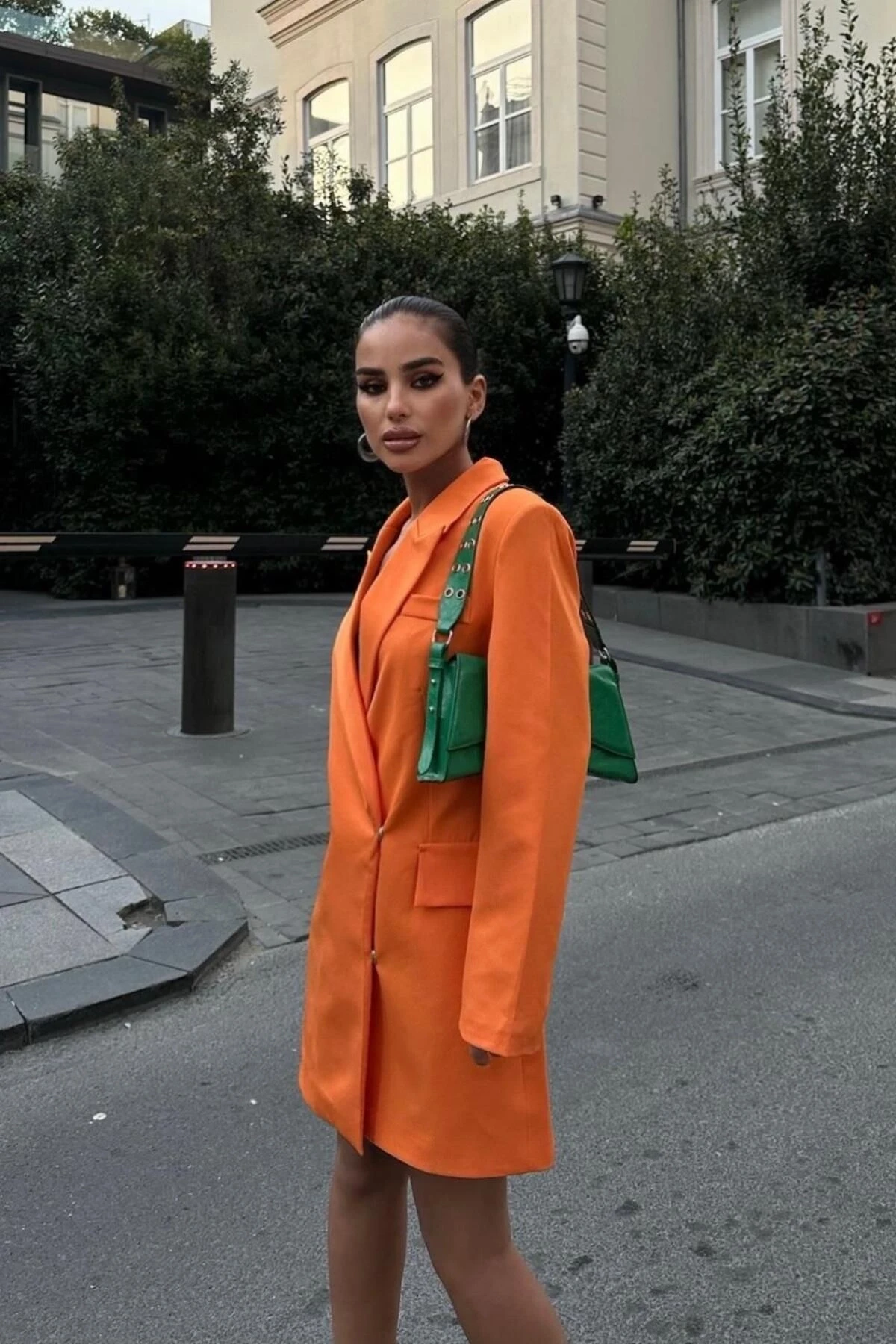 Kadın Oranj Kruvaze Dokuma Kısa Elbise