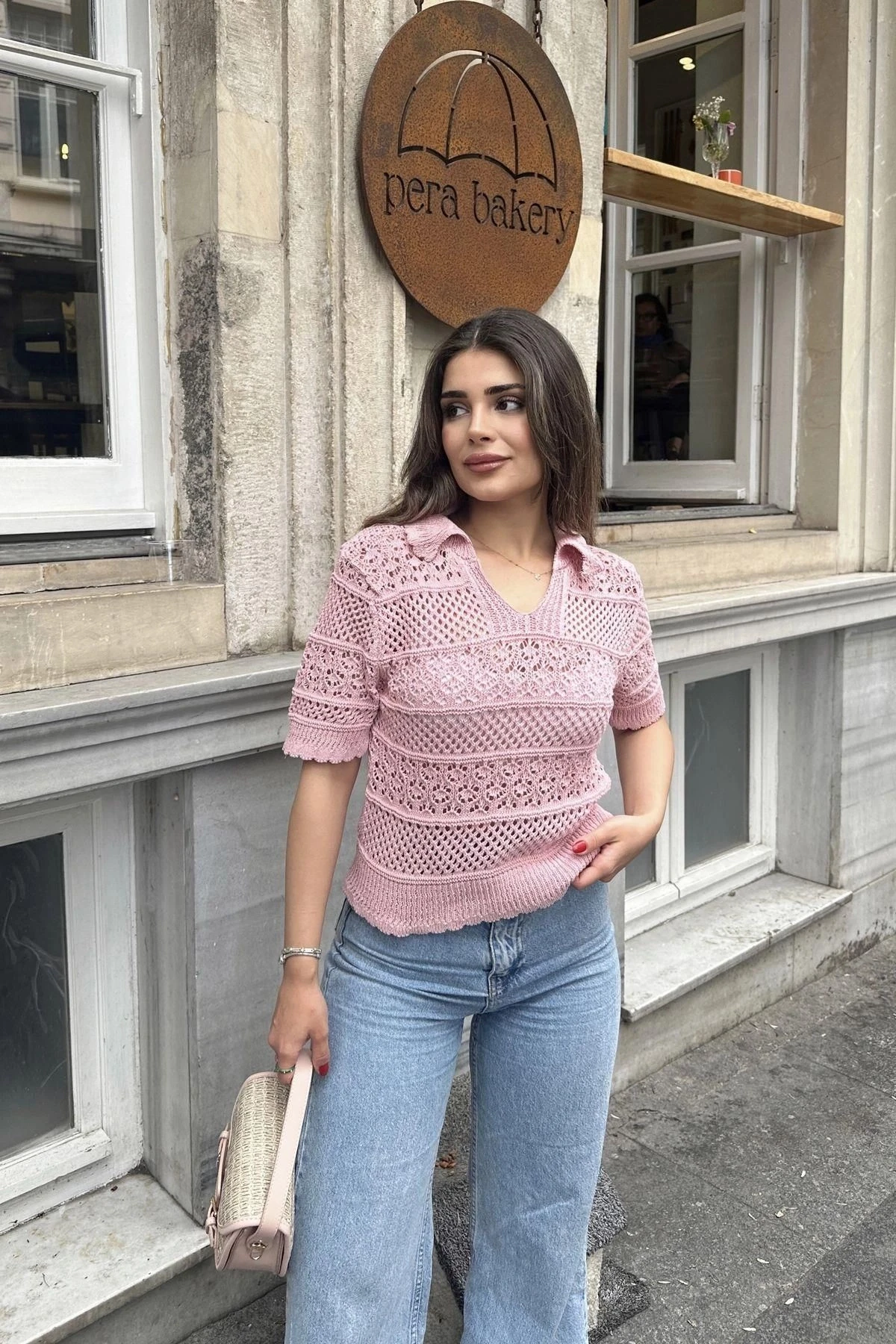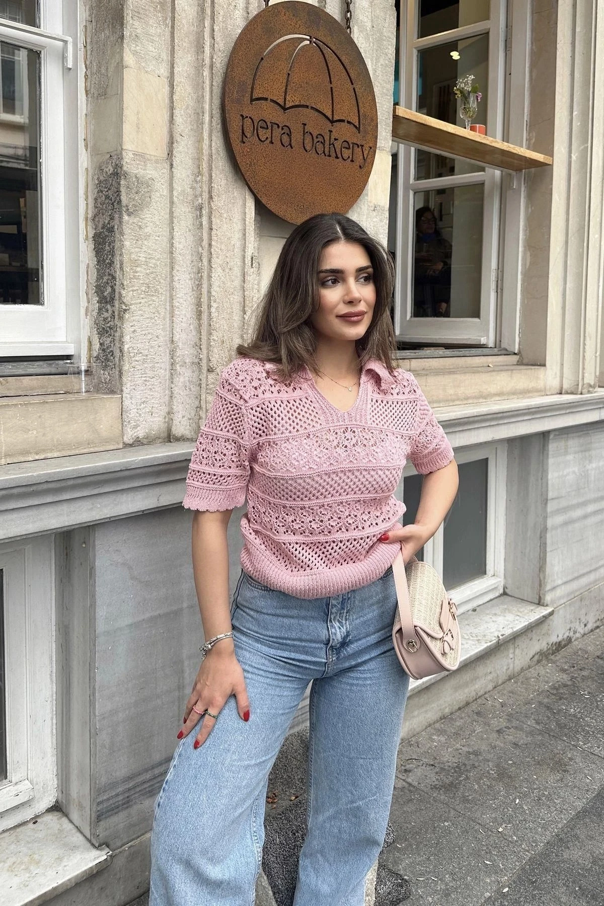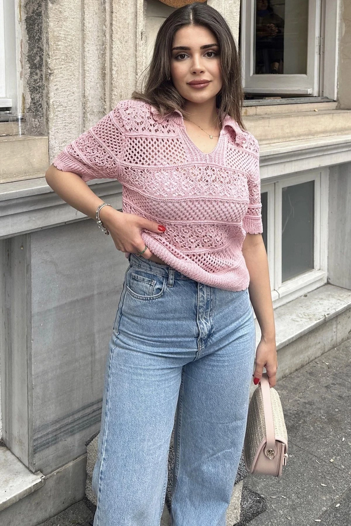 Kadın Pembe Ajurlu Merserize Triko Örme, Terletmez, Salaş Kalıp, Polo Yaka Bluz