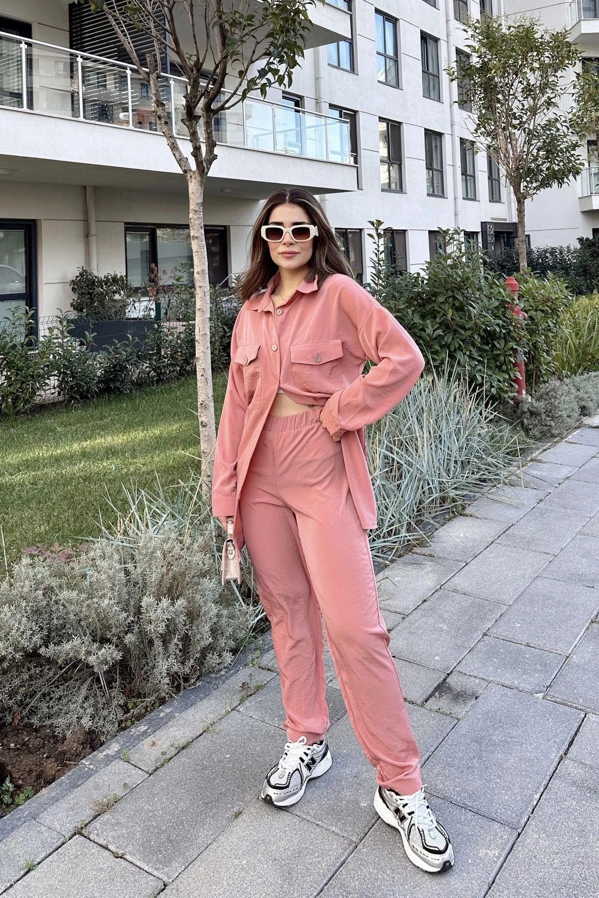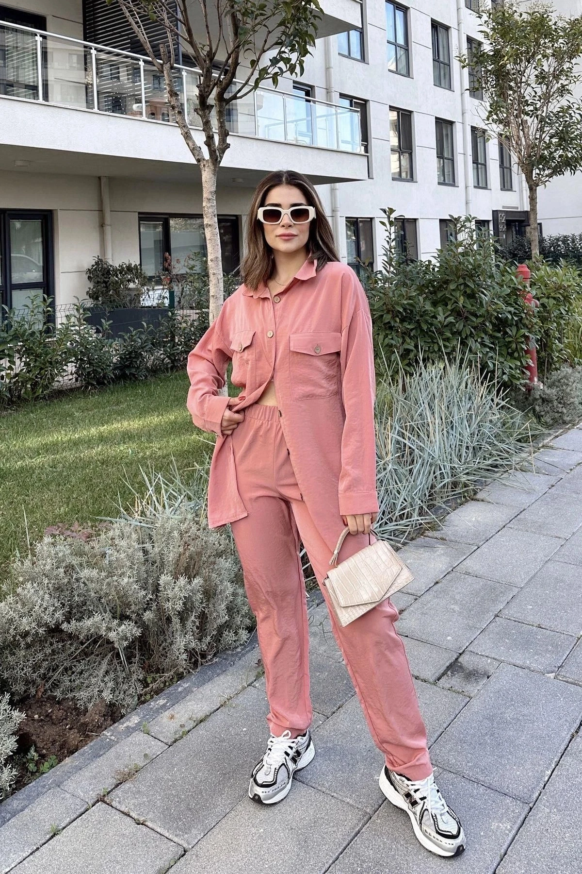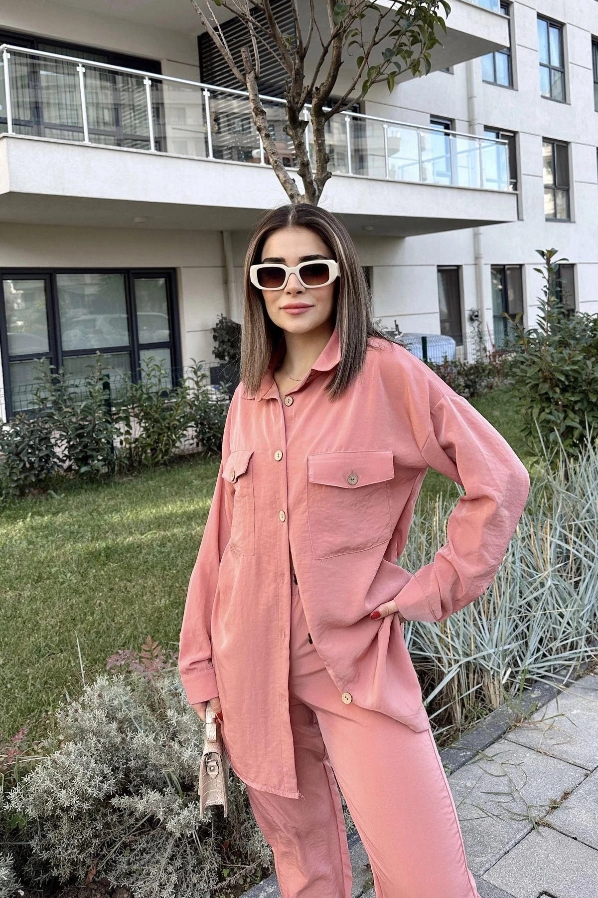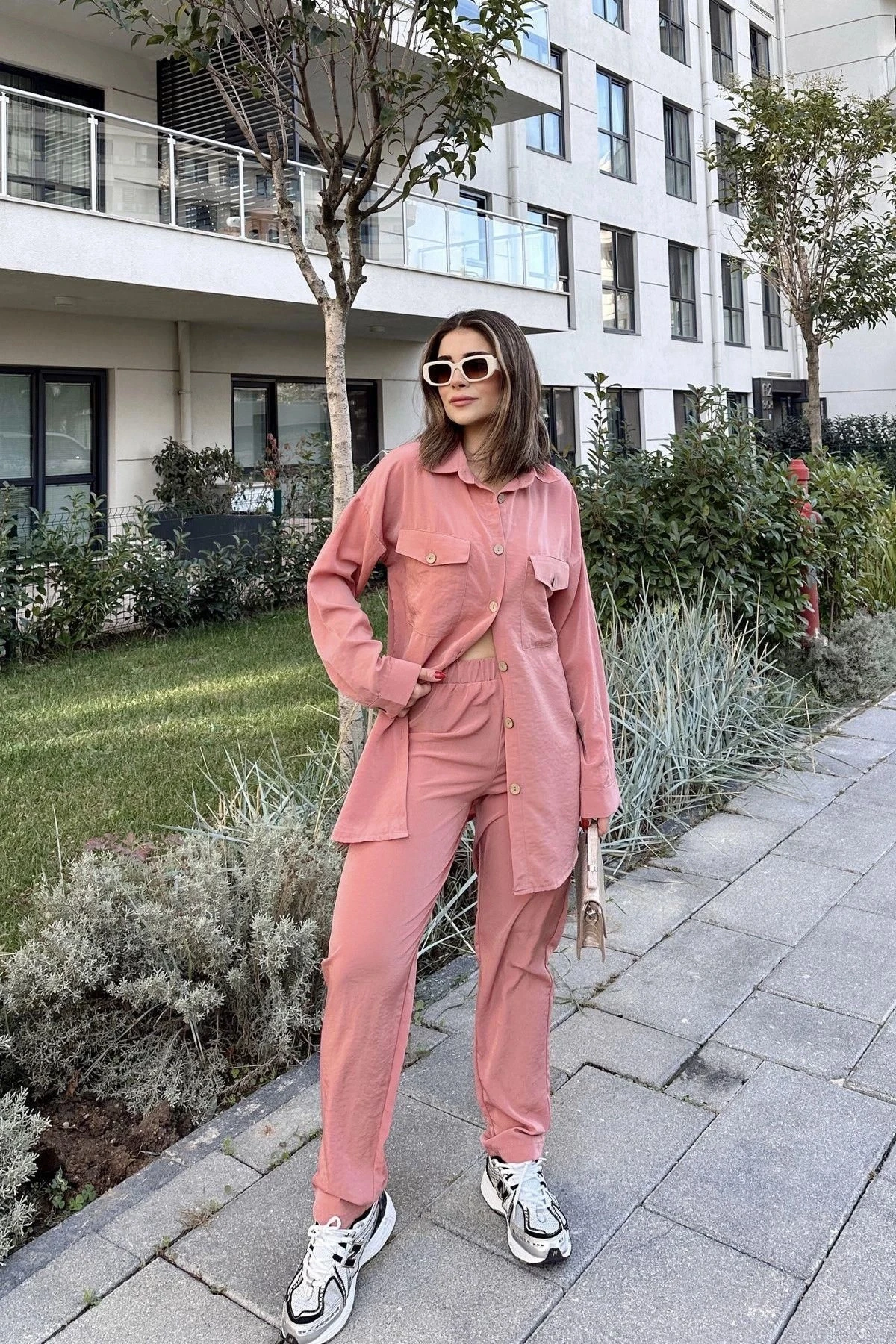Kadın Pembe Çift Cepli Uzun Gömlek & Beli Lastikli Pantolon - Rahat Alt & Üst Takım