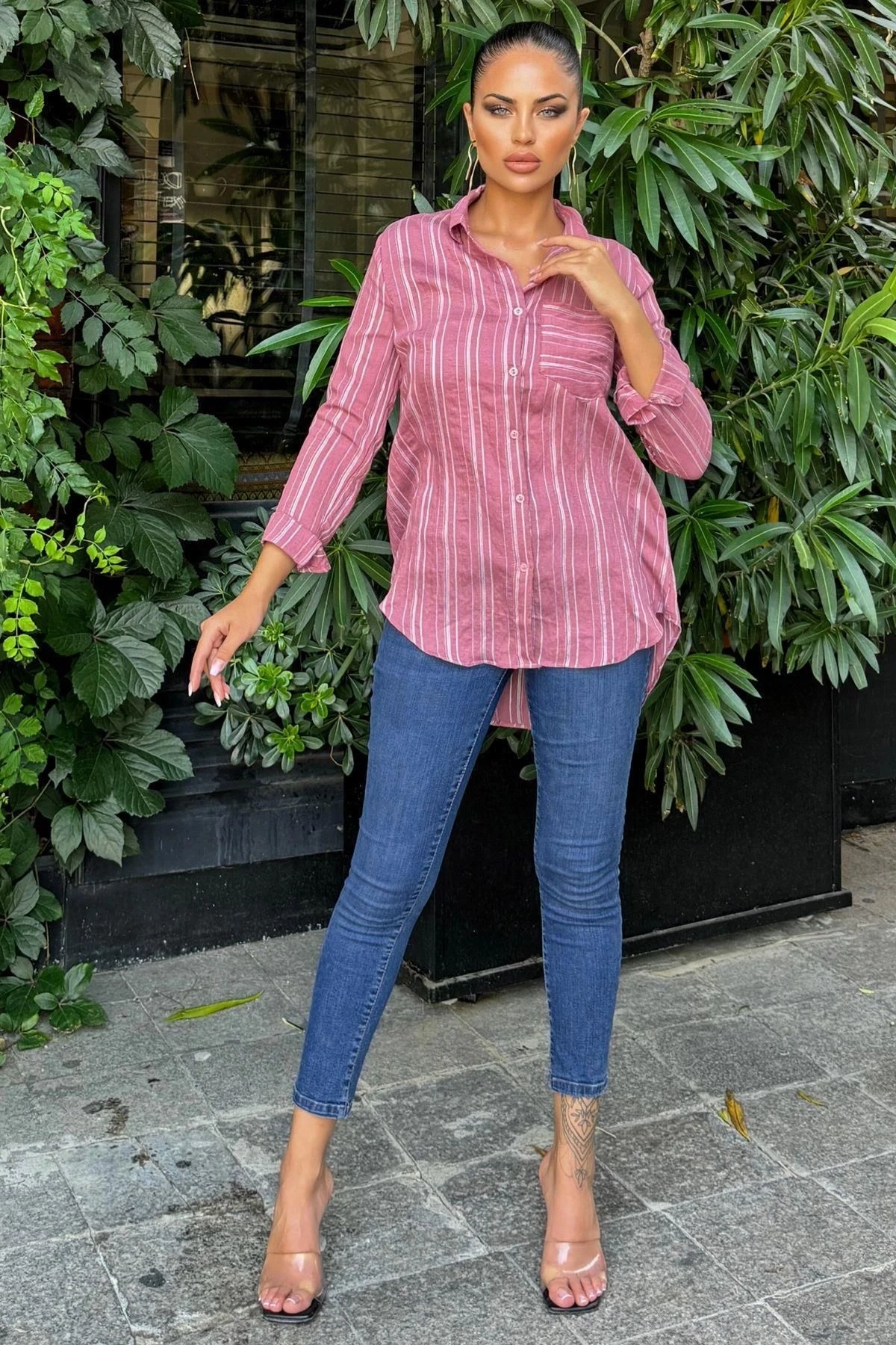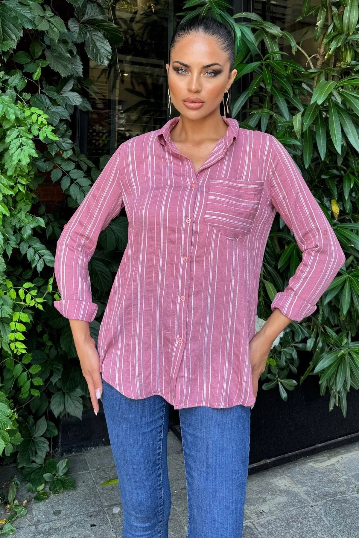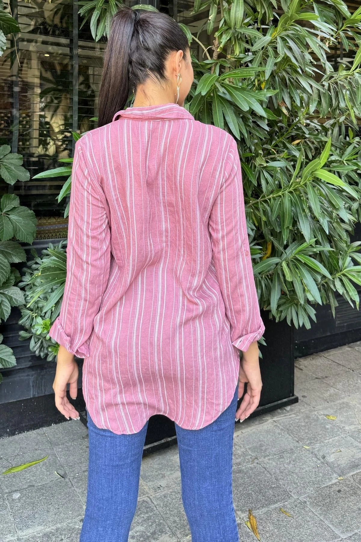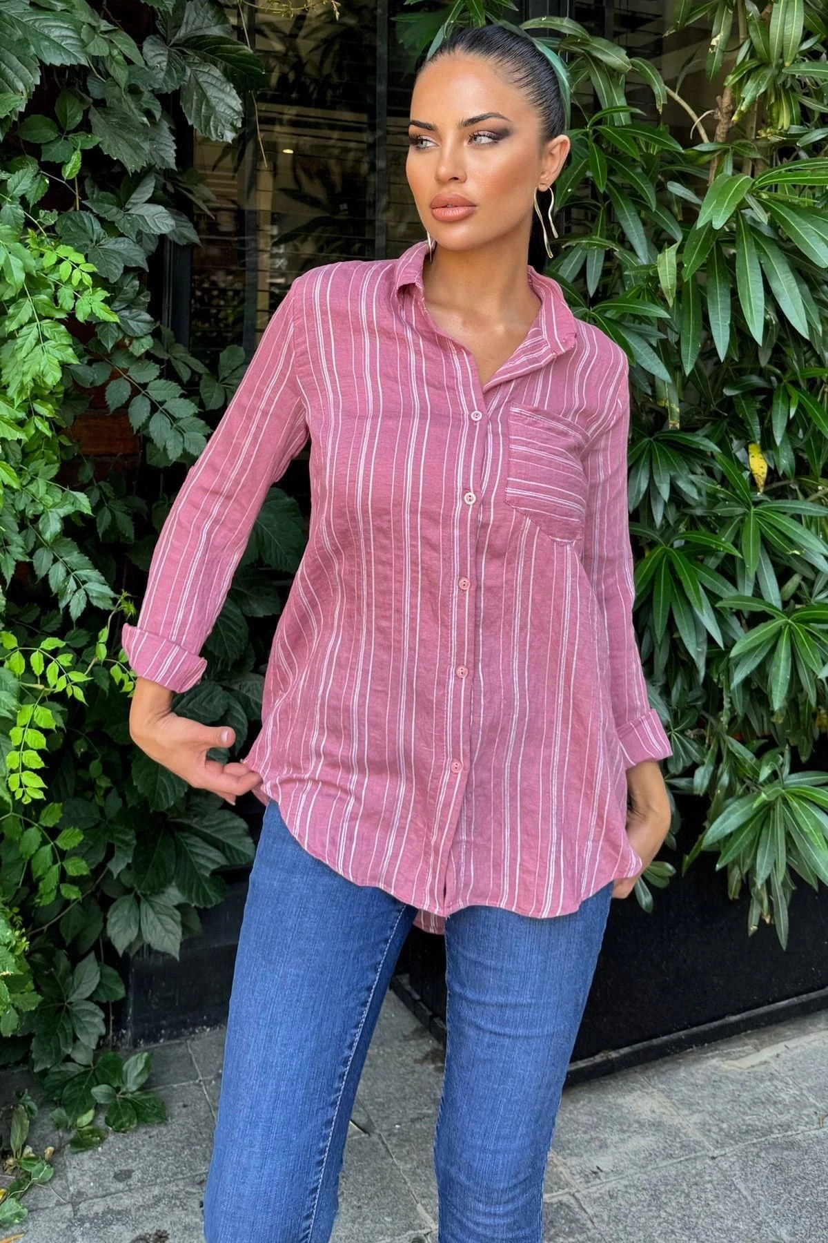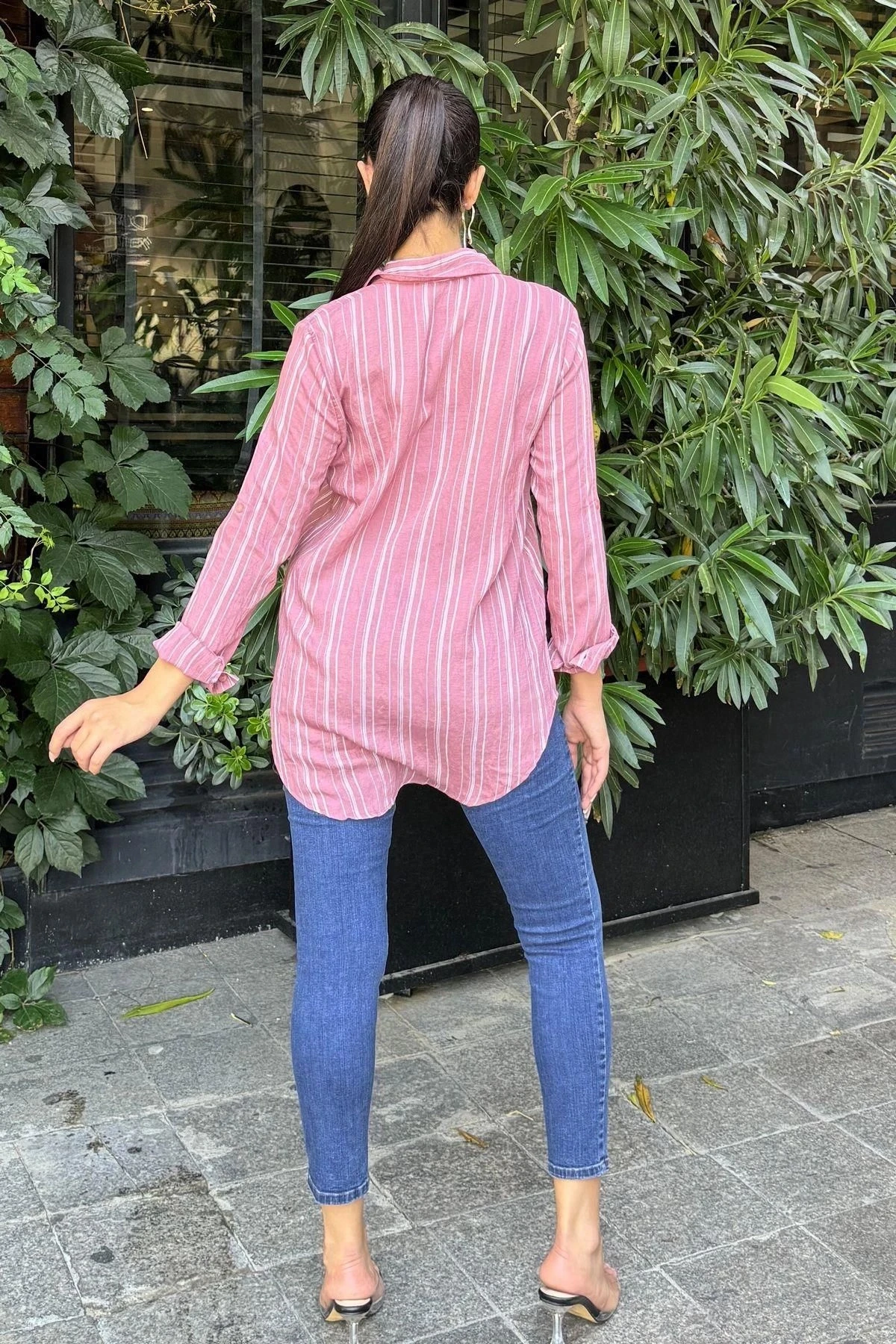 Kadın Pembe Çizgili Desenli, Uzun Kollu, Rahat Kesim, Dokulu Kumaş Gömlek