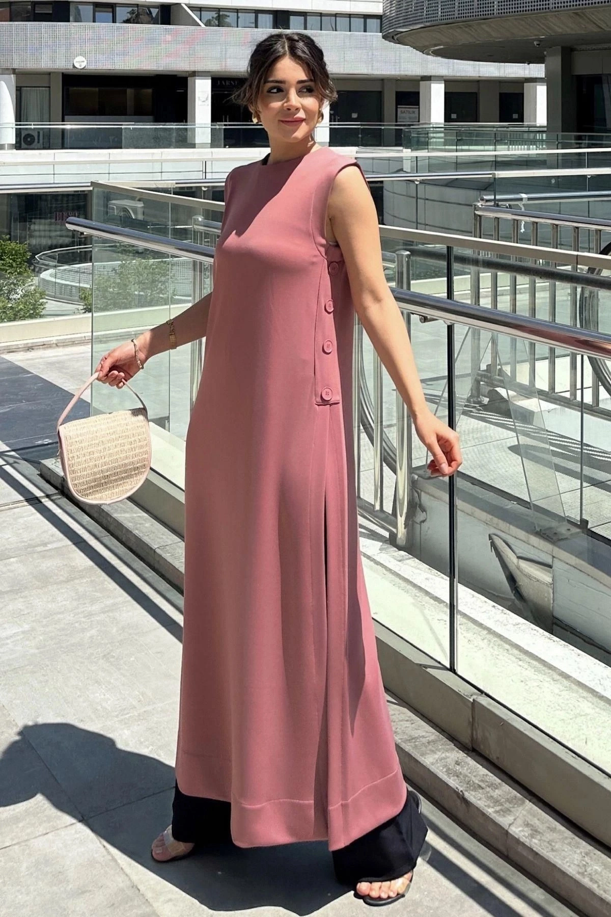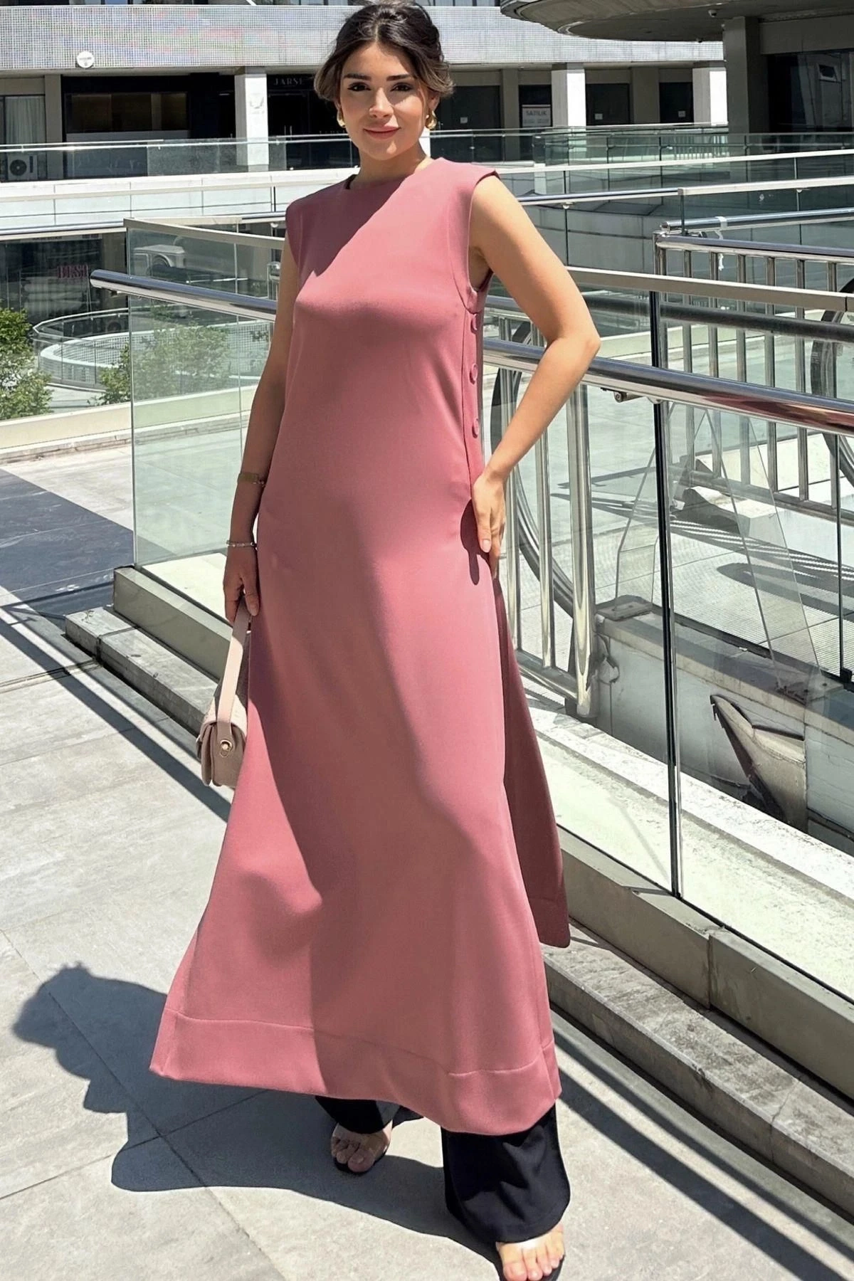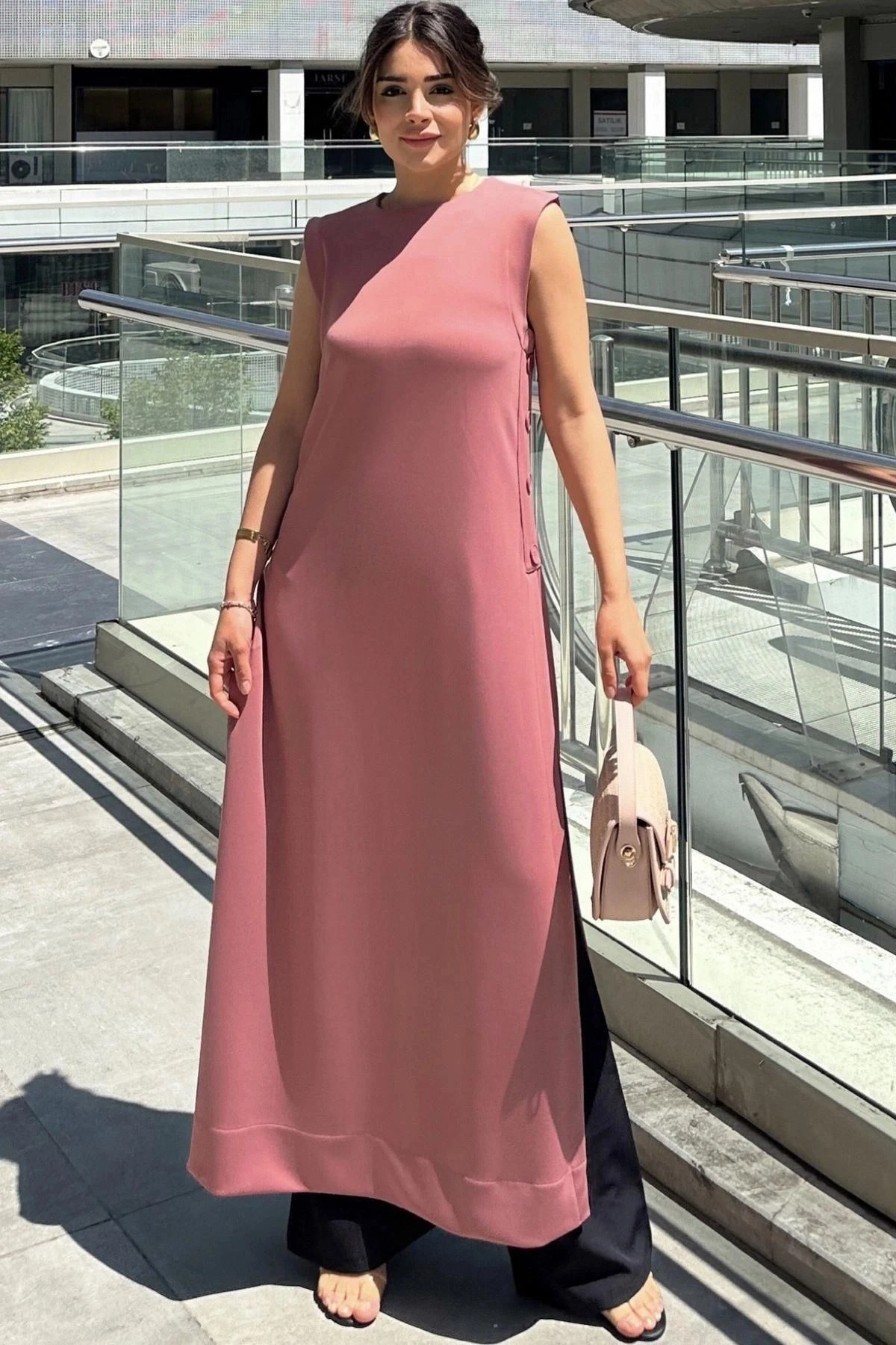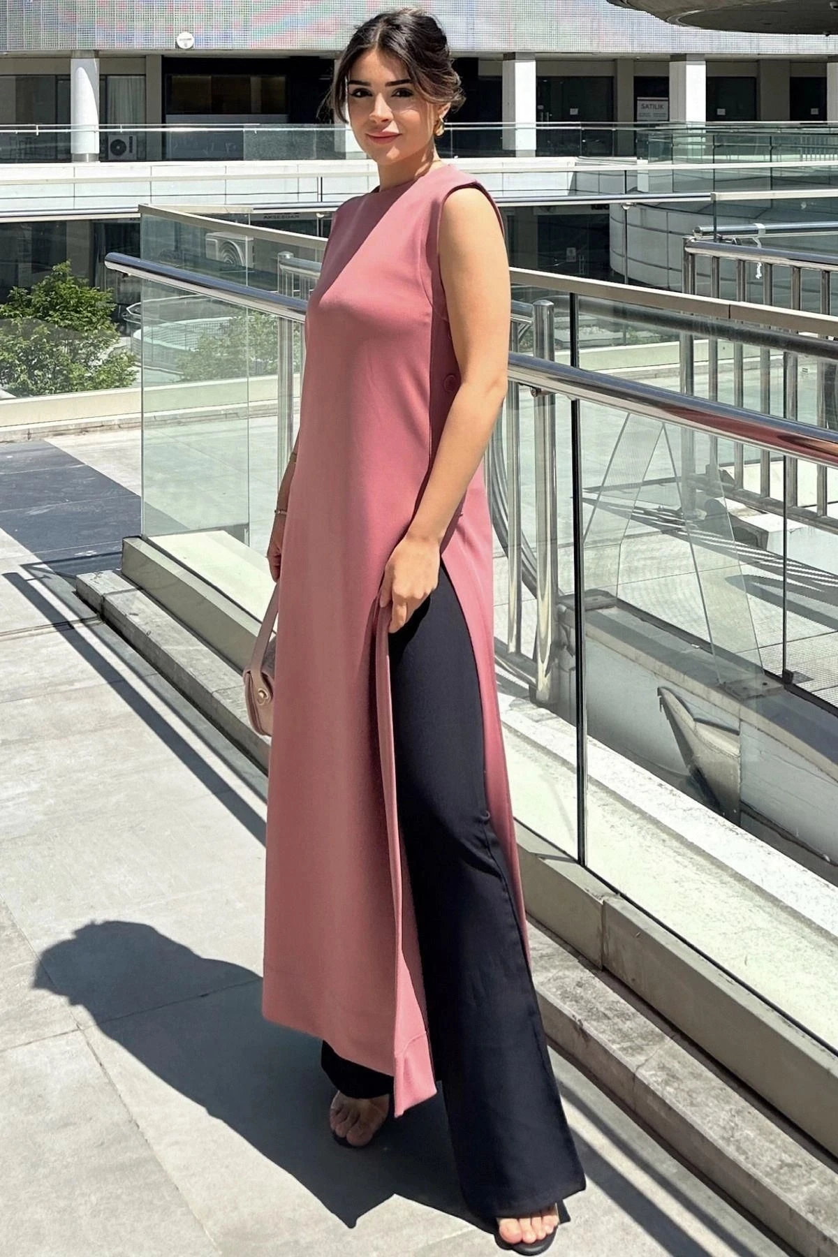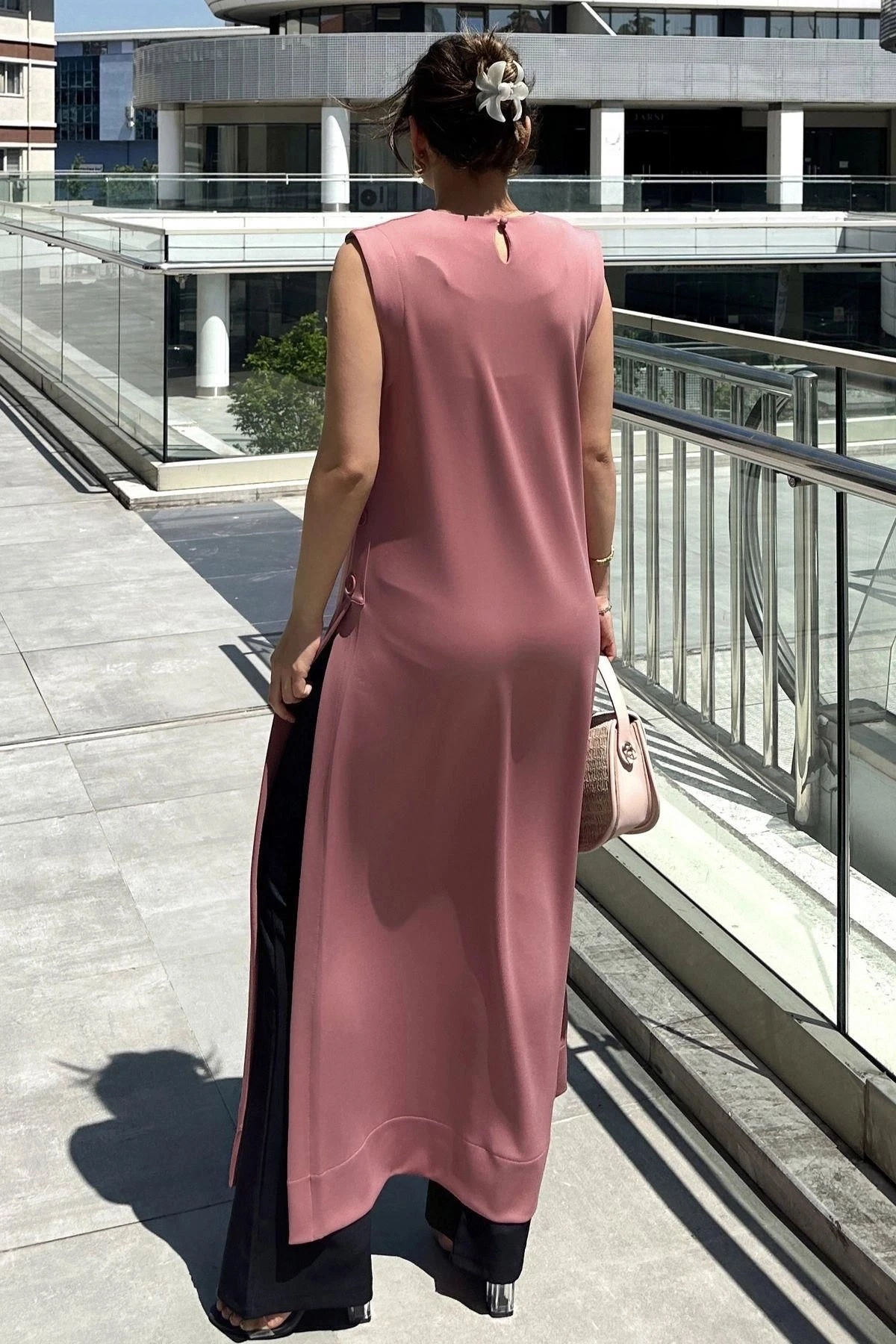Kadın Pembe Kolsuz, Yuvarlak Yaka, Derin Yırtmaçlı, A Kesim Likralı Tunik Elbise
