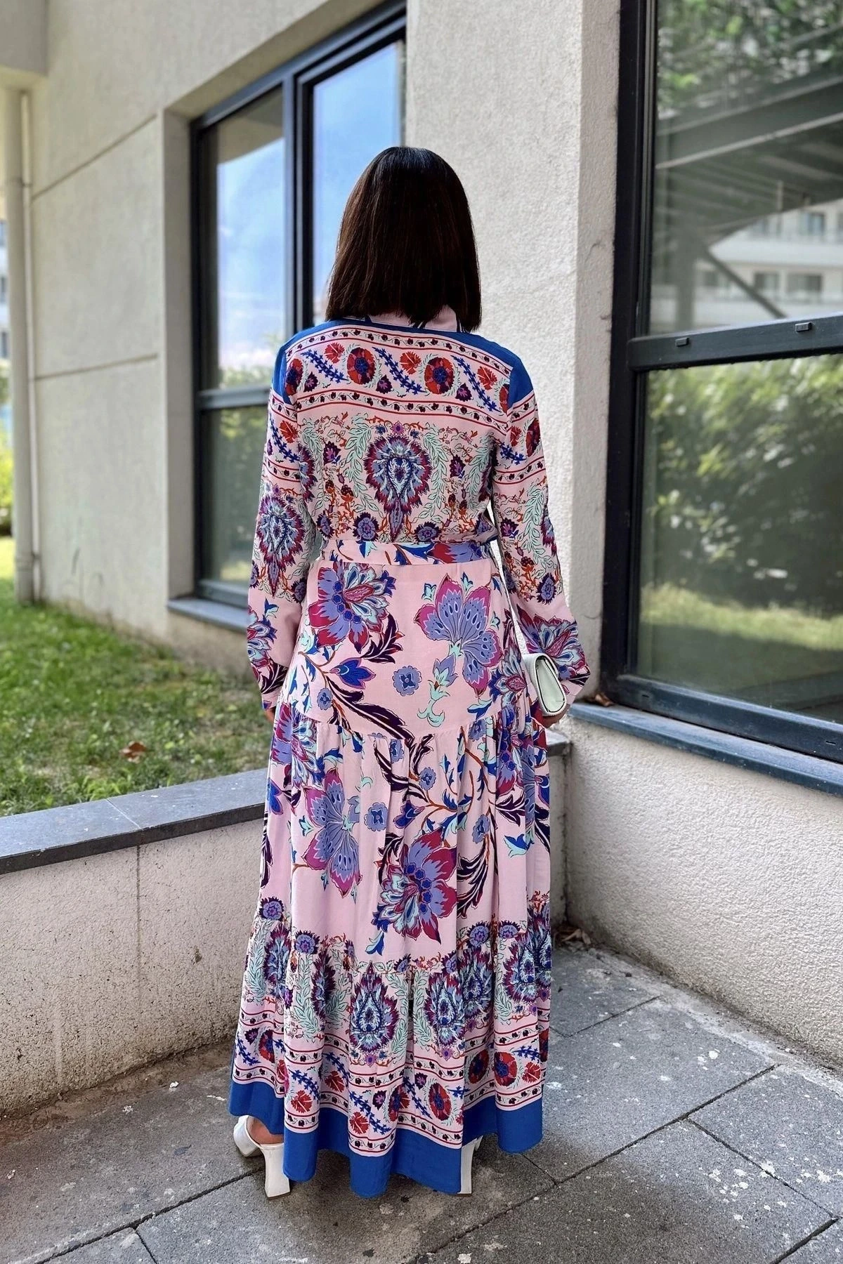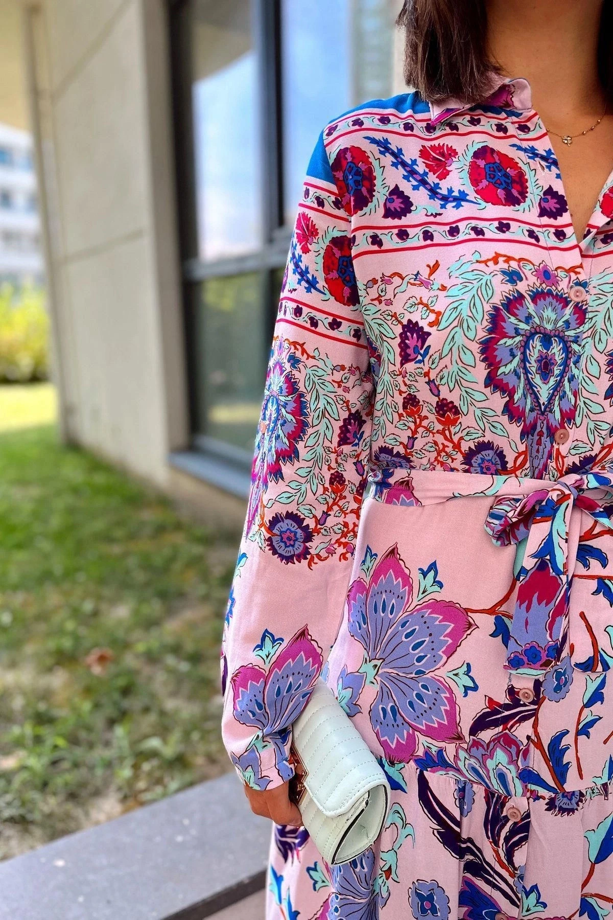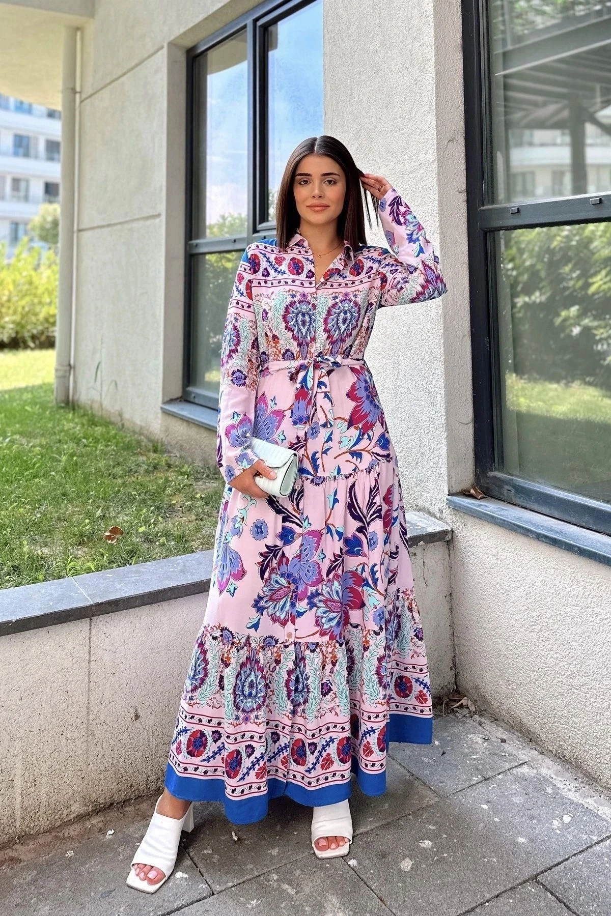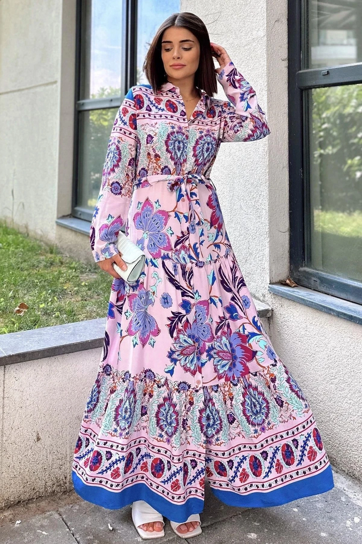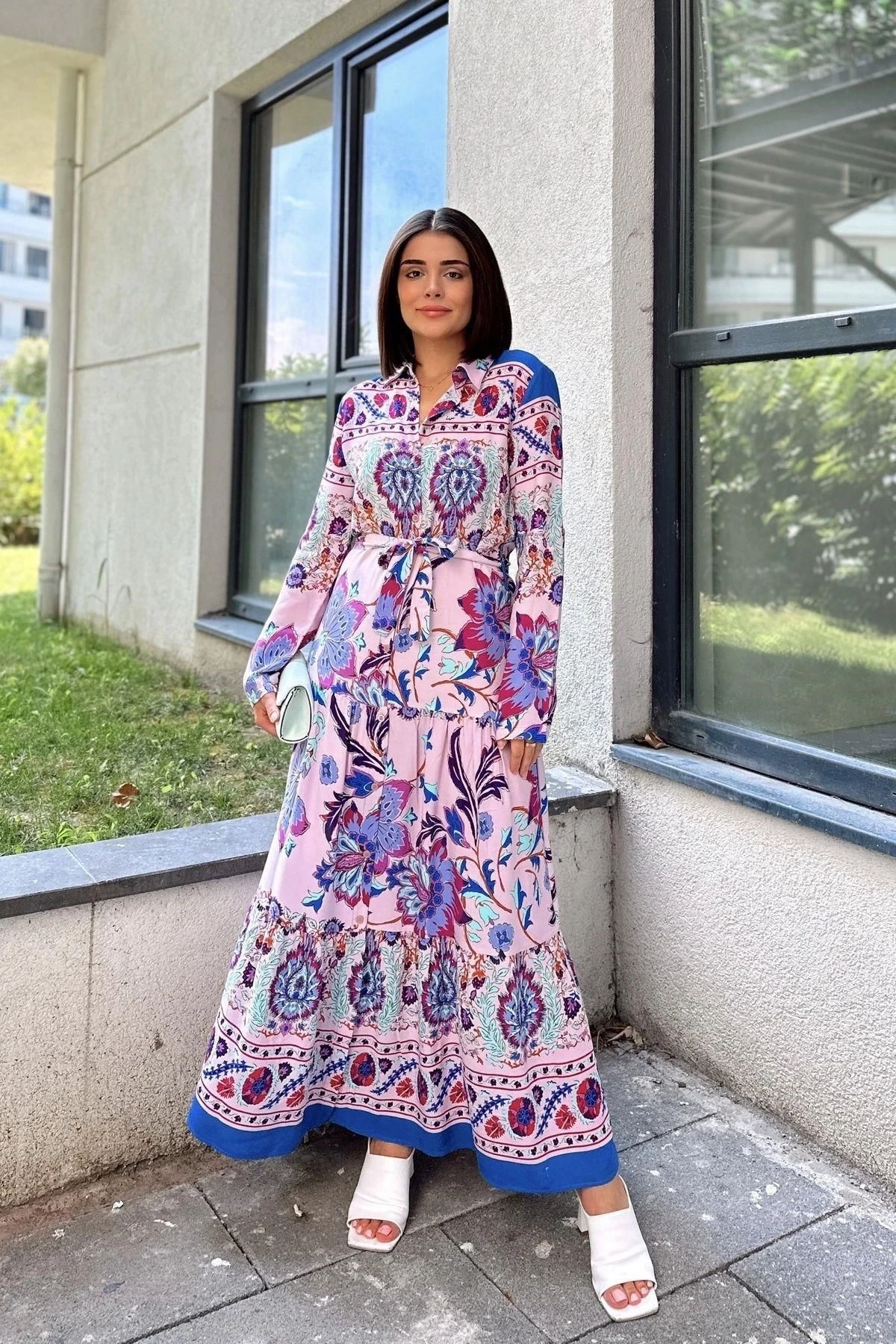 Kadın Pembe & Mavi Gömlek Yaka, Uzun Kol, Eteği Pliseli, Beli Kuşaklı, Salaş Kesim, Uzun Elbise