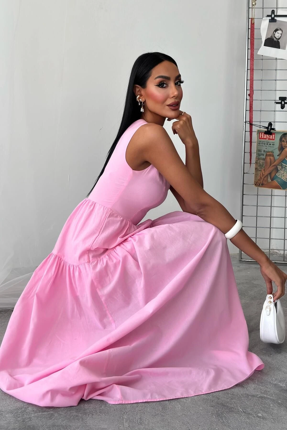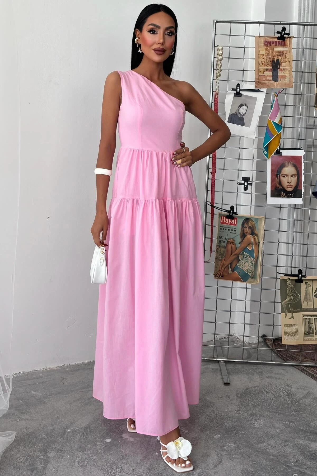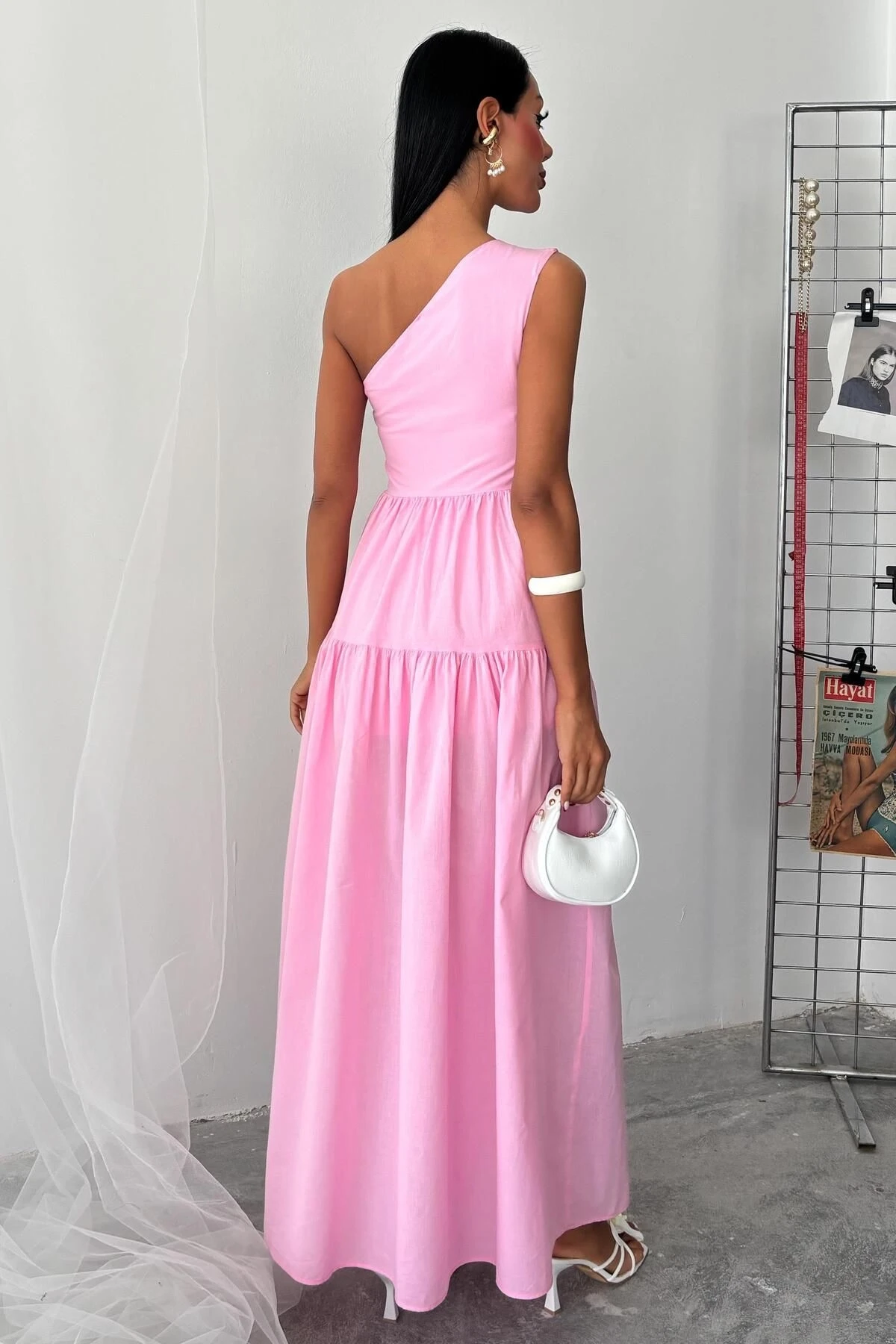 Kadın Pembe Tek Omuz Wual Maxi Elbise