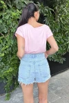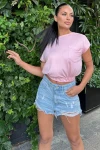 Kadın Pembe Yarım Kol, Geniş Yaka, Tek Cepli, Beli Lastikli Rahat Crop Bluz
