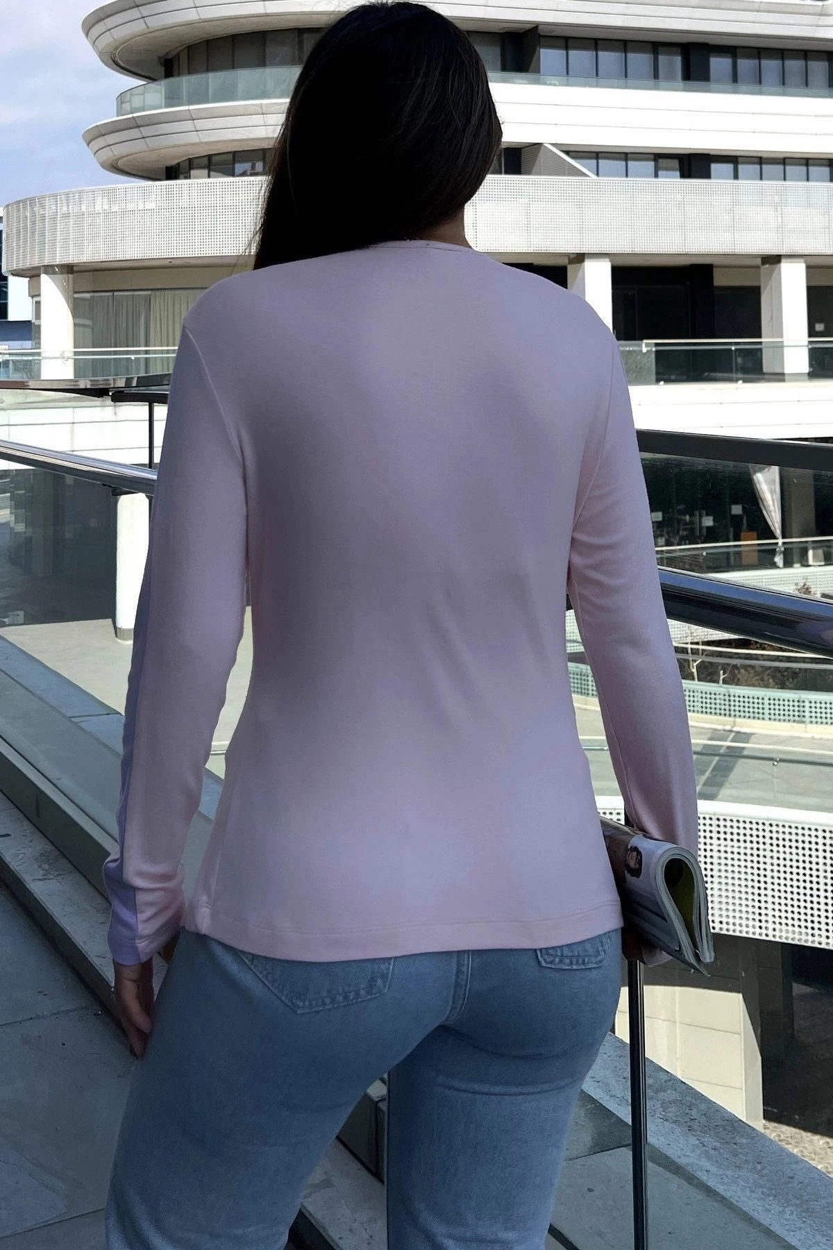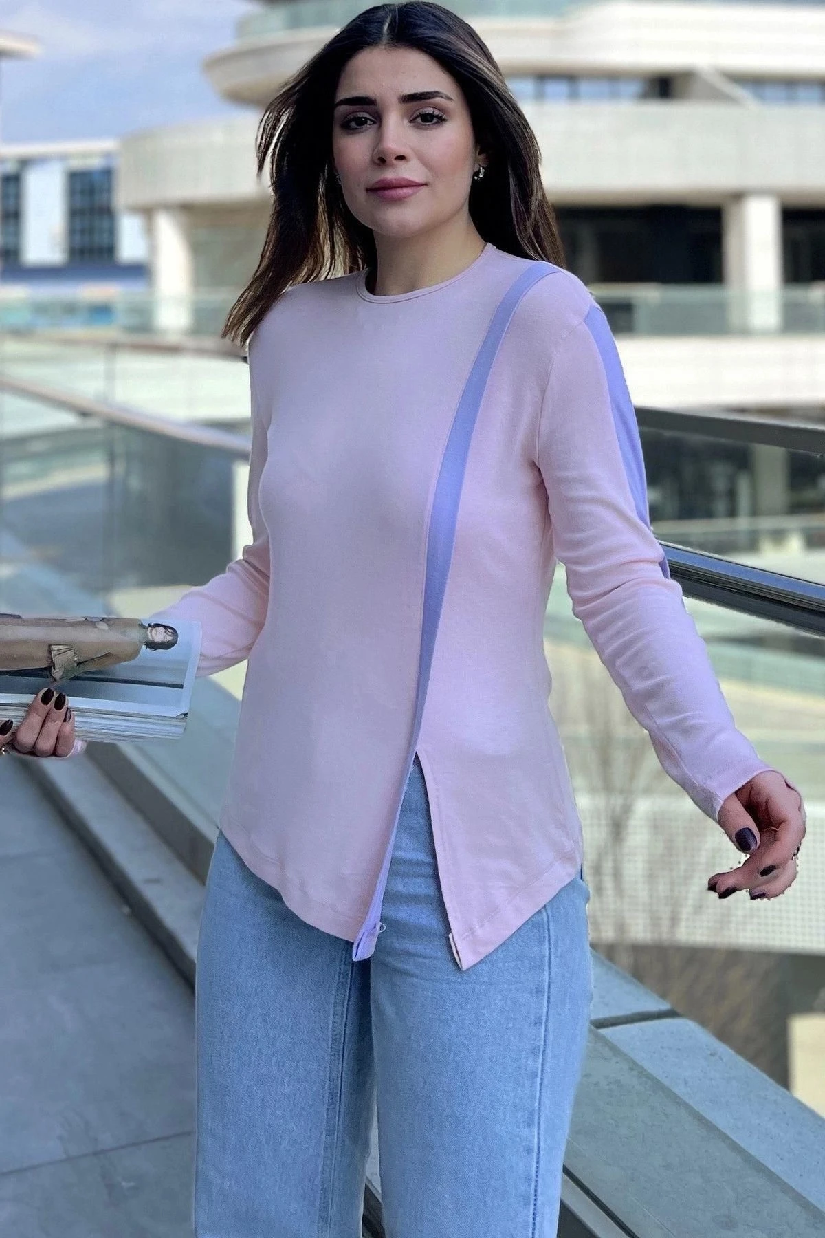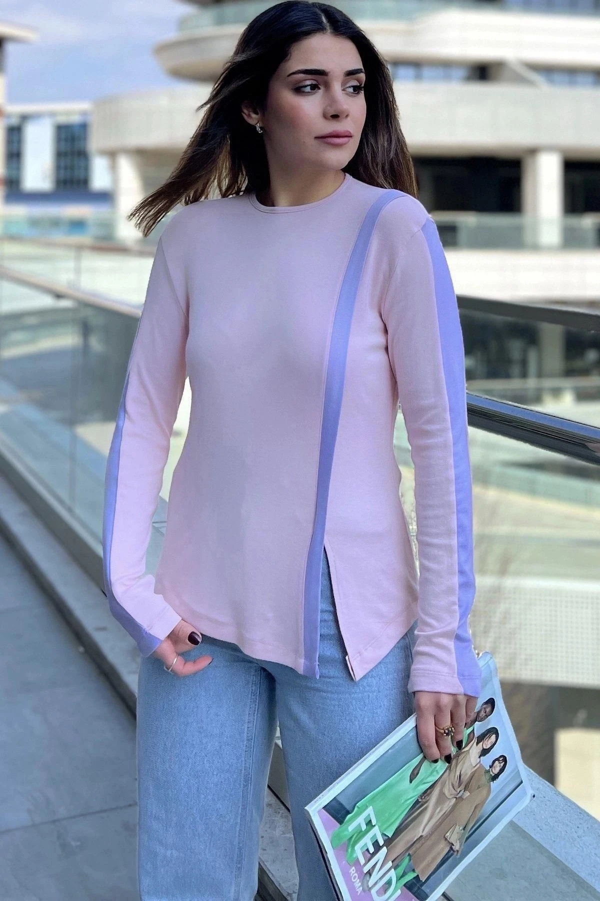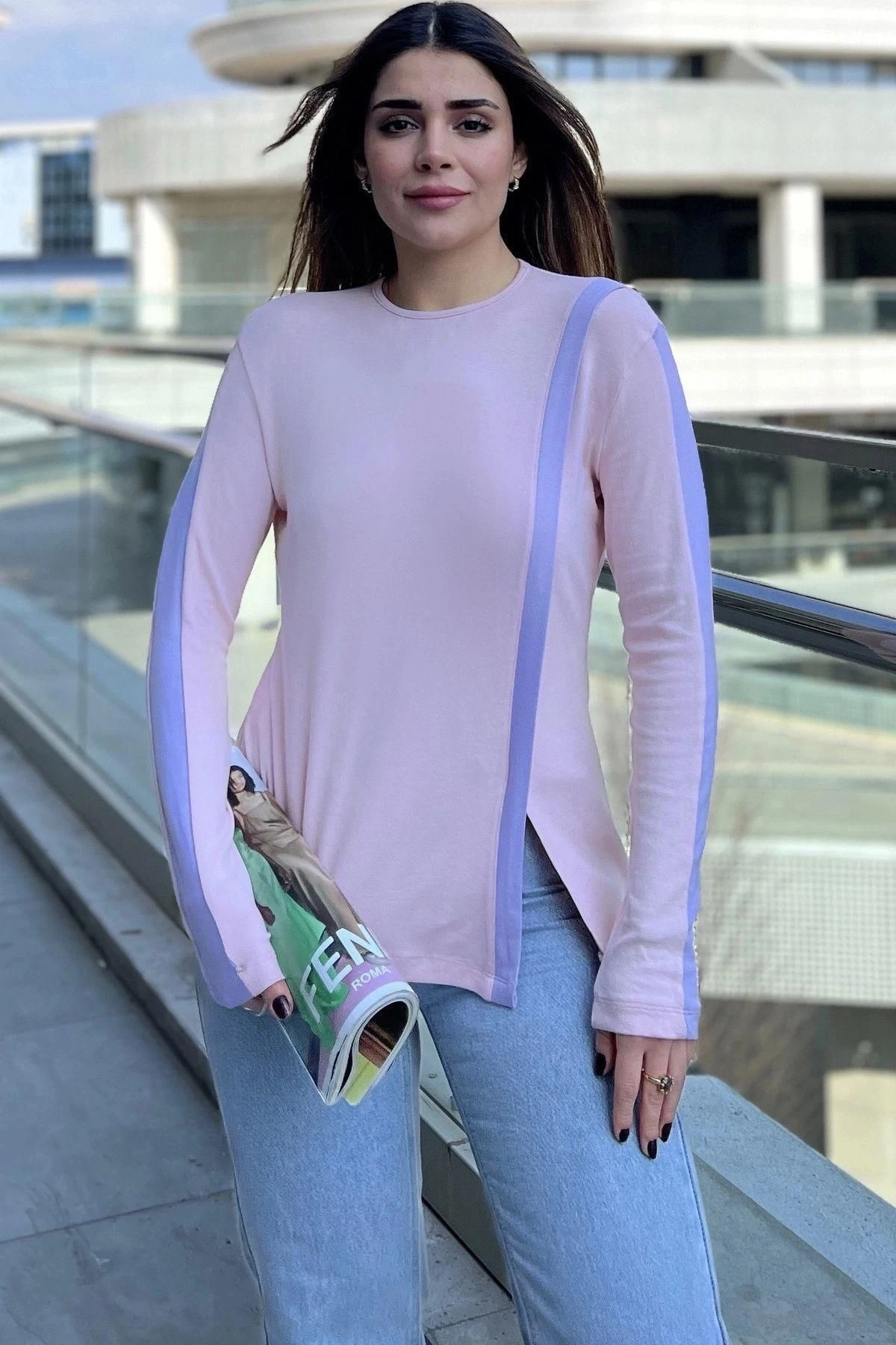 Kadın Pembe Yuvarlak Yaka, Uzun Kol, Şerit Detaylı, Yırtmaçlı Rahat Bluz
