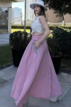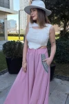 Kadın Pudra Beli Lastikli, Cepleri Hasır İşlemeli, Rahat Kesim, Uzun Kiloş Etek
