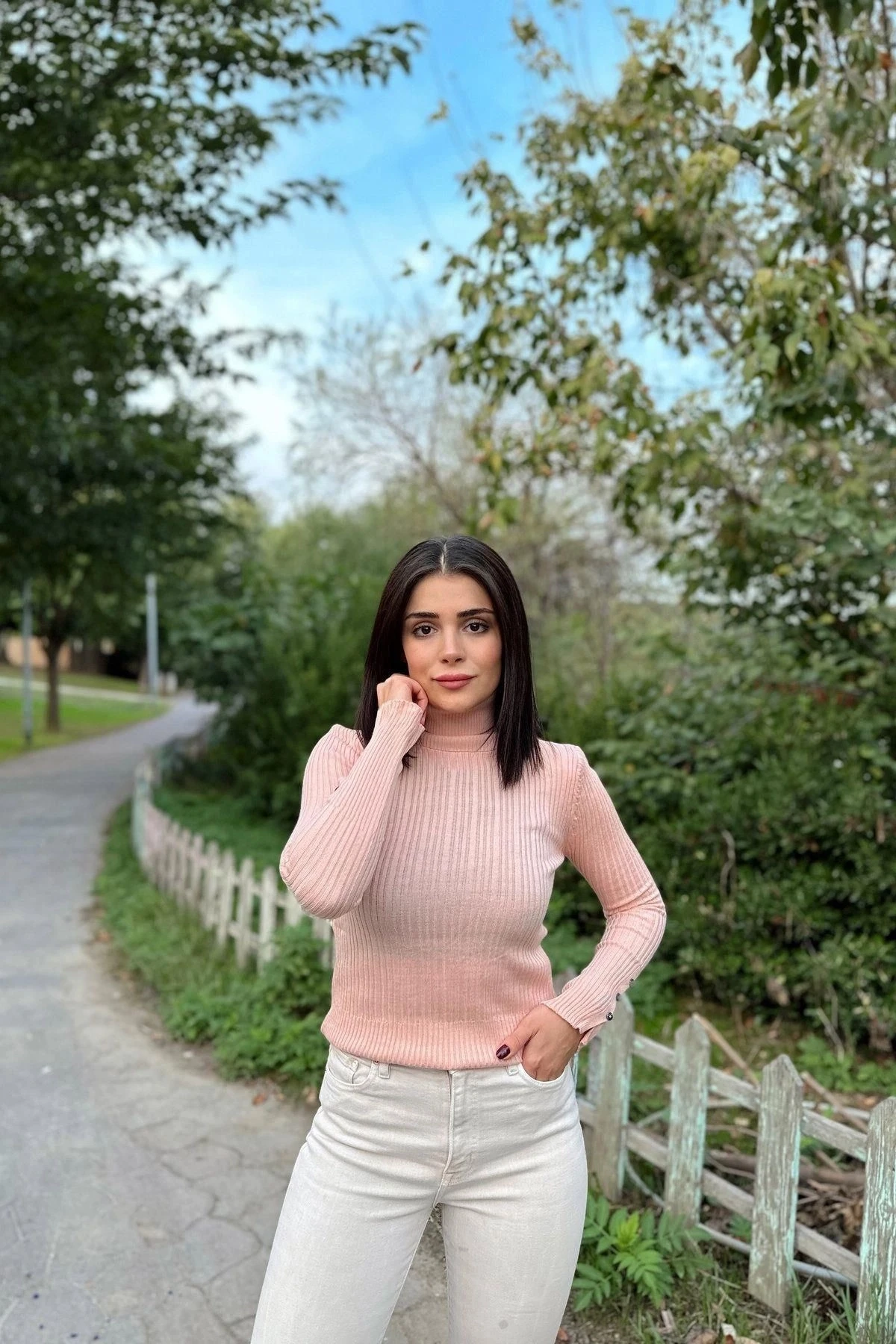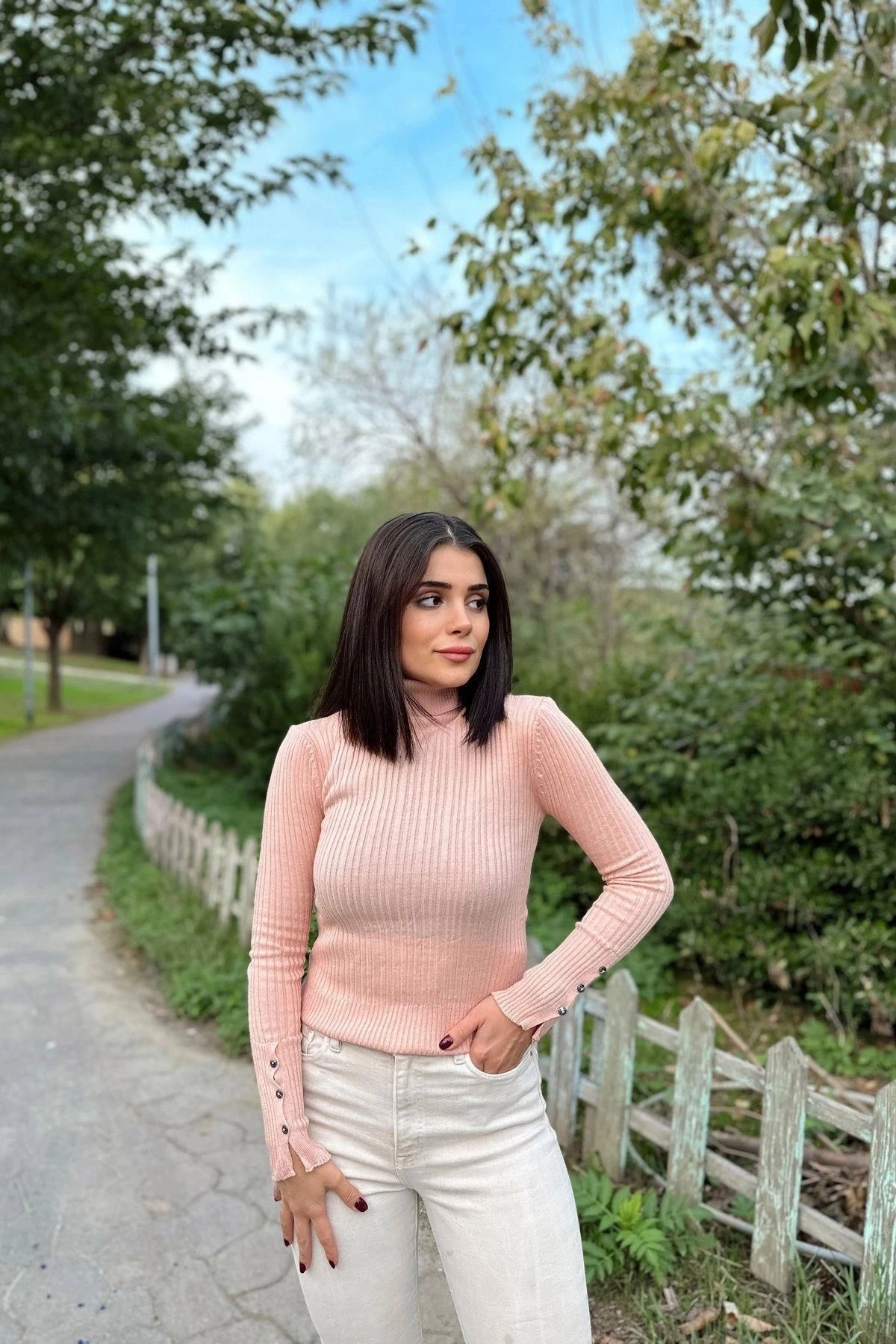 Kadın Pudra Boğazlı Yaka, Uzun Kol, Vucüda Oturan Esnek Kumaş, Düğme Manşet, Düz Desen, Triko Bluz
