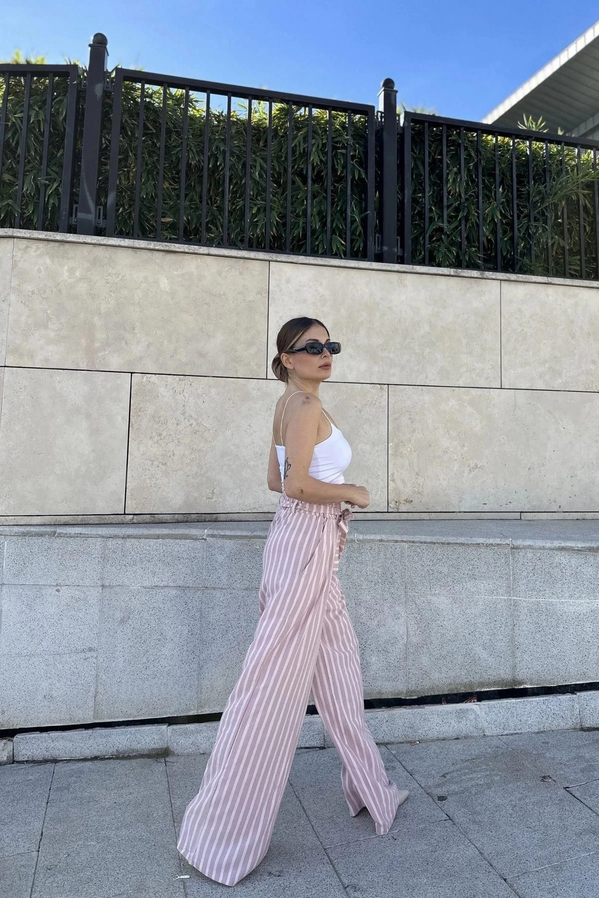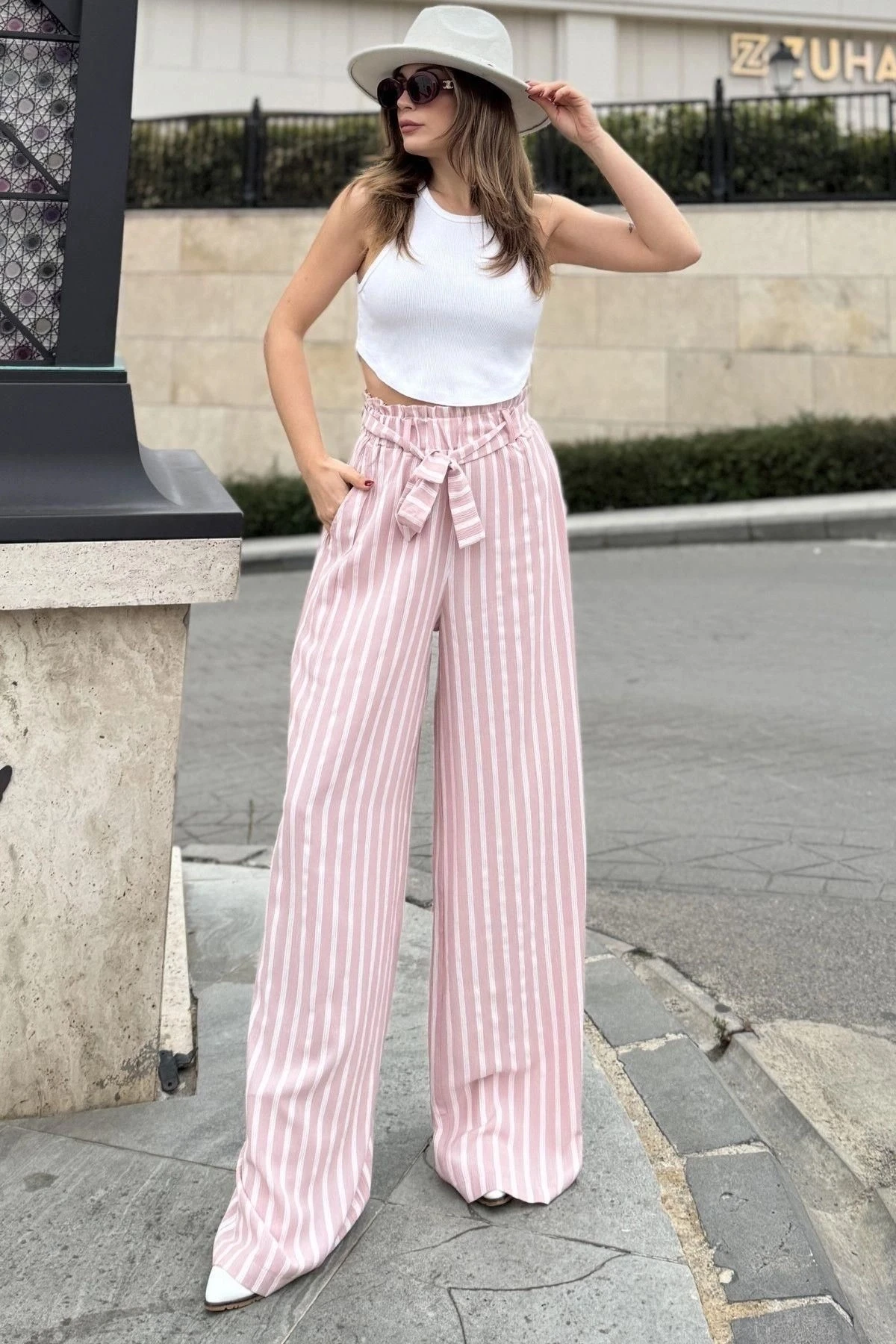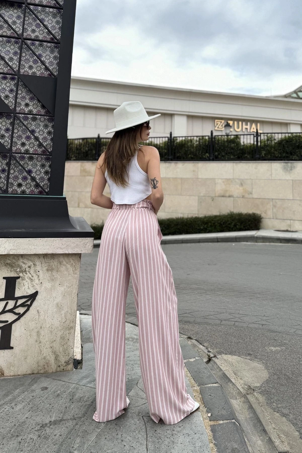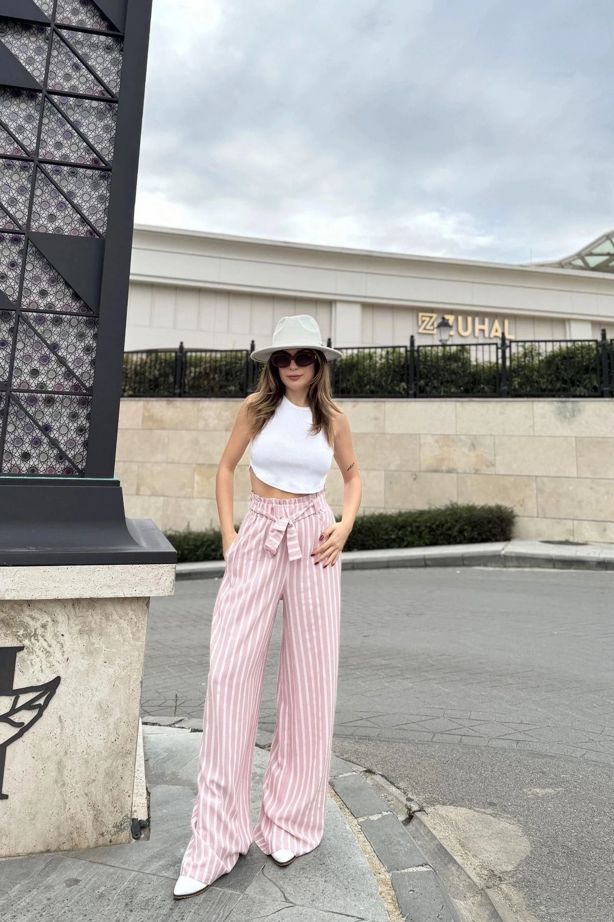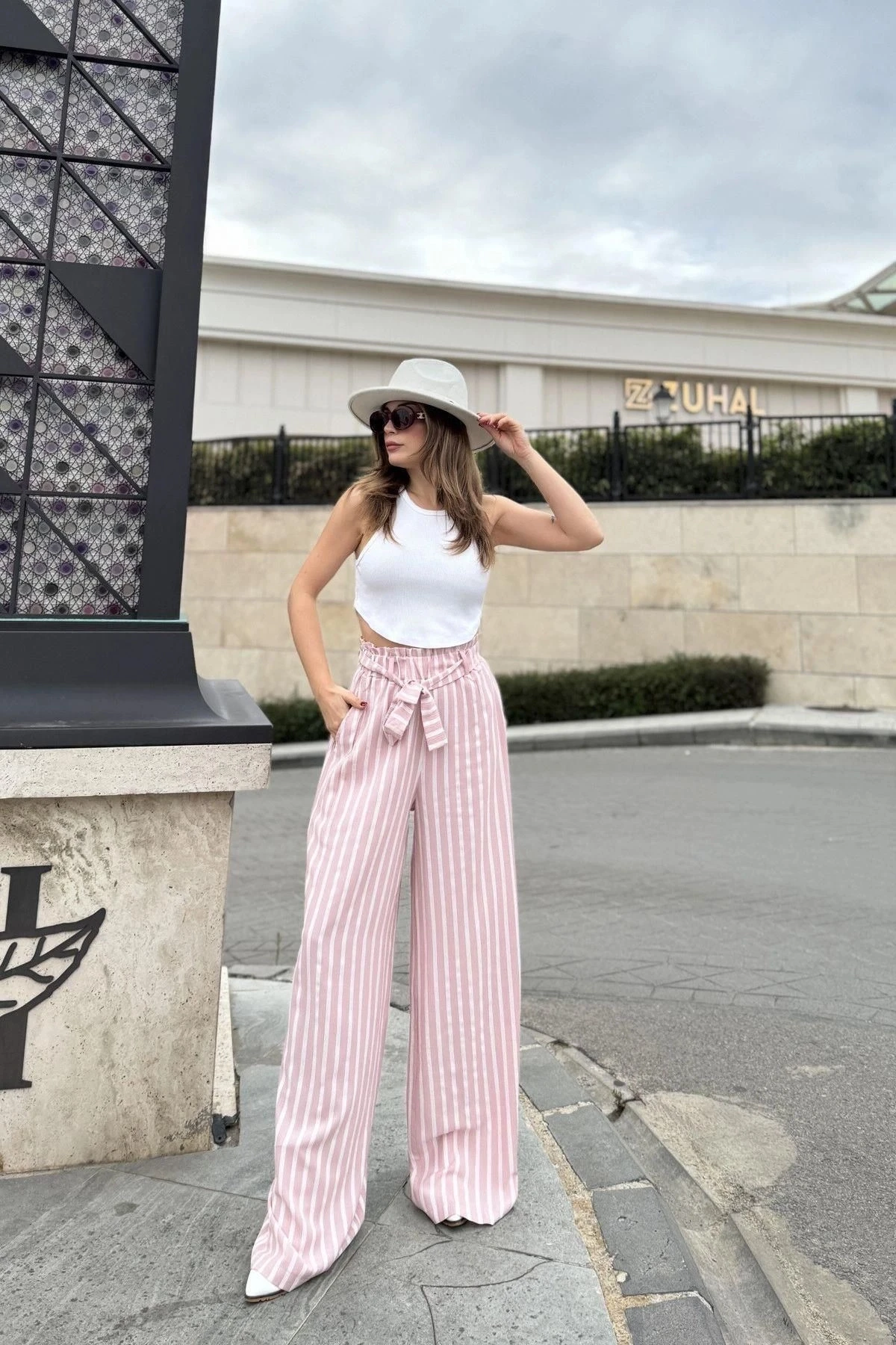 Kadın Pudra Bol Paça, Yüksek Bel, Keten Kumaş, Salaş Kesim, Beli Lastikli, Kemerli Cepli Pantolon