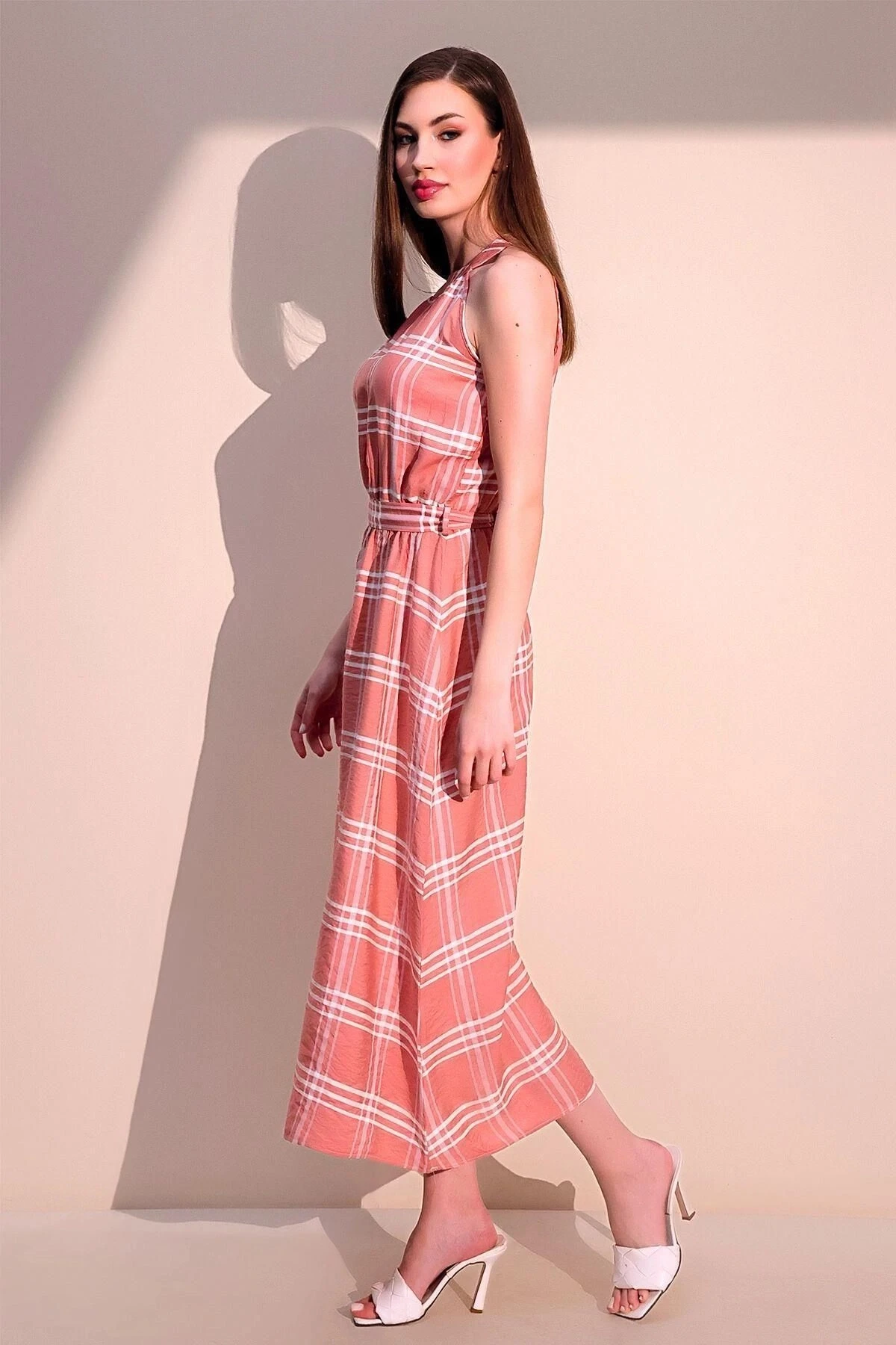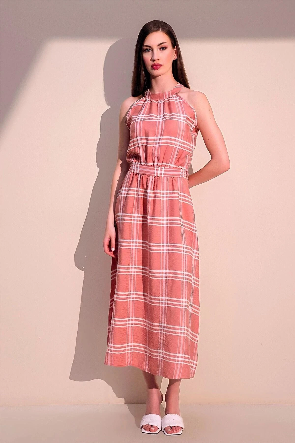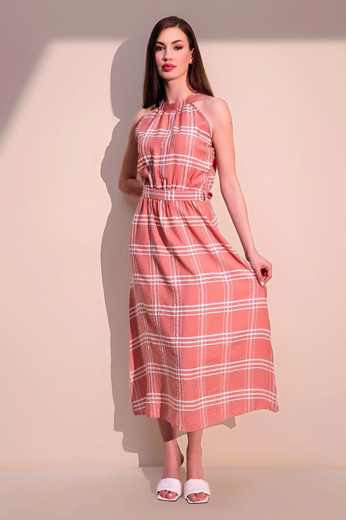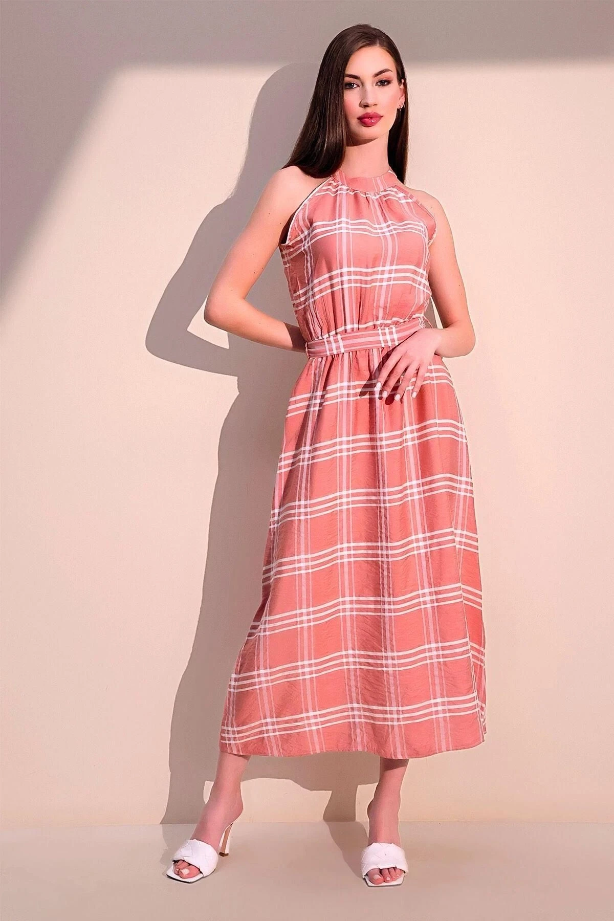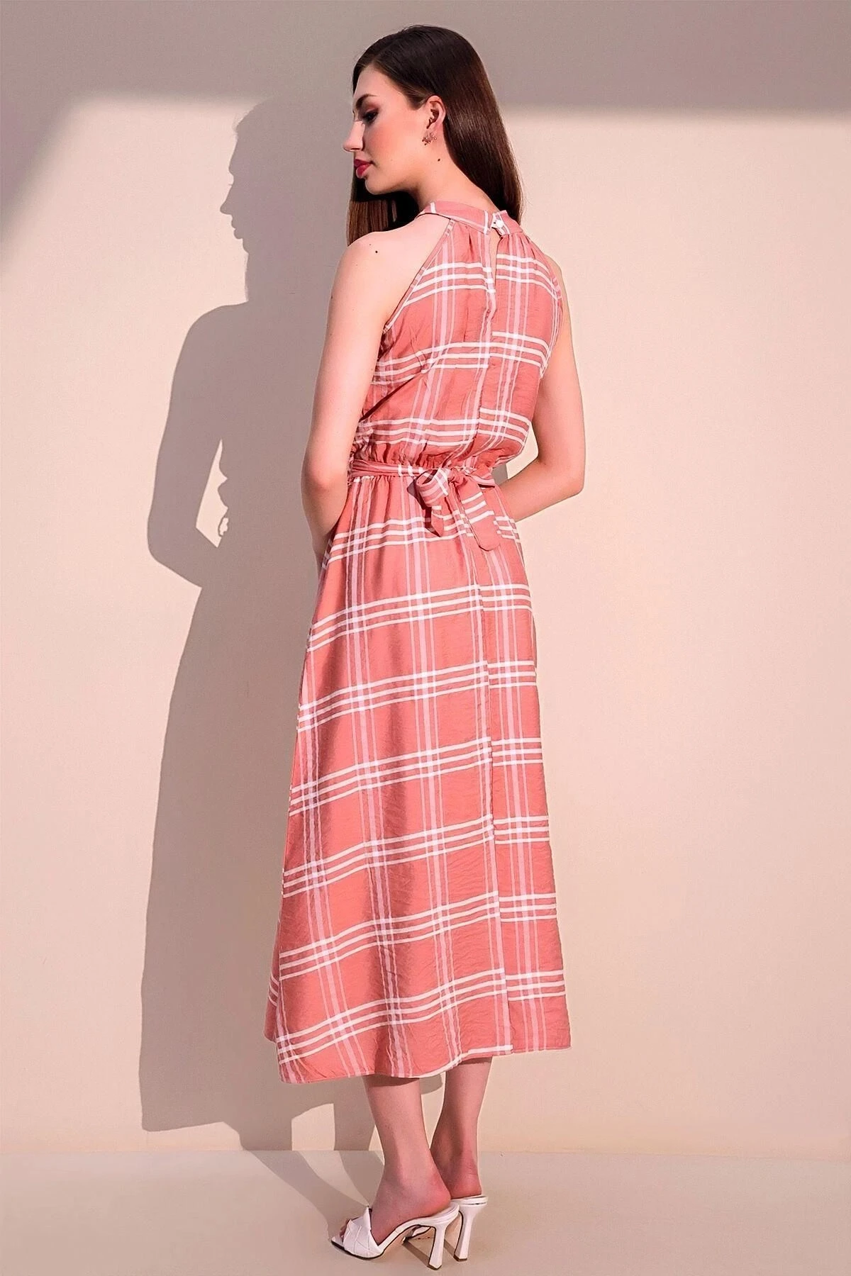 Kadın Pudra Günlük Stil Ekose Desenli Halter Yaka Kendinden Kemerli Uzun Elbise