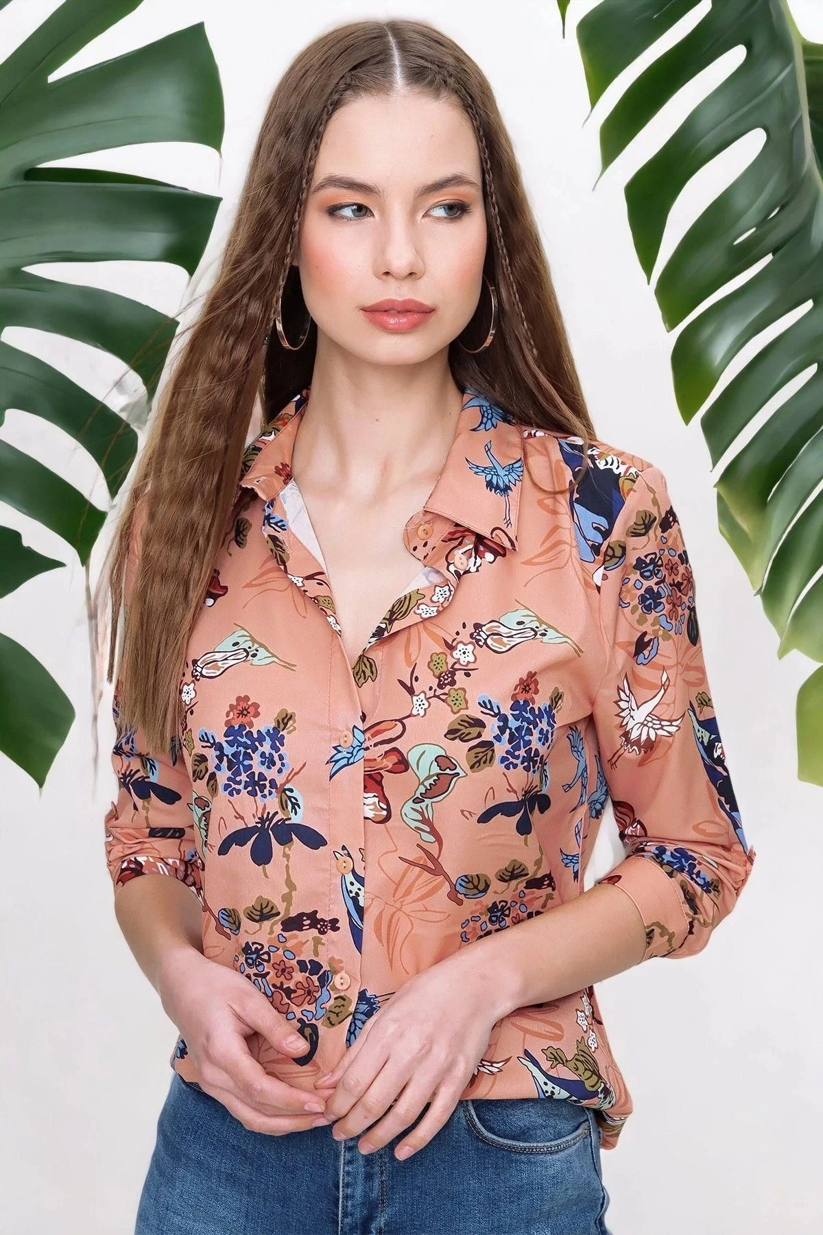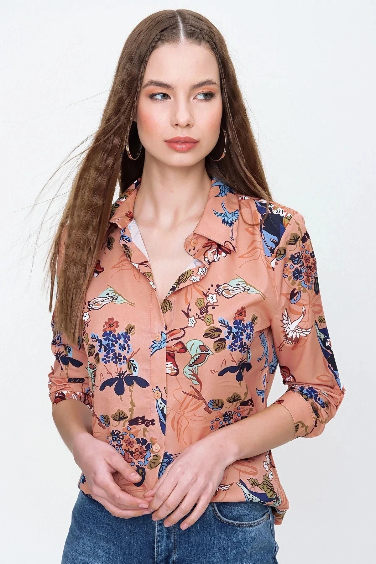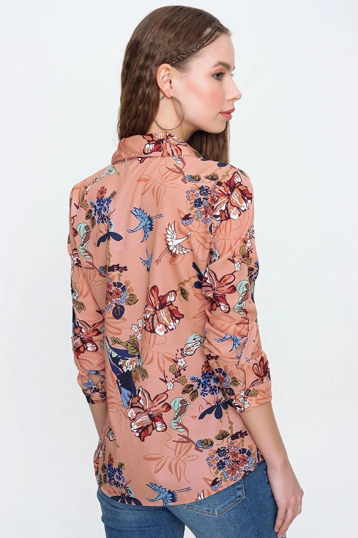 Kadın Pudra Klasik Yaka Çiçek Desenli Uzun Kol Gömlek Regular Kesim Standart Boy