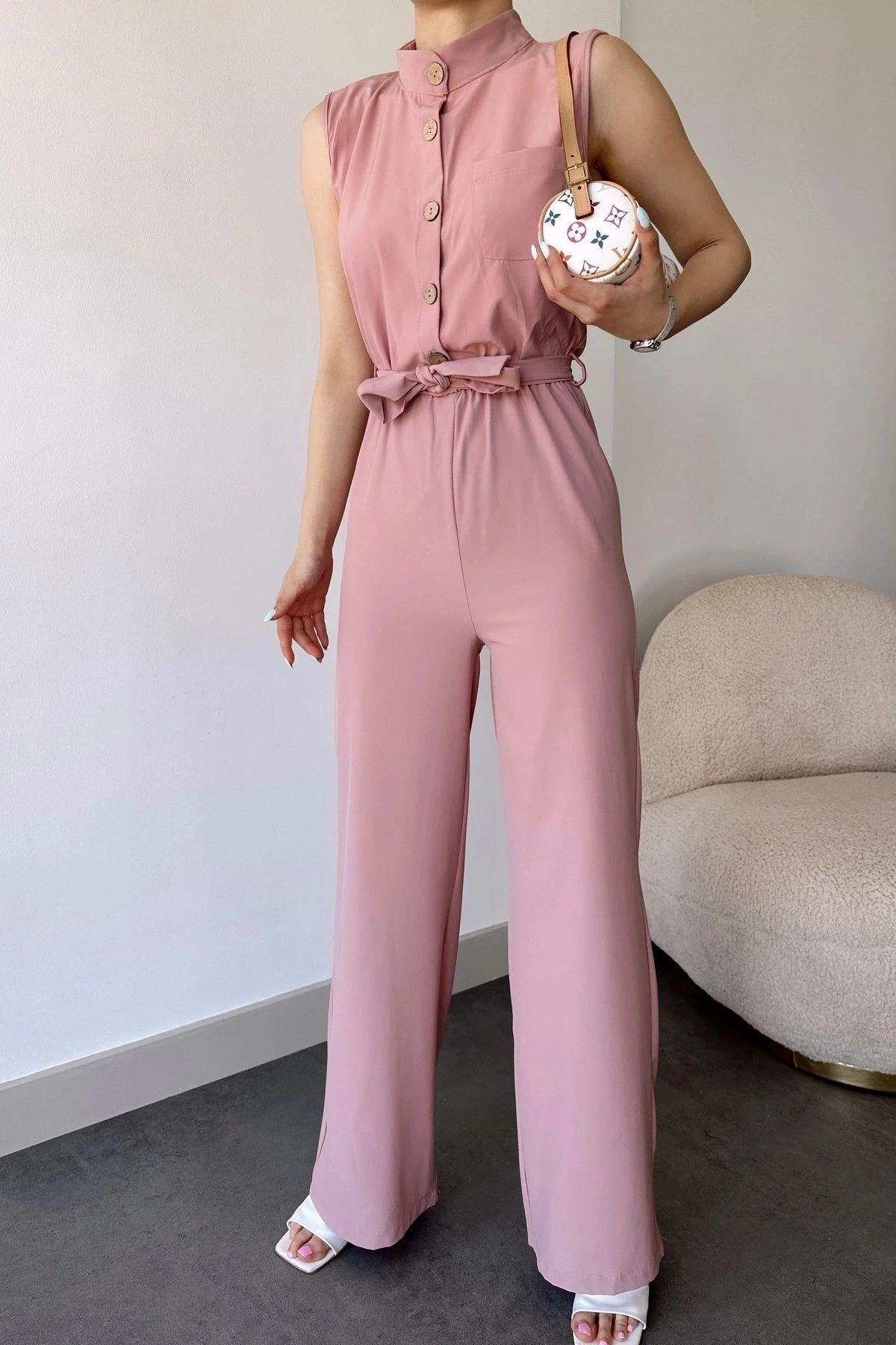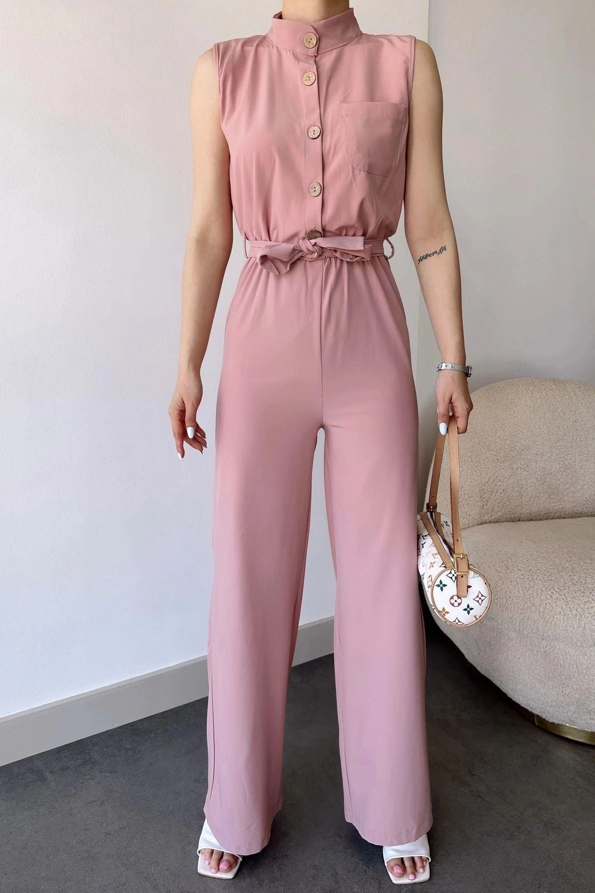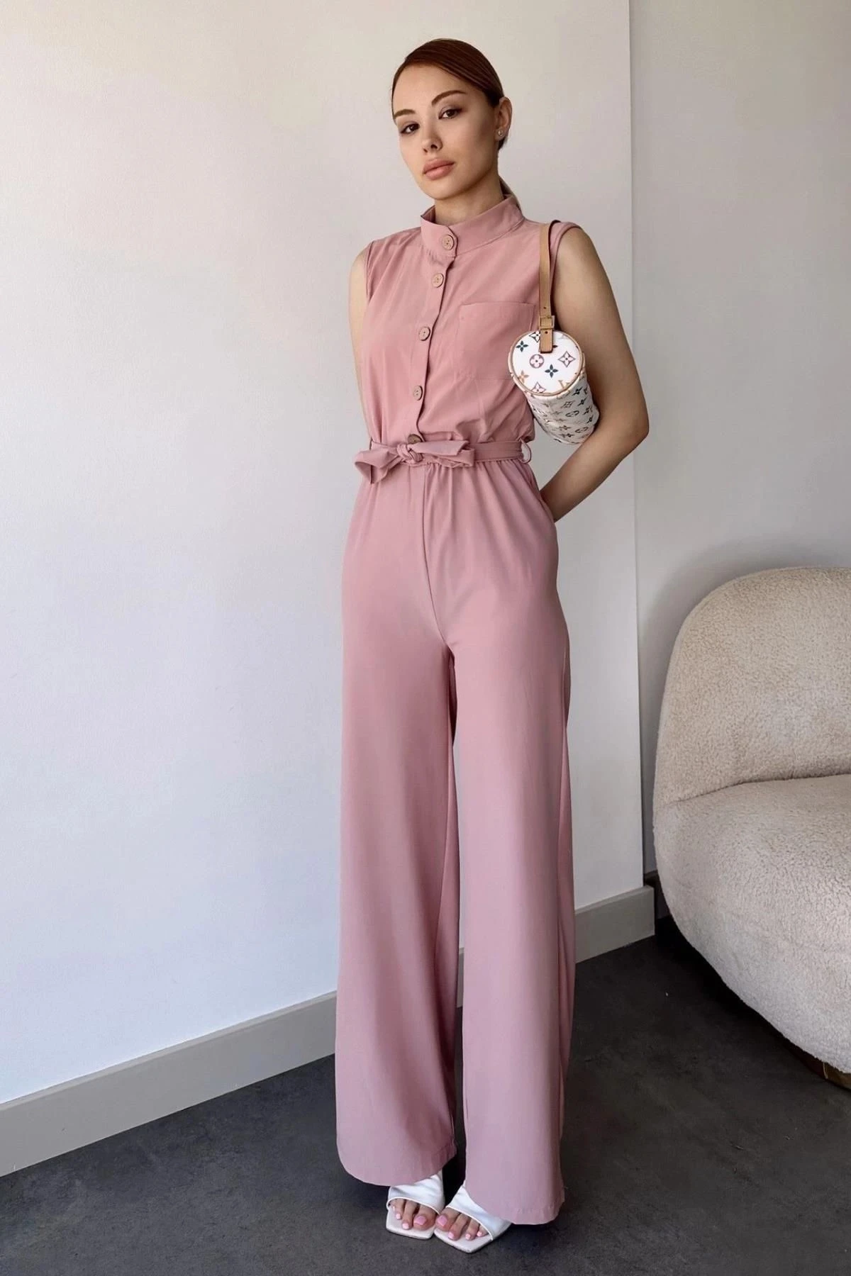 Bu kadın pudra kolsuz dik yaka kuşaklı uzun tulum, şıklığı ve rahatlığı bir arada sunuyor.; Elbisenin kumaşı %95 polyester ve %5 elastan karışımından oluşur.; Bu karışım, tulumun esnekliğini artırırken aynı zamanda dayanıklılığını da sağlar.; Dik yaka tasarımı, tulumun modern ve şık bir görünüm kazanmasını sağlar.; Düz deseni, sade ve minimalist bir tarz sunar.; Pudra rengi, zarif ve pastel tonlarıyla uyumlu bir seçenektir.; Tek cepli detay, tulumun şıklığını tamamlar ve kullanışlı bir özelliğe sahiptir.; Standart kalıp ve kesimi, tulumun vücuda hoş bir şekilde oturmasını ve hareket özgürlüğü sağlar.; Aerobin kumaşı, hafif ve nefes alabilir bir yapıya sahiptir, böylece tulumu rahatlıkla giyebilirsiniz.; Kuşak detayı, tulumun bel bölgesinde bulunur ve beli vurgular.; Bu detay, tulumun şeklini ayarlamak ve size özgü bir uyum sağlamak için kullanılabilir.; Bu pudra kolsuz dik yaka kuşaklı uzun tulum, şıklık ve rahatlık arayan kadınlar için mükemmel bir seçimdir.; %95 polyester ve %5 elastan karışımıyla, tulum esneklik ve dayanıklılık sunar.; Düz deseni ve pudra rengiyle sade ve zarif bir görünüm sağlar.; Dik yaka tasarımı, tulumu modern ve şık bir hale getirir.; Tek cepli detay, şıklık ve kullanışlılık sağlar.; Standart kalıp ve kesimi, vücuda hoş bir şekilde oturur ve hareket özgürlüğü sağlar.; Aerobin kumaşıyla hafiflik ve nefes alabilirlik sunar.; Kuşak detayı, tulumun bel bölgesini vurgular ve size özgü bir uyum sağlar.; Bu tulum, günlük kullanımdan özel etkinliklere kadar birçok farklı durumda tarzınızı tamamlamak için idealdir.; Gardırobunuzun vazgeçilmez bir parçası olacak.