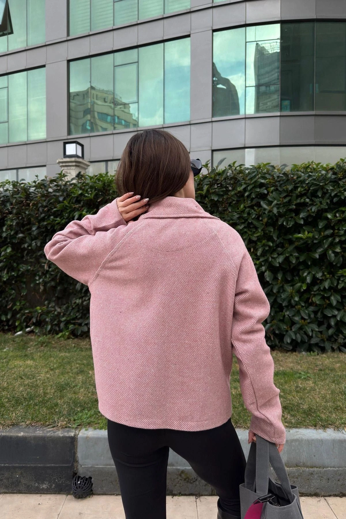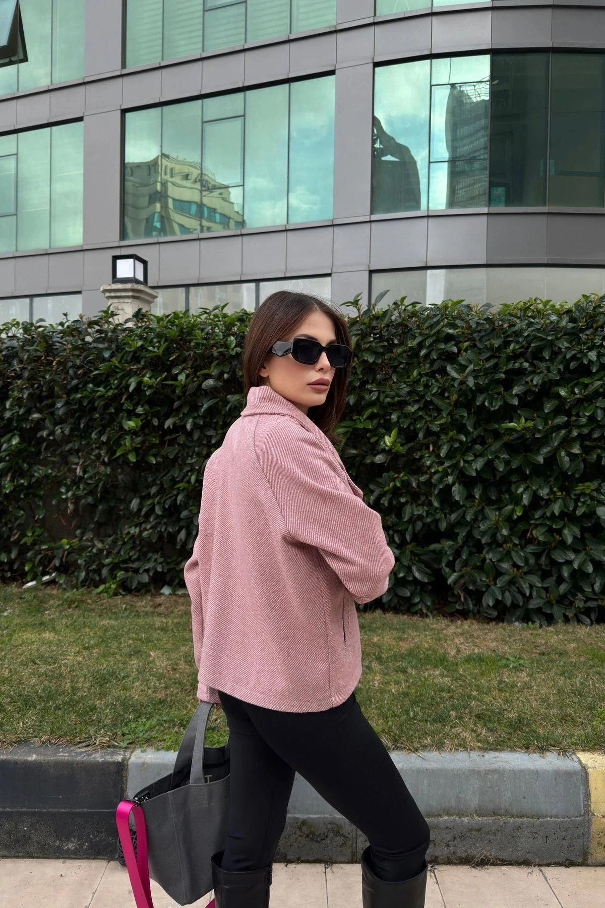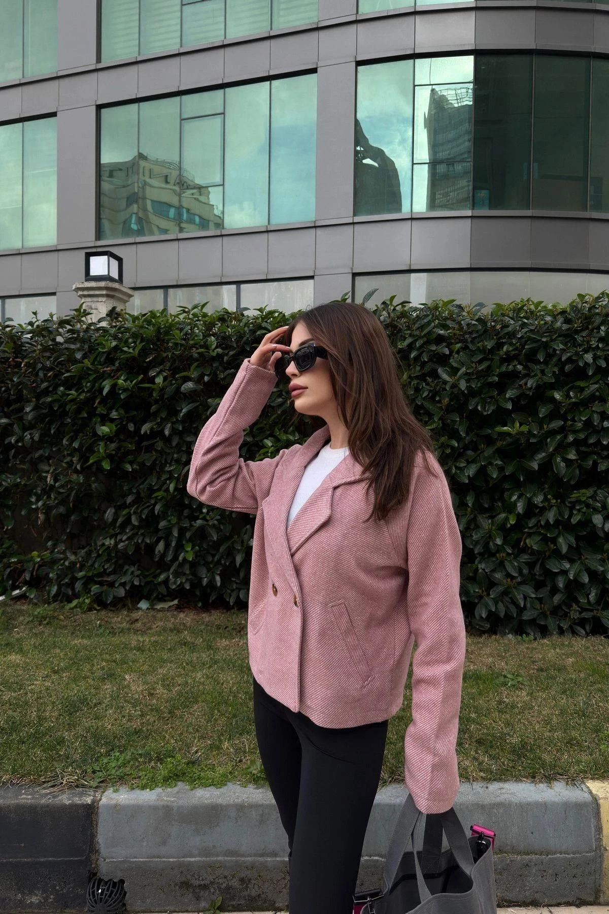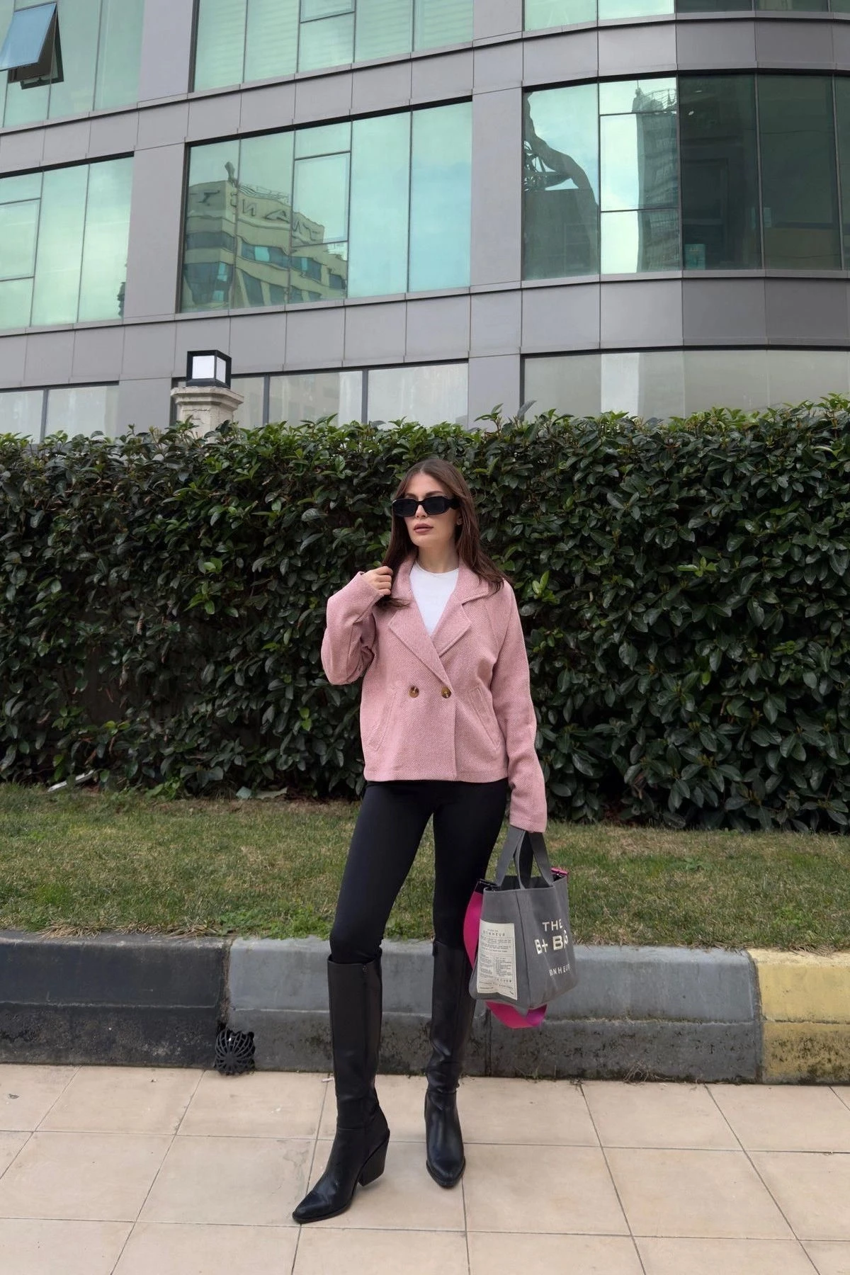 Kadın Pudra Kruvaze Yaka, Çift Düğme, Rahat Kalıp, Fitilli Kaşe Kumaş Ceket