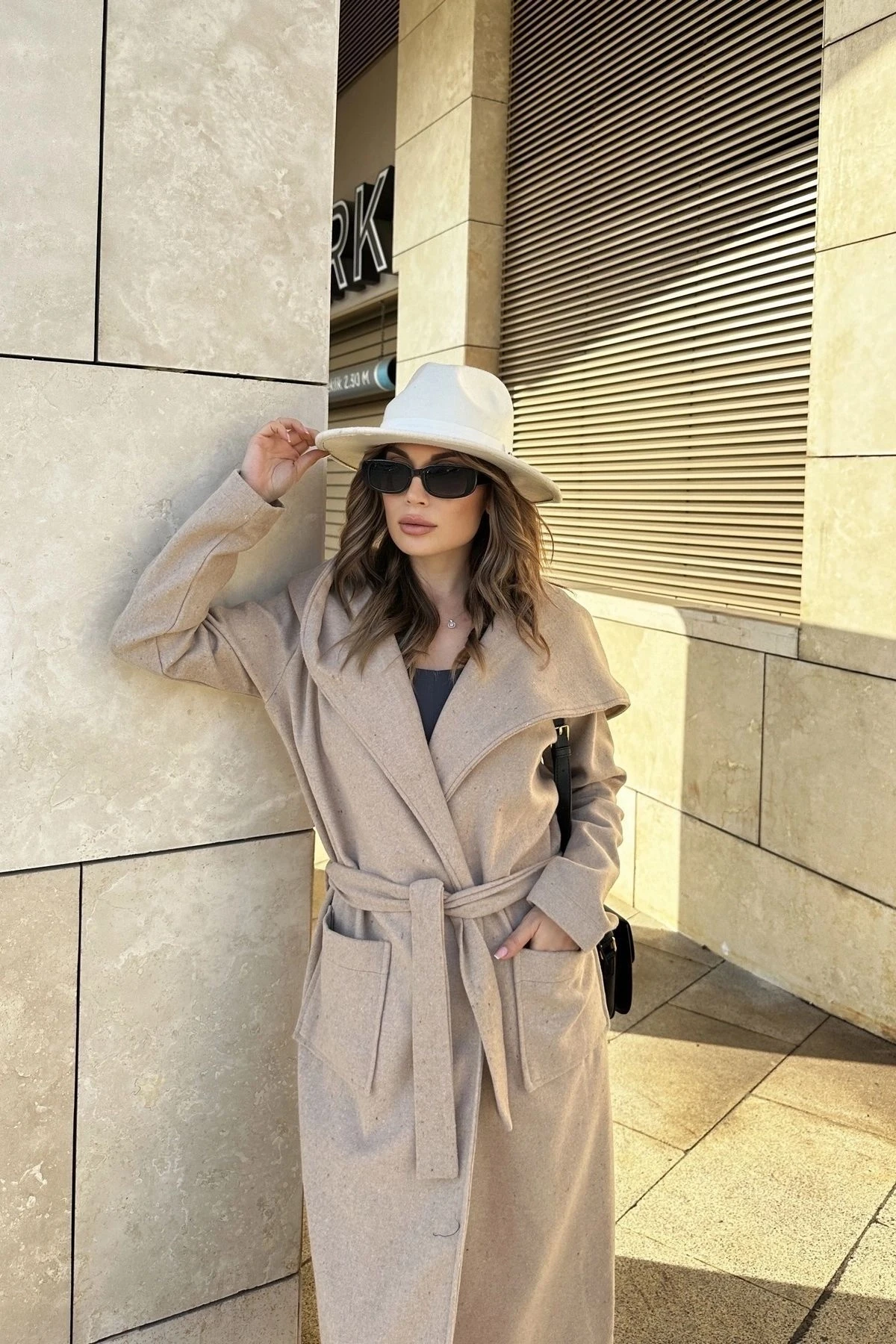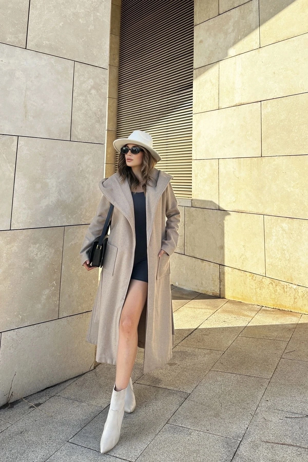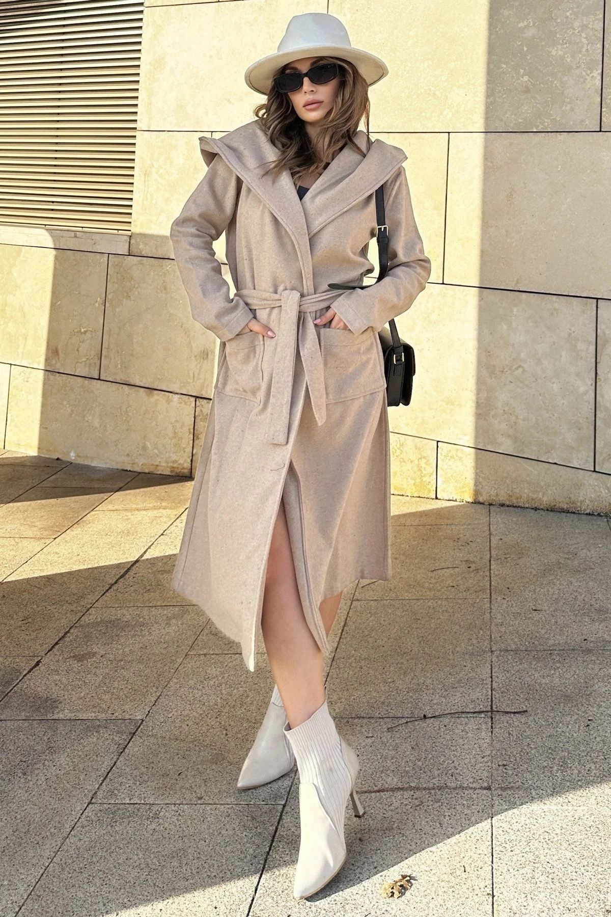 Kadın Pudra Tonlu Kruvaze Yaka, Kapüşonlu, Çift Cepli, Beli Kemerli, Uzun Kaşe Kaban (ASTARSIZ)