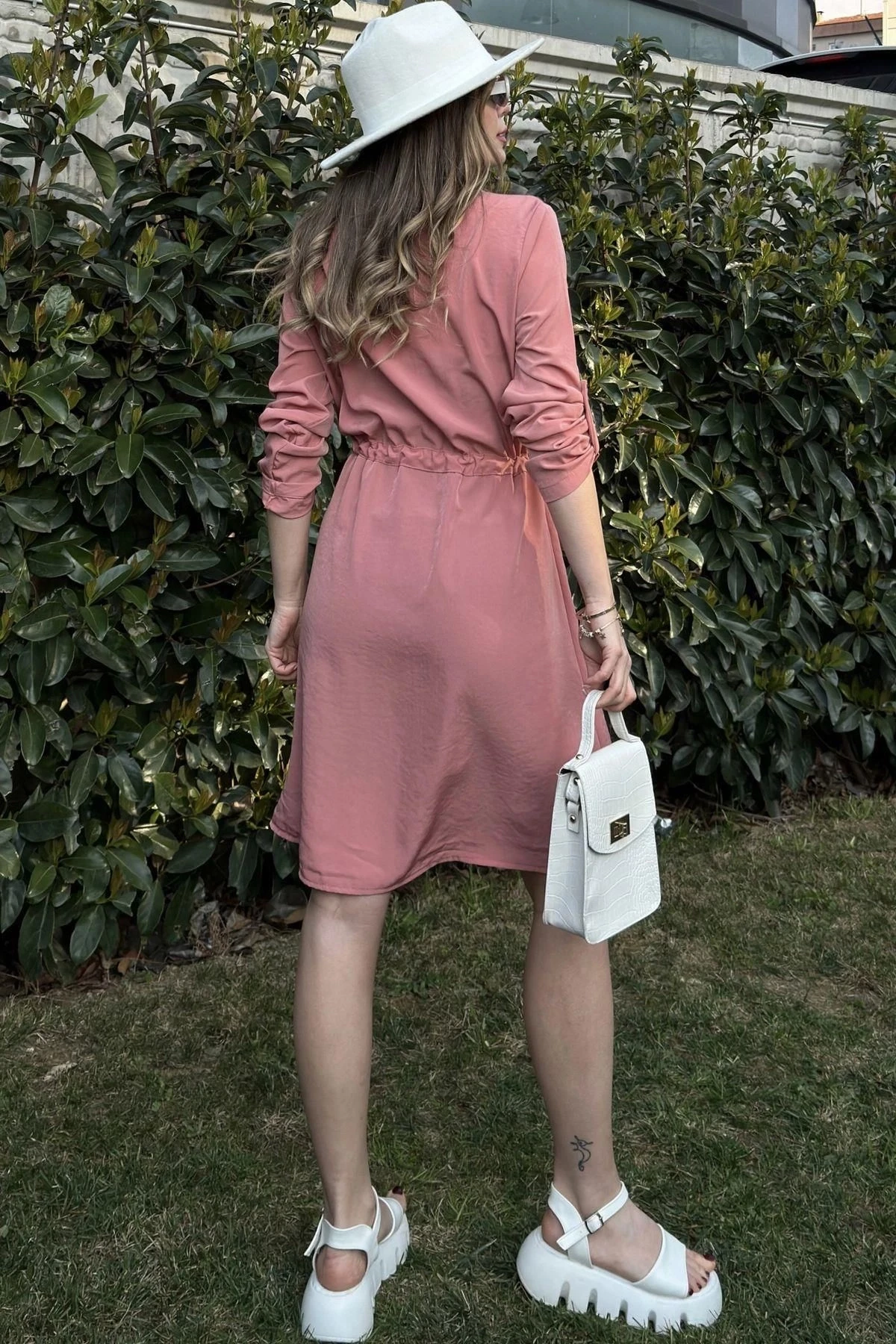 Kadın Pudra Uzun Kol, Derin Gömlek Yaka Beli Bağlamalı Cepli Önü Düğmeli, A Kesim Salaş Elbise