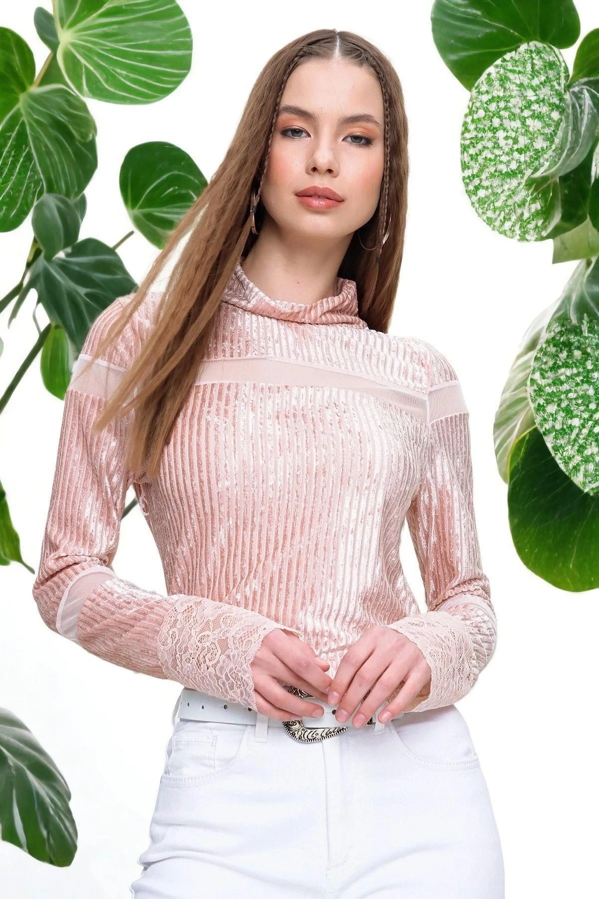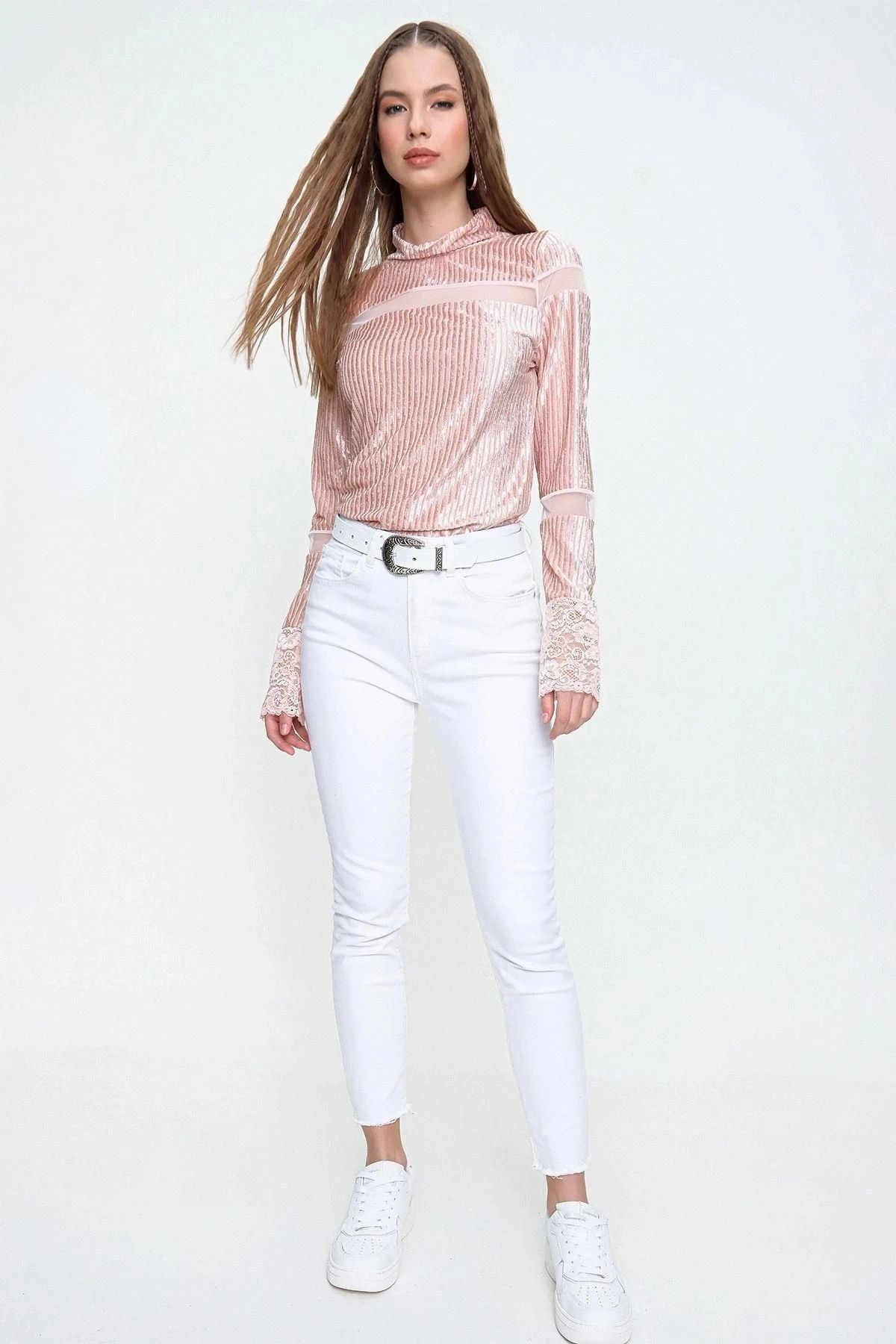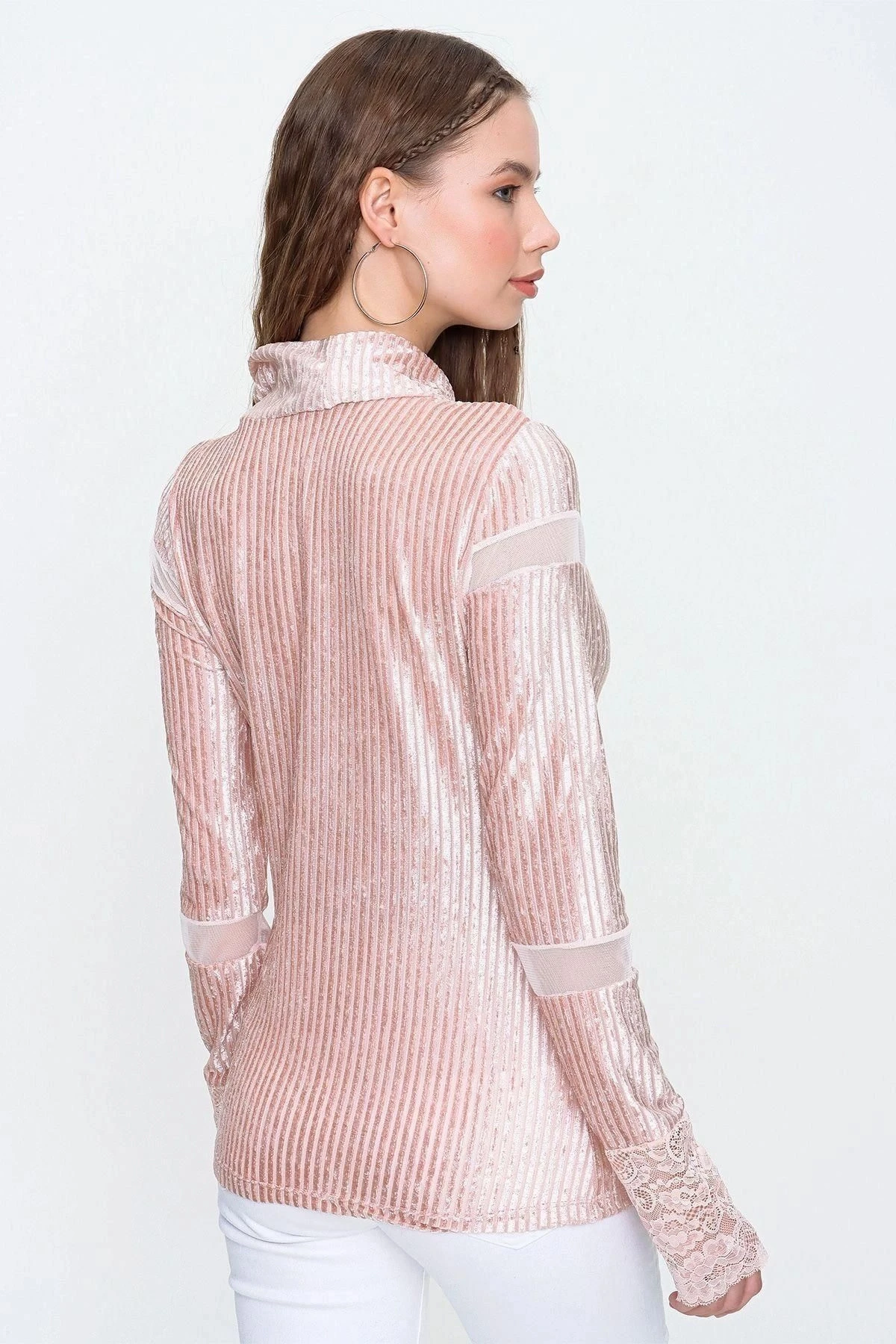 Bu muhteşem bluz, stil ve rahatlığı bir araya getiriyor.; Pudra renkteki tasarımıyla öne çıkan bu bluz, uzun kollu ve boğazlı kesimiyle şıklığını tamamlıyor.; Üstelik, tül detayları ve yumuşak dokulu kadife kumaşıyla da dikkat çekiyor.; Kumaş içeriği %95 polyester ve %5 elastan olan bu bluz, mükemmel bir uyum ve hareket özgürlüğü sunar.; Polyester, kumaşın dayanıklılığını artırırken, elastan ise esneklik sağlar.; Böylece, bluzun vücudunuza kusursuz bir şekilde oturmasını sağlar.; Pudra rengi, her mevsimde ve her ortamda şık bir seçimdir.; Bu nötr ton, diğer renklerle kolayca kombinlenir ve farklı tarzlara uyum sağlar.; Hem gündüz hem de gece giyilebilecek bir parça olan bu bluz, gardırobunuzun vazgeçilmez bir parçası olacak.; Bluzun tasarımında düz kesim tercih edilmiştir.; Bu kesim, sade ve minimalist bir görünüm sunar.; Aynı zamanda standart boyda olan bluz, her bedene uyum sağlar.; Rahat ve şık bir stil arayanlar için ideal bir seçenektir.; Tül detayları, bluza zarif bir dokunuş katarken, kadife kumaşın yumuşak dokusu da kullanıcıya lüks bir his verir.; Bu kombinasyon, bluzu özel kılmakla birlikte, dikkat çekici bir tarz yaratır.; Bu muhteşem bluz, herhangi bir şıklık arayan kadının gardırobunda yer alması gereken bir parçadır.; Şık tasarımı, yüksek kaliteli kumaşı ve rahat kesimiyle sizin için mükemmel bir seçim olacak.; Herhangi bir özel etkinlik veya günlük kullanım için idealdir.; Bu bluzu giyerek tarzınızı ve kendinizi öne çıkarın!
