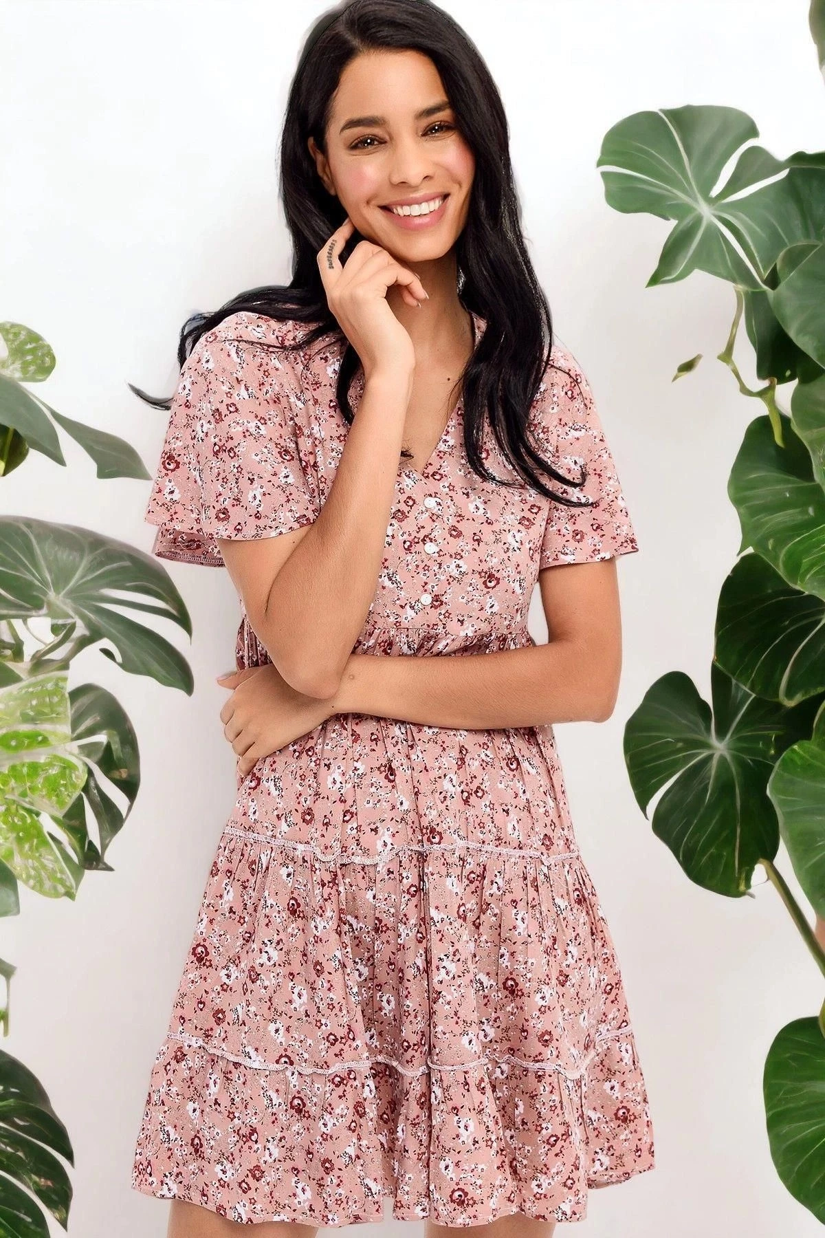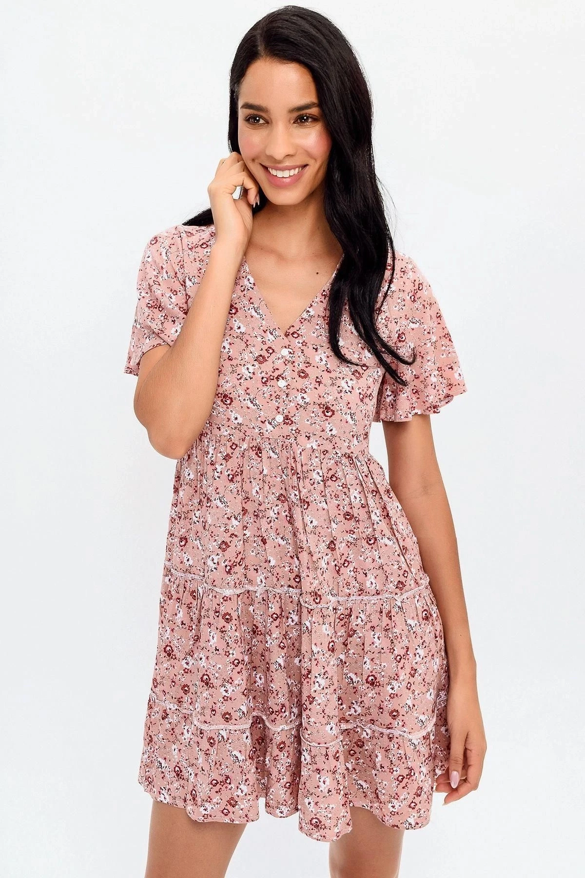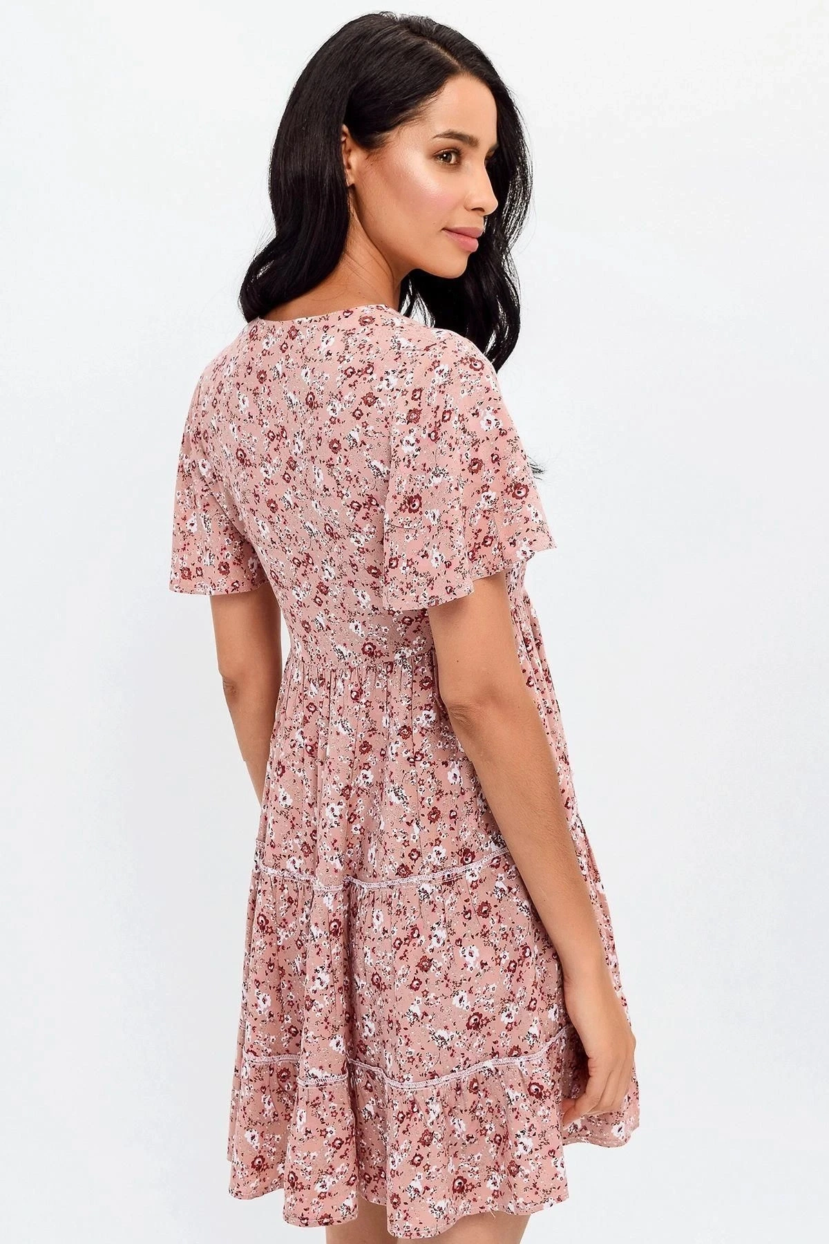 Bu göz alıcı elbise, moda dünyasının en son trendlerinden ilham alan özel bir tasarımdır.; Pudra rengi, zarifliği ve şıklığıyla öne çıkan bir seçimdir.; V yaka detayı, feminen bir tarz sunarken, kısa kollu kesimi ise rahatlık ve hareket özgürlüğü sağlar.; Elbisenin desenleri, benzersiz bir karakter katmak için özenle seçilmiştir.; Katlı detaylar, vücuda hoş bir şekil verir ve silueti mükemmel bir şekilde vurgular.; Regular kesimi, her bedene uyum sağlar ve kullanıcılara rahat bir giyim deneyimi sunar.; Midi boyu, diz üstünde biten şık bir uzunluktur ve ofis ortamında da günlük hayatta da şık ve profesyonel görünmenizi sağlar.; Kumaş içeriği, %60 polyester ve %40 pamuktan oluşur, böylece rahatlıkla nefes alabilir ve uzun süreli kullanımlarda bile konforunuzu koruyabilirsiniz.; Bu elbise, herhangi bir iş görüşmesi, toplantı veya özel etkinlik için mükemmel bir seçenektir.; İster ofis şıklığı arayışında olun, ister günlük hayatta stilinizi yansıtmak isteyin, bu elbise size şık ve güven veren bir görünüm sunacaktır.; Kumaş kalitesi, renk ve tasarım detaylarıyla, bu elbise koleksiyonunuzda özel bir yere sahip olacak.