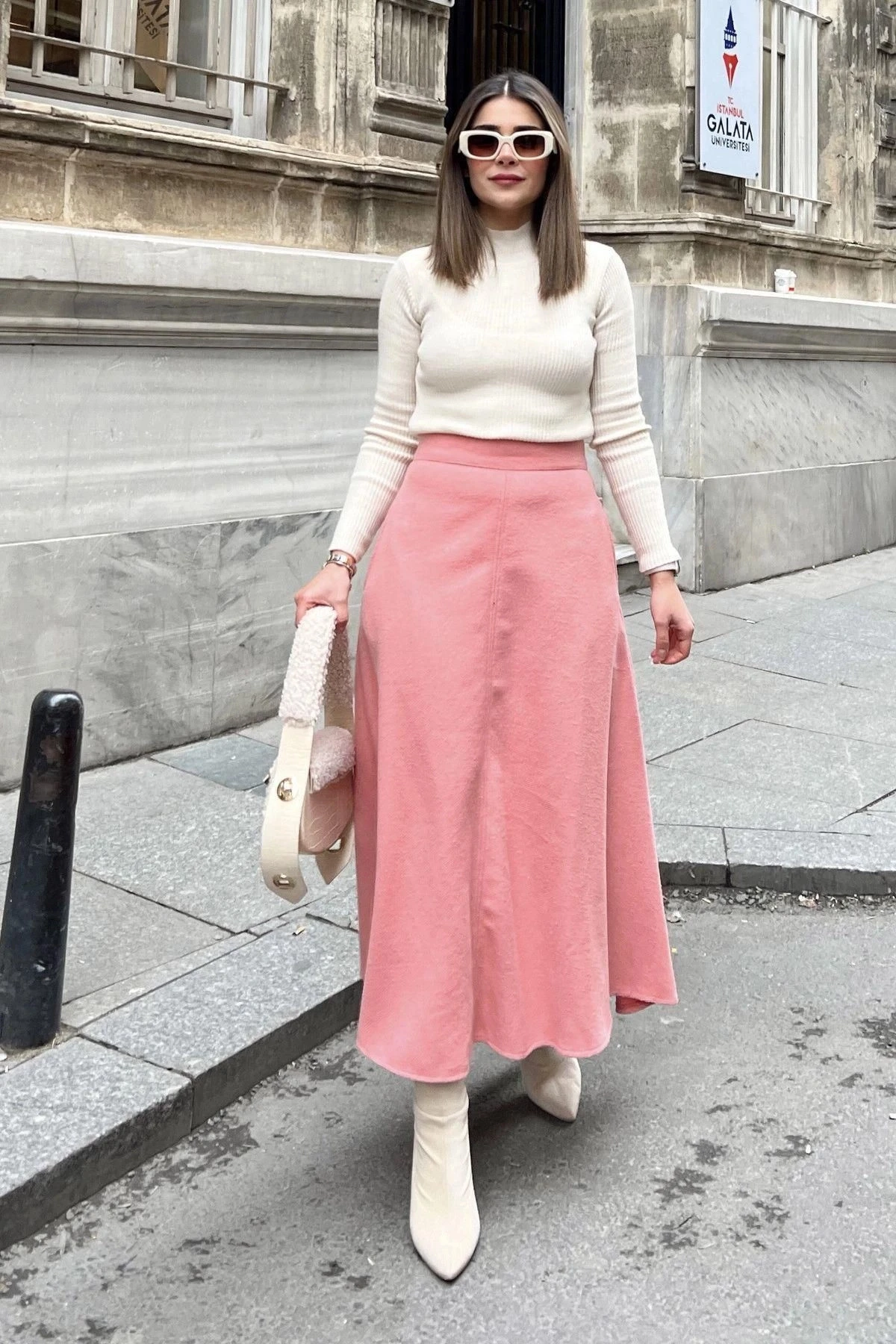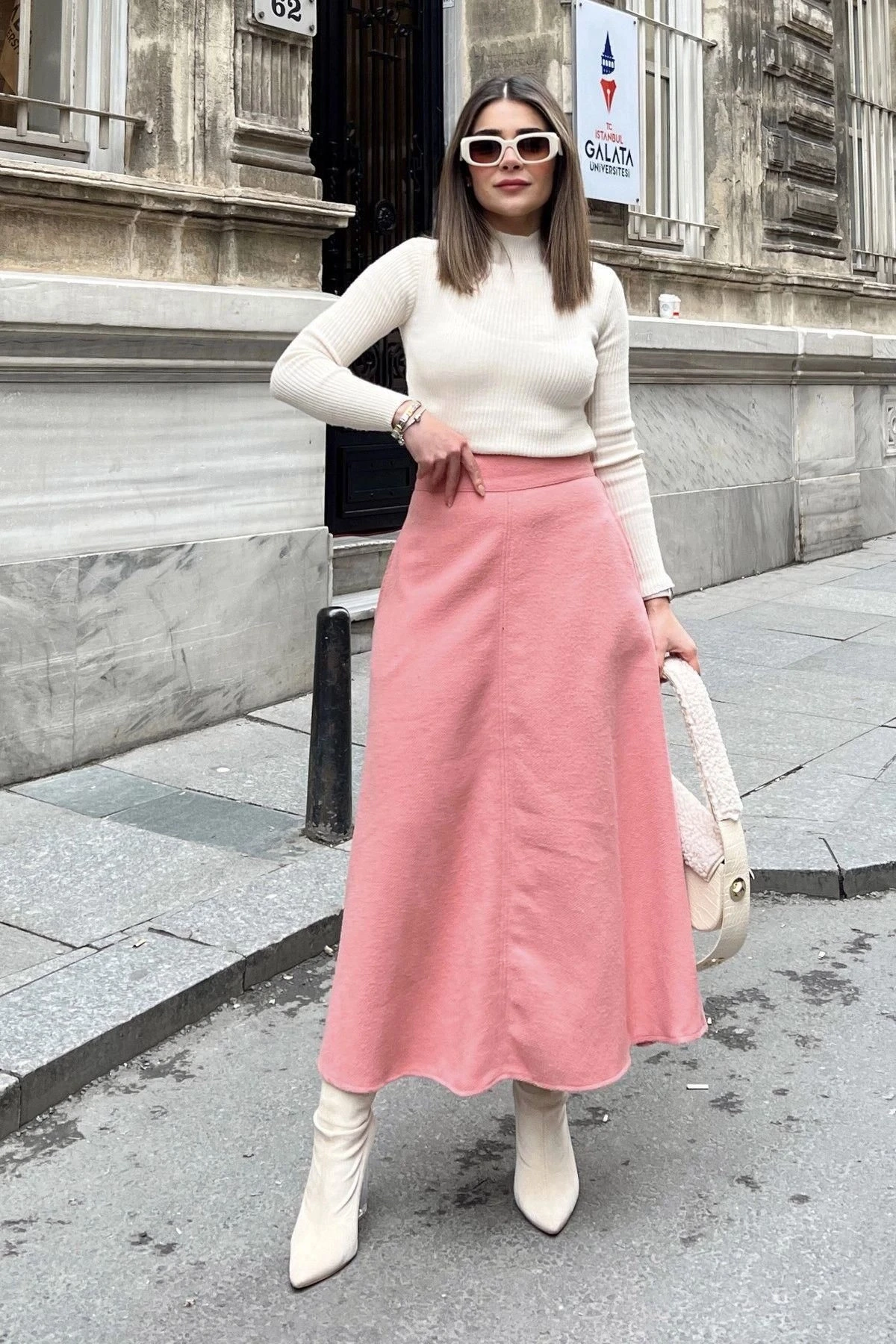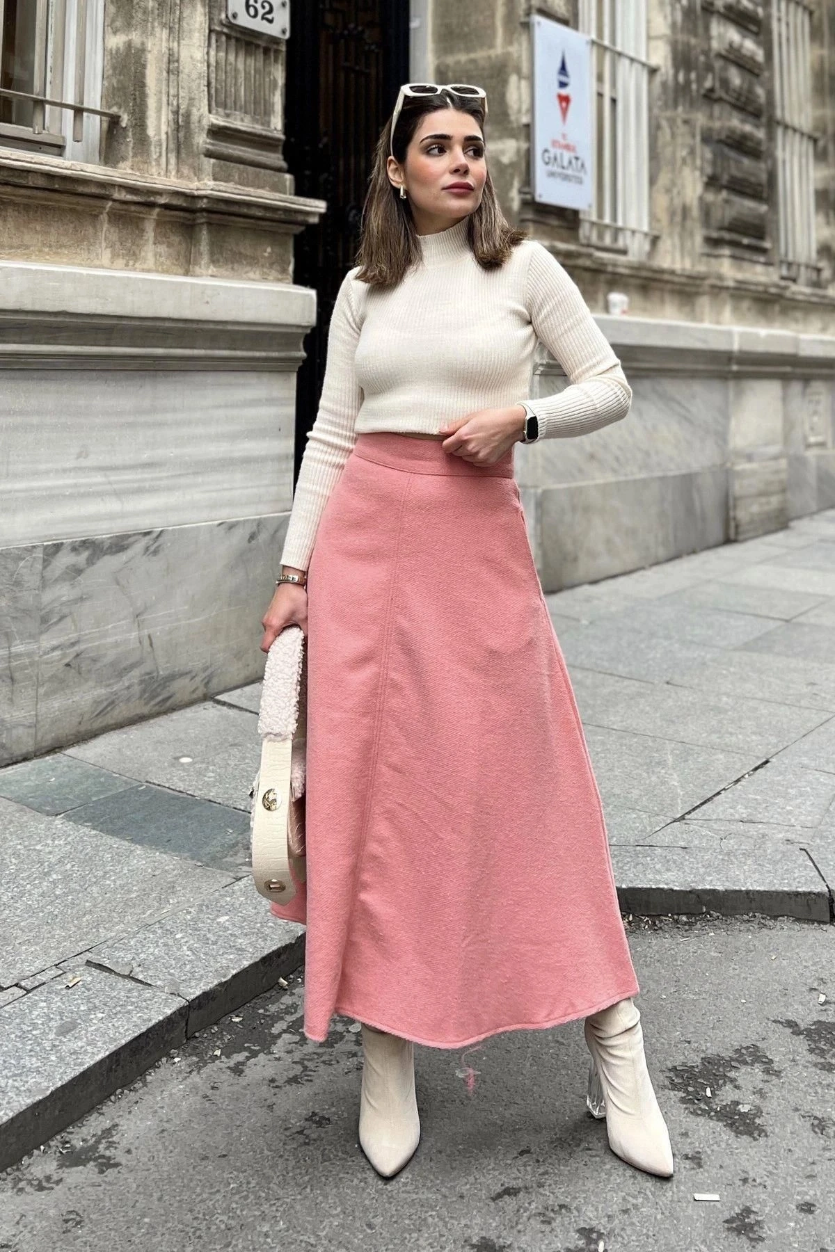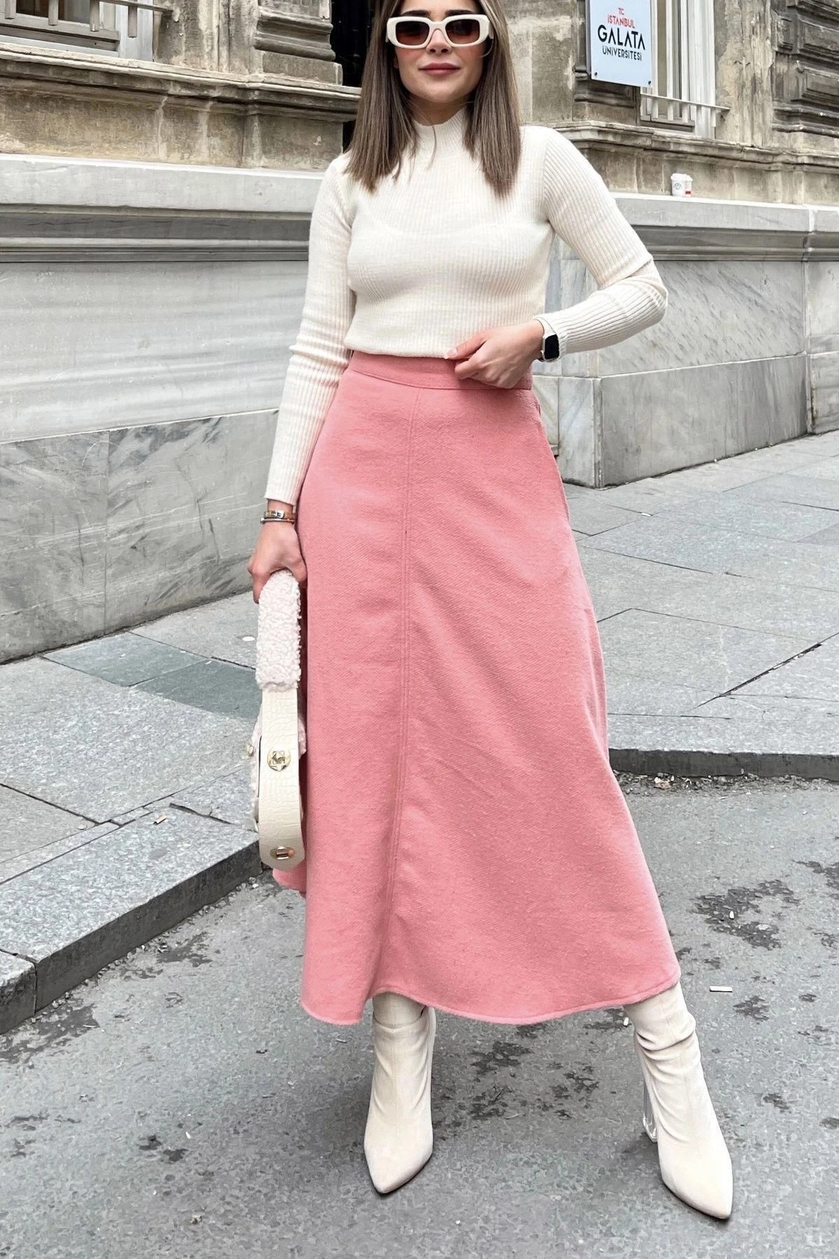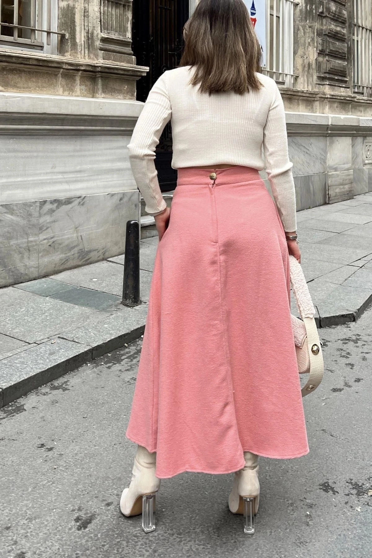 Kadın pudra Yüksek Bel, Cepli, Uzun, Fitilli Kaşe Kumaş, Maksi Kiloş Etek (Dar Kalıp)