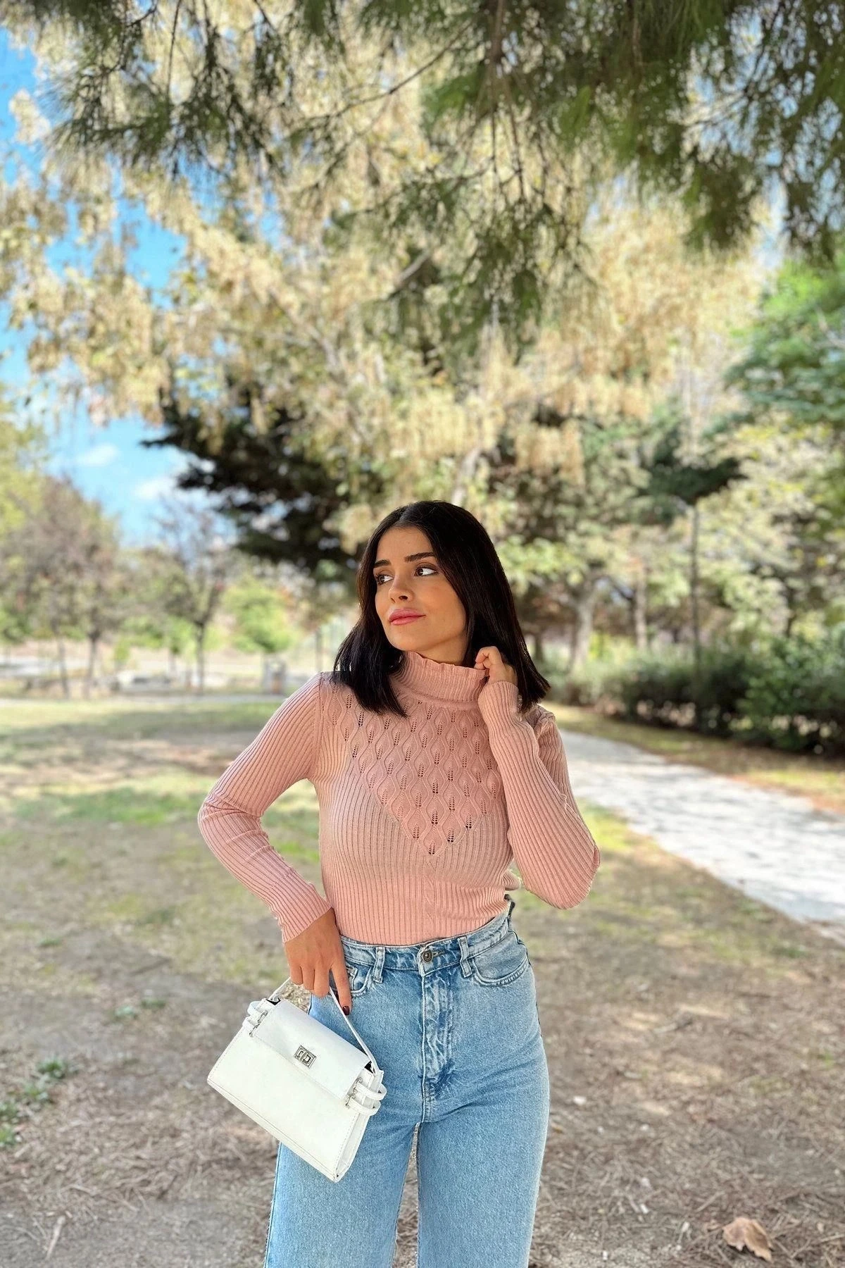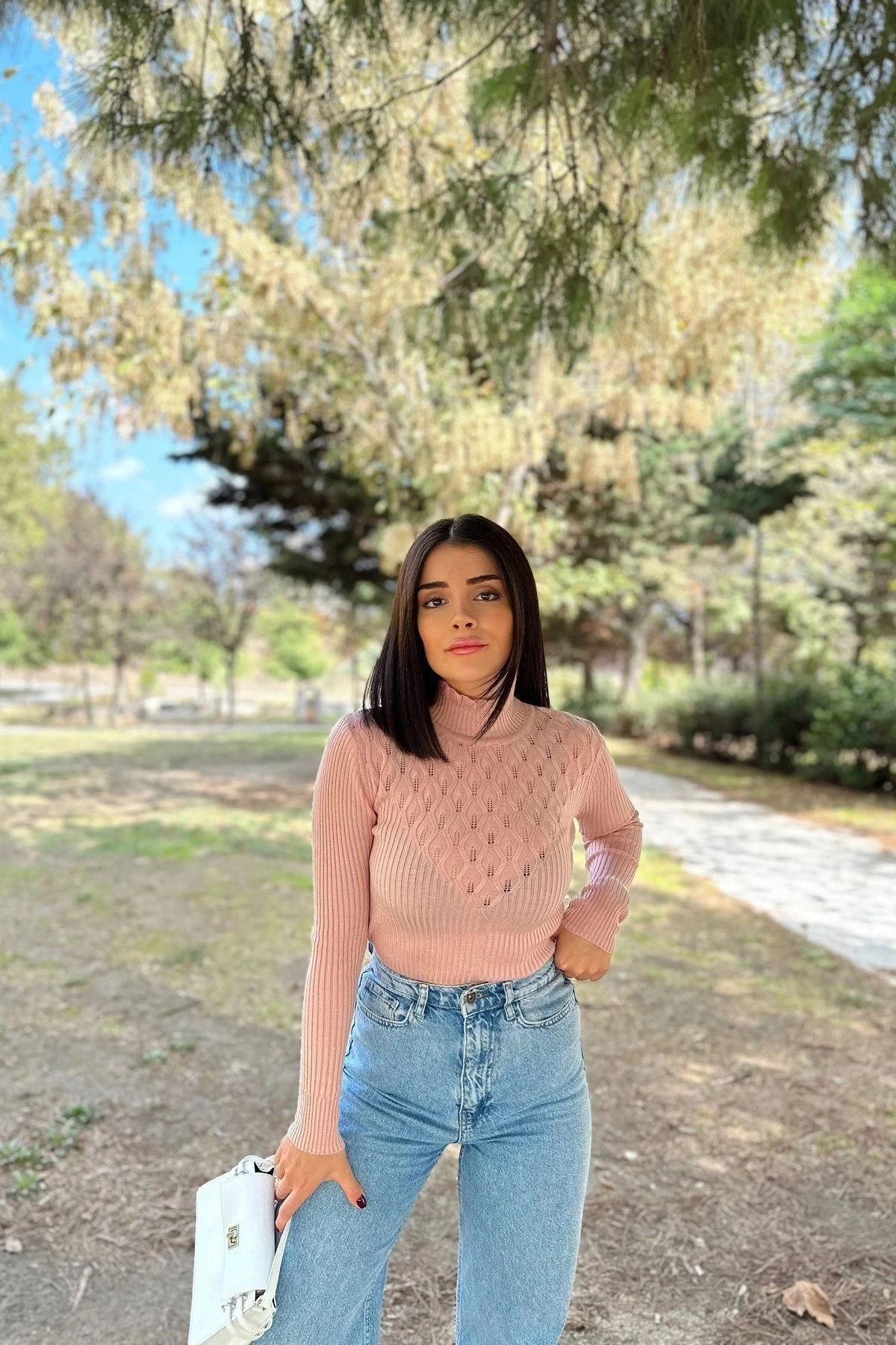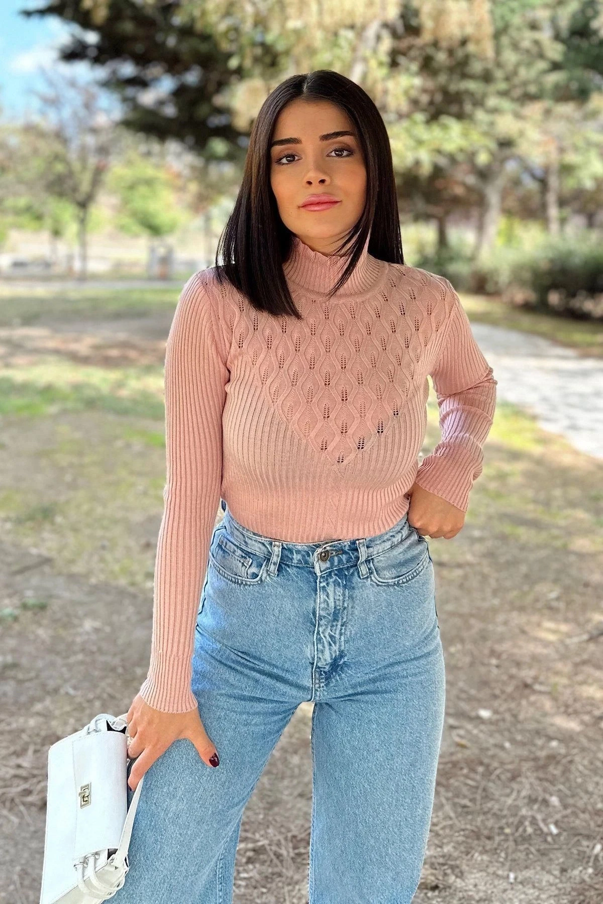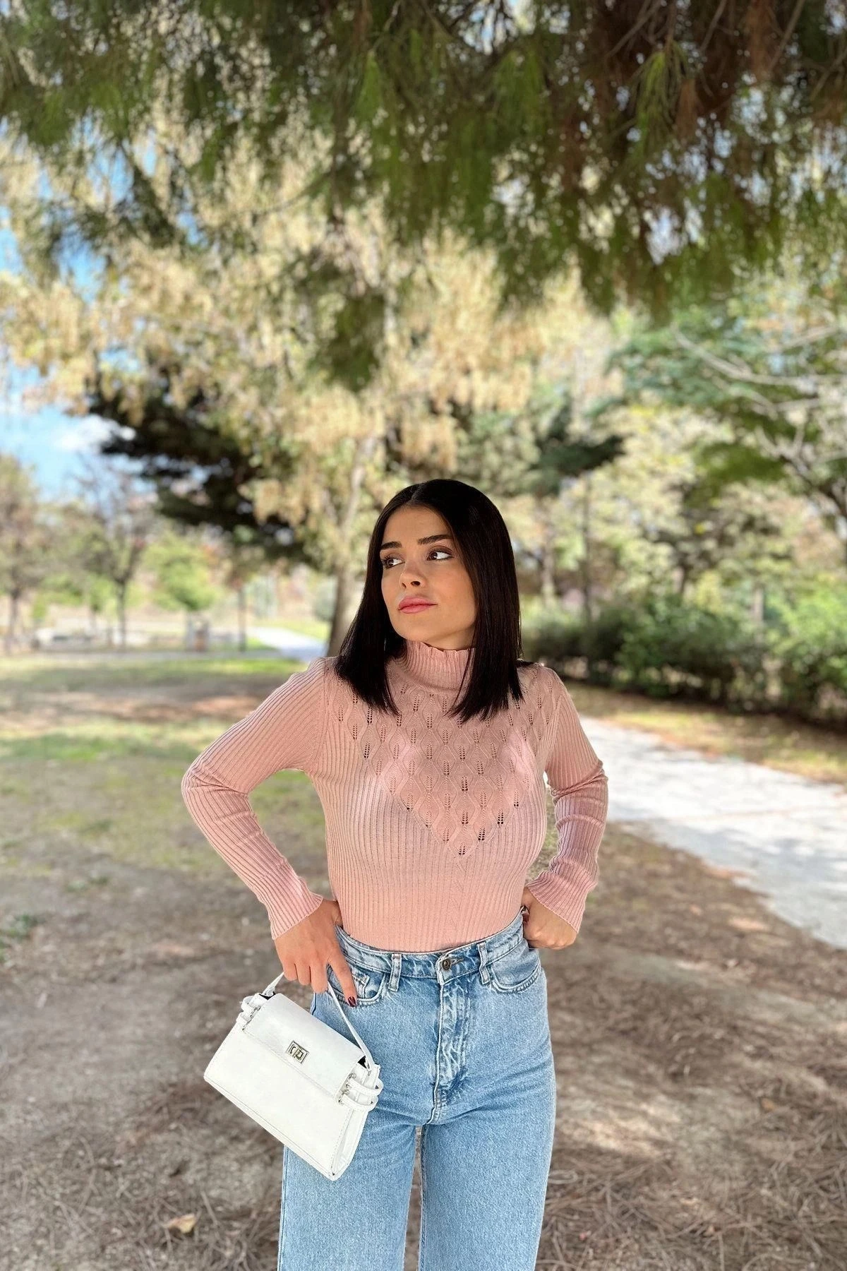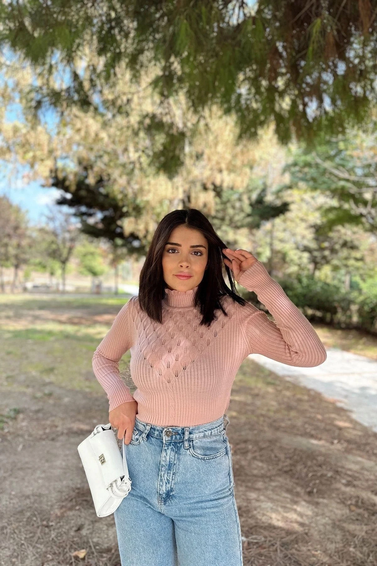 Kadın Pudra Yüksek Yaka, Uzun Kol,Vucüda Oturan Kalıp, Esnek Kumaş, Dekolte Detay, Triko Bluz