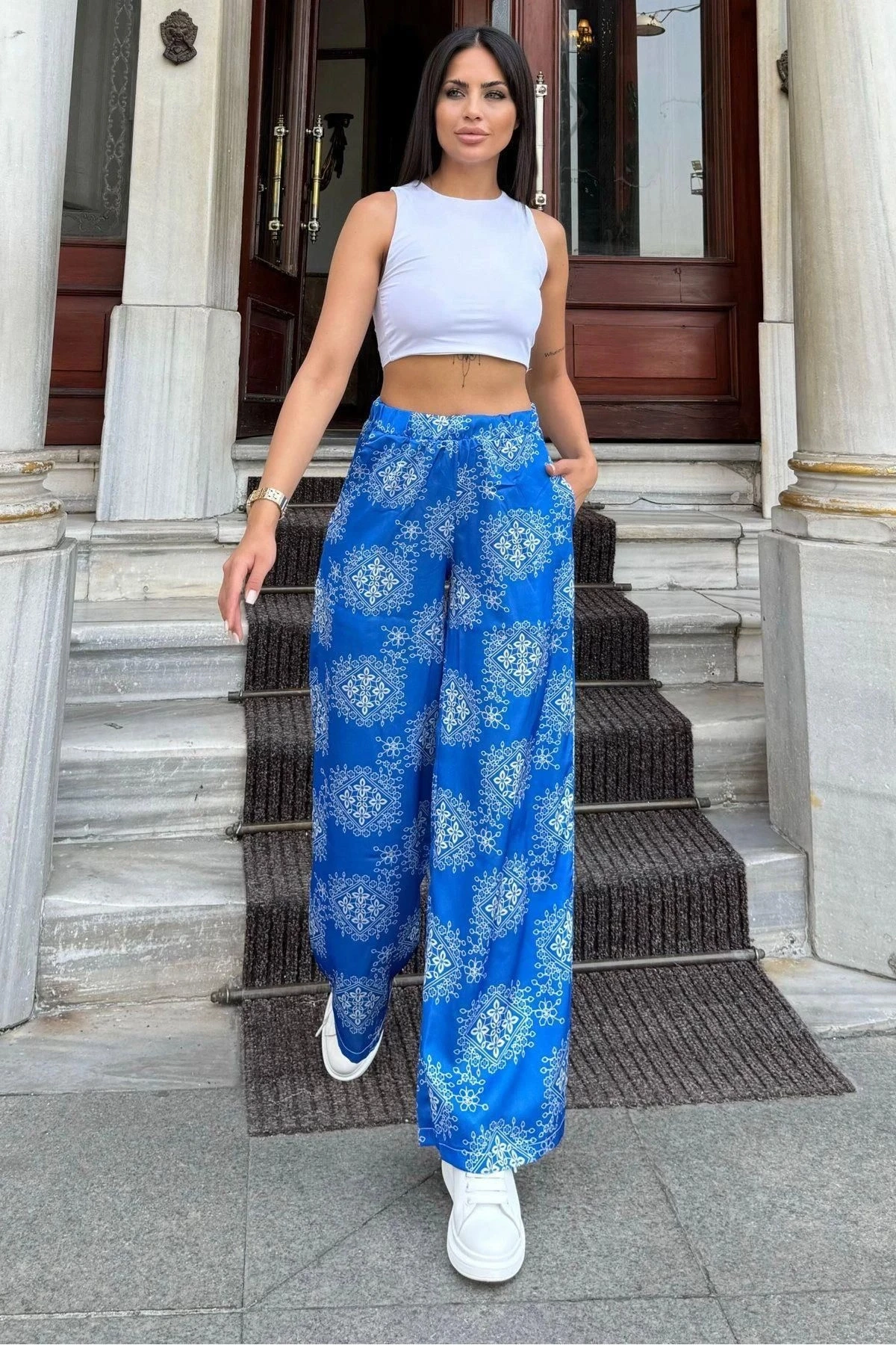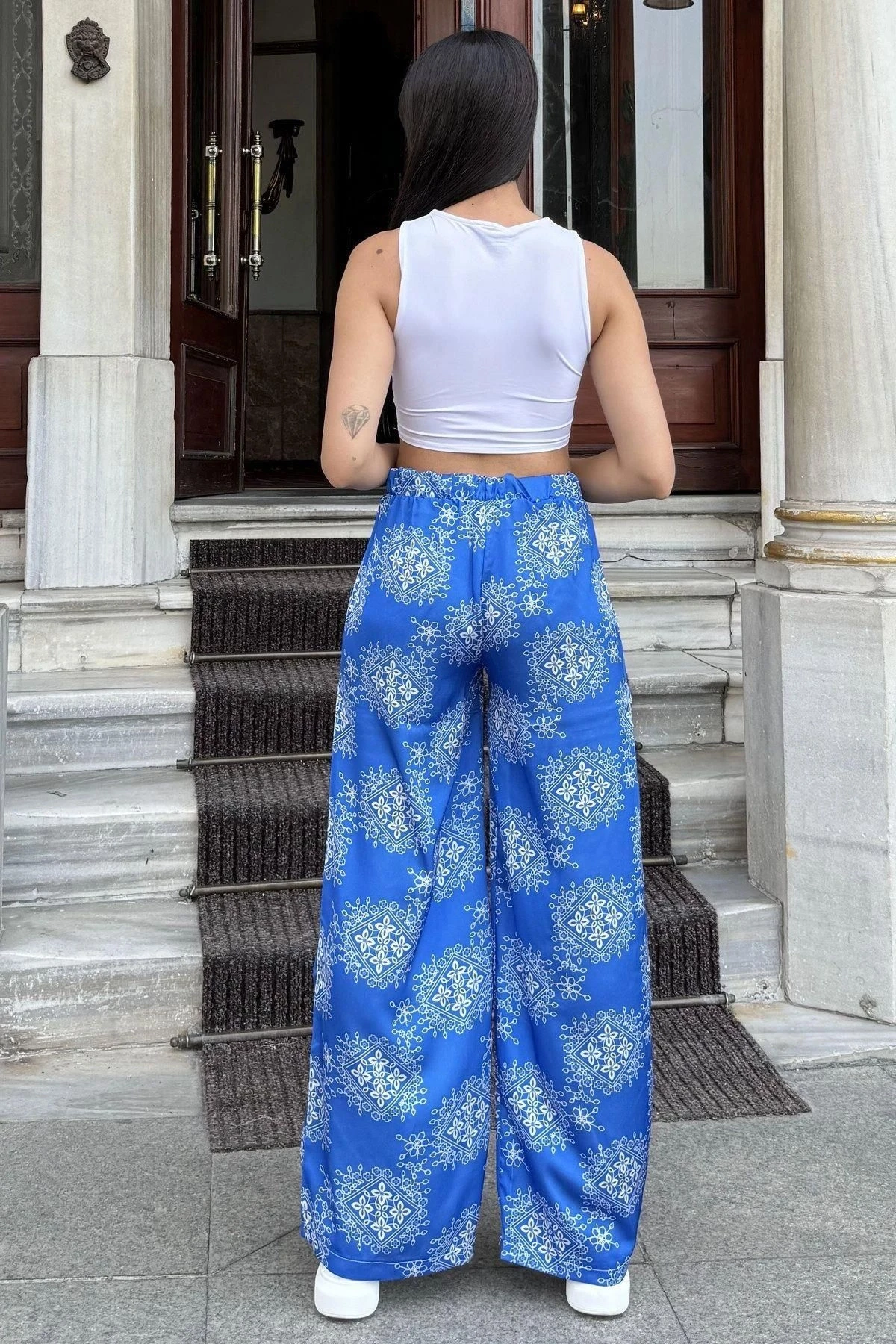 Kadın Saks Etnik Desenli, Beli Lastikli, Bol Paça, Salaş Saten Pantolon - Tesettüre Uygun