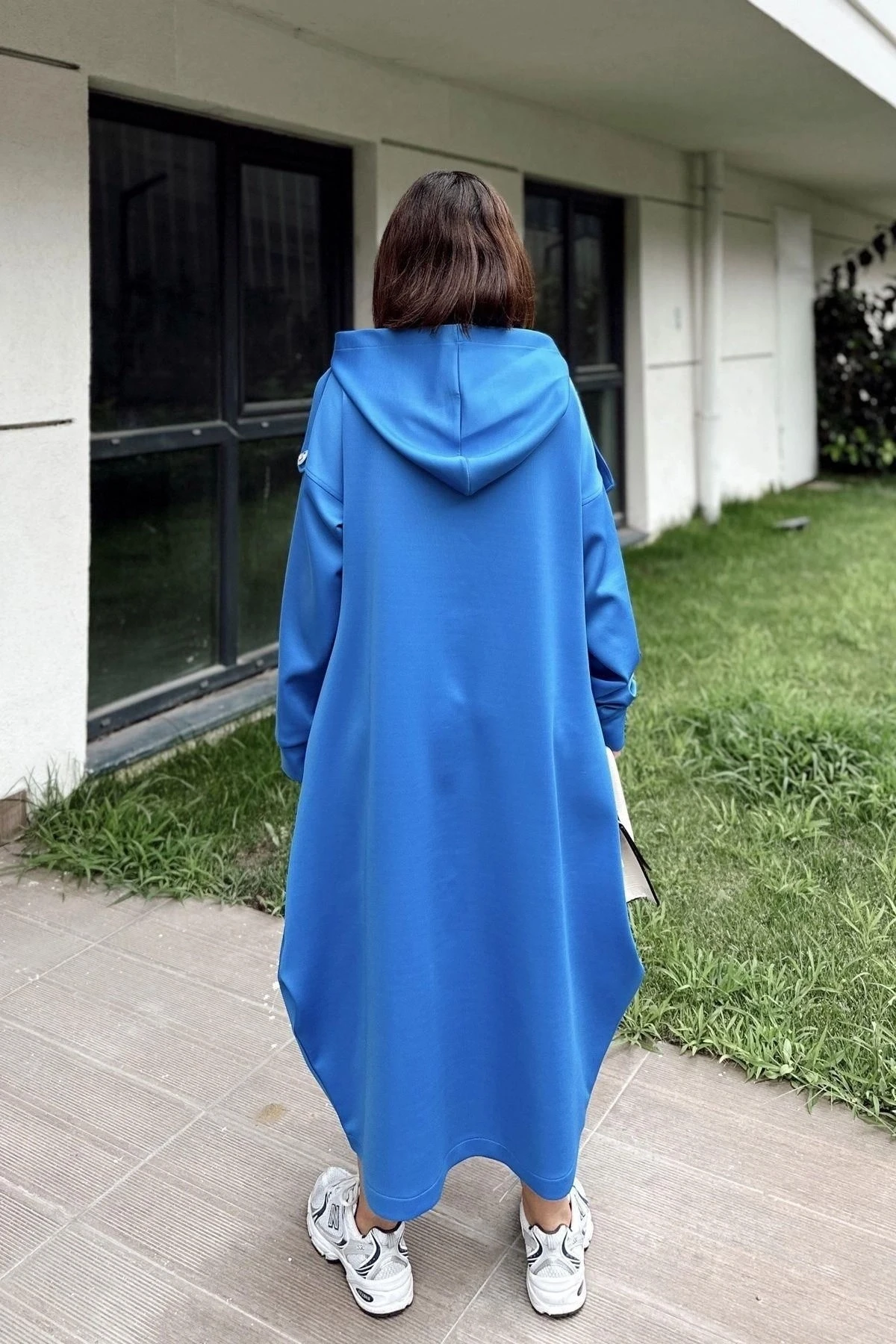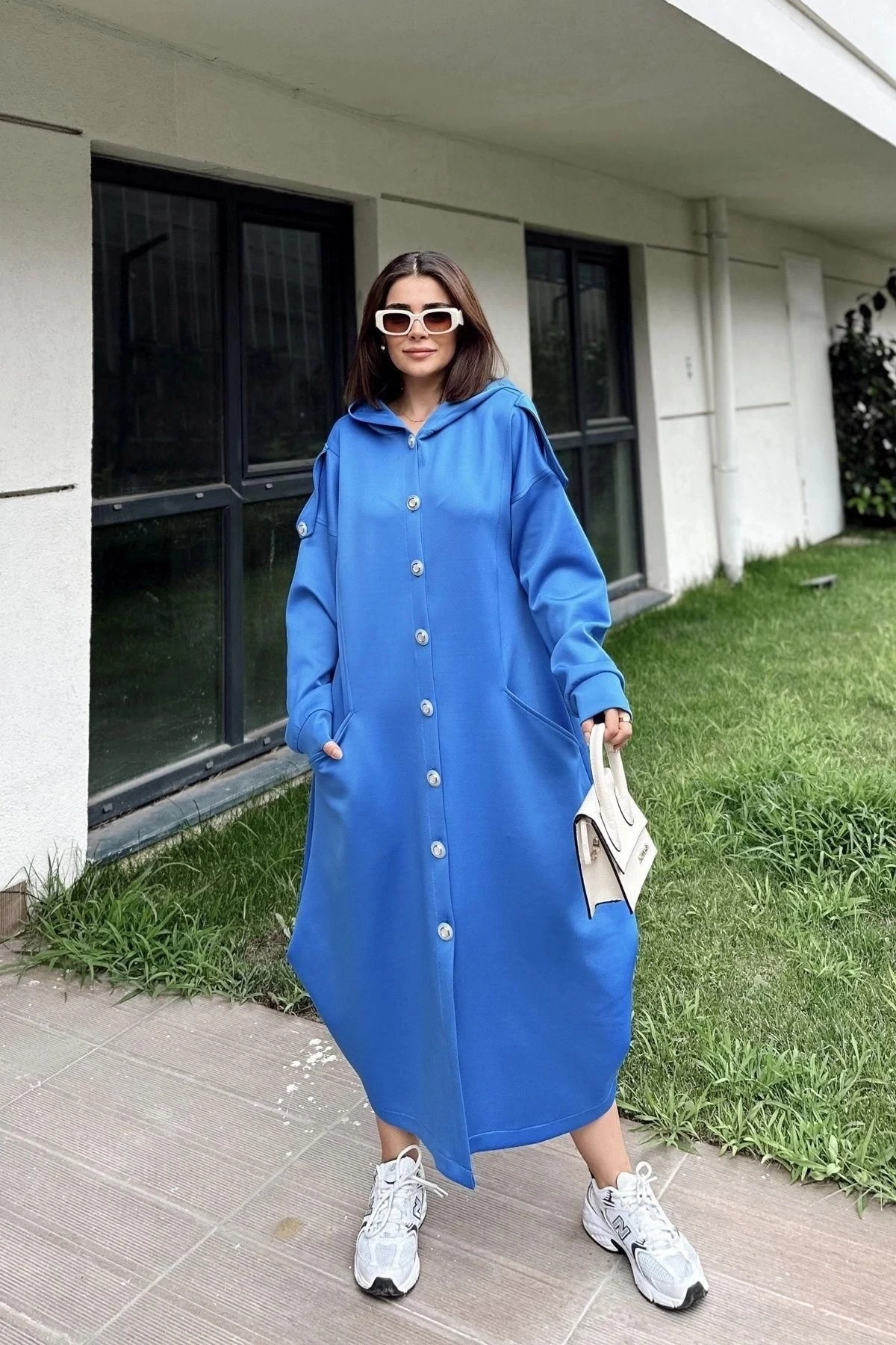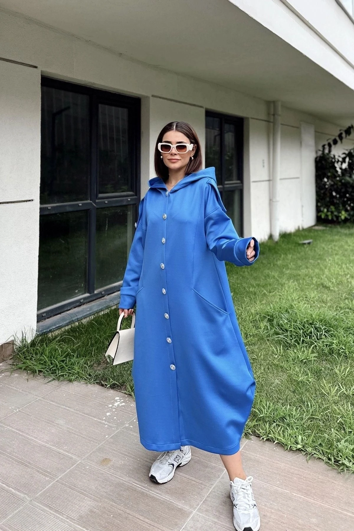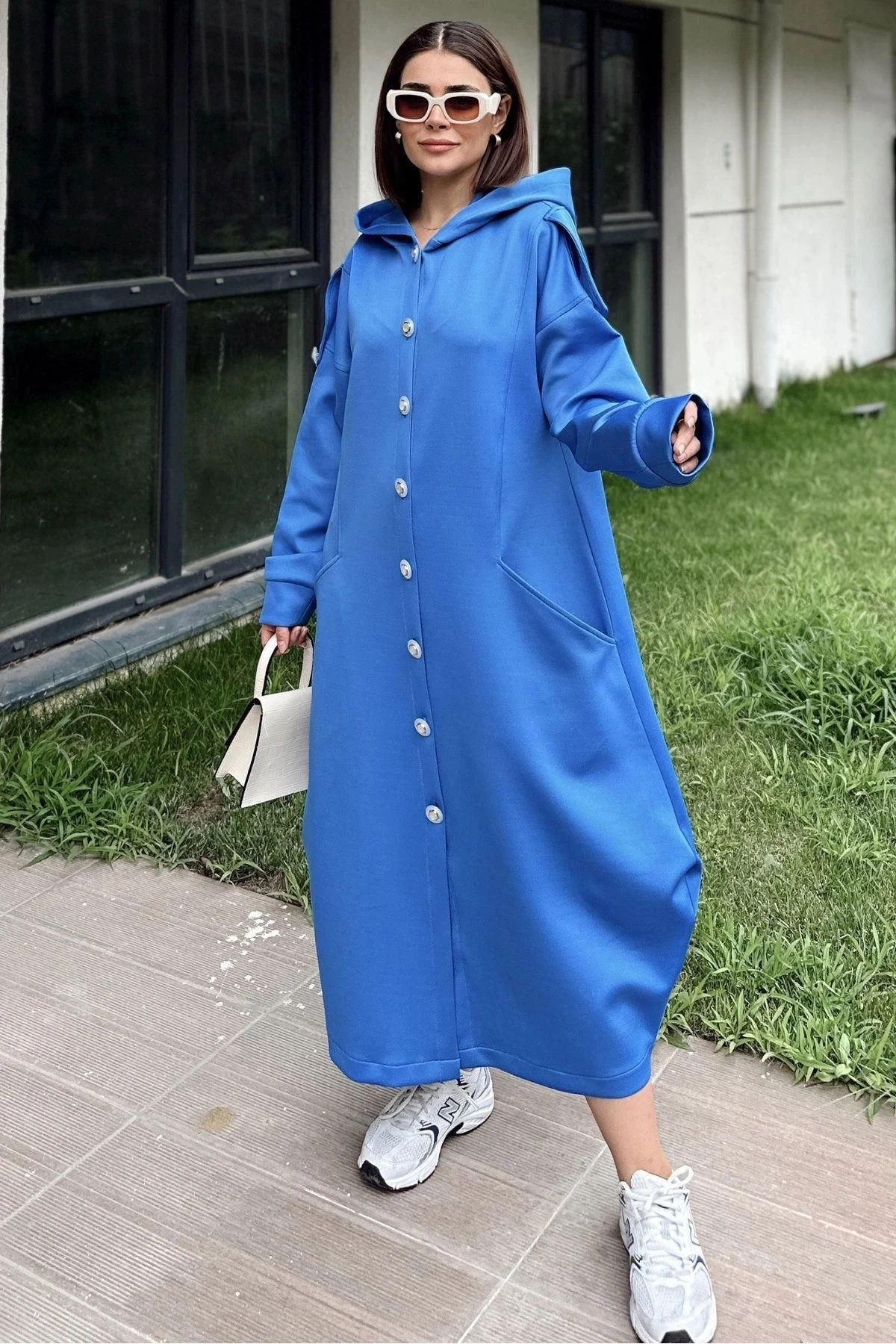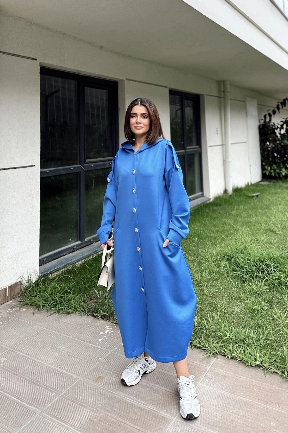 Kadın Saks Kapüşonlu, Uzun Kol, Düğme Detaylı, Eteği Oval, Çift Cepli, Uzun Oversize Salaş Elbise