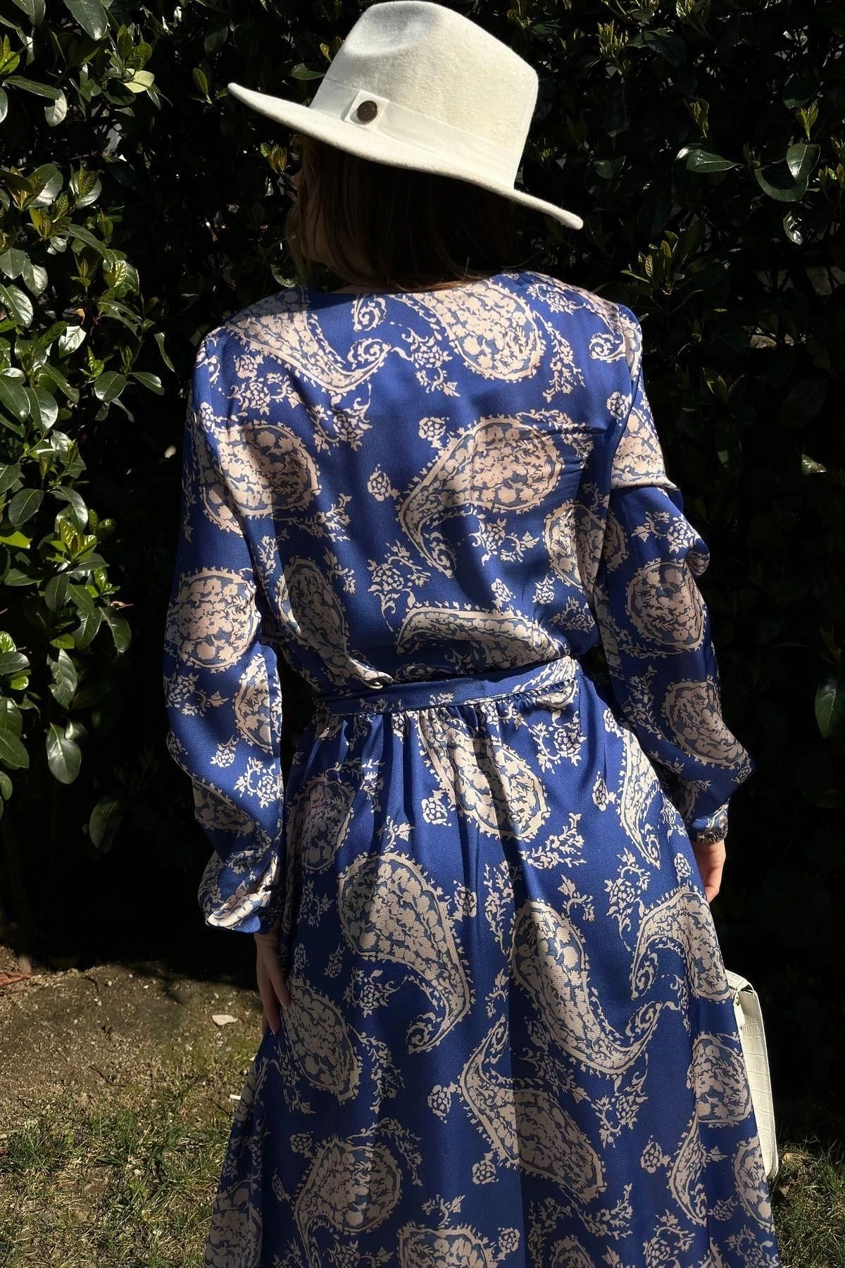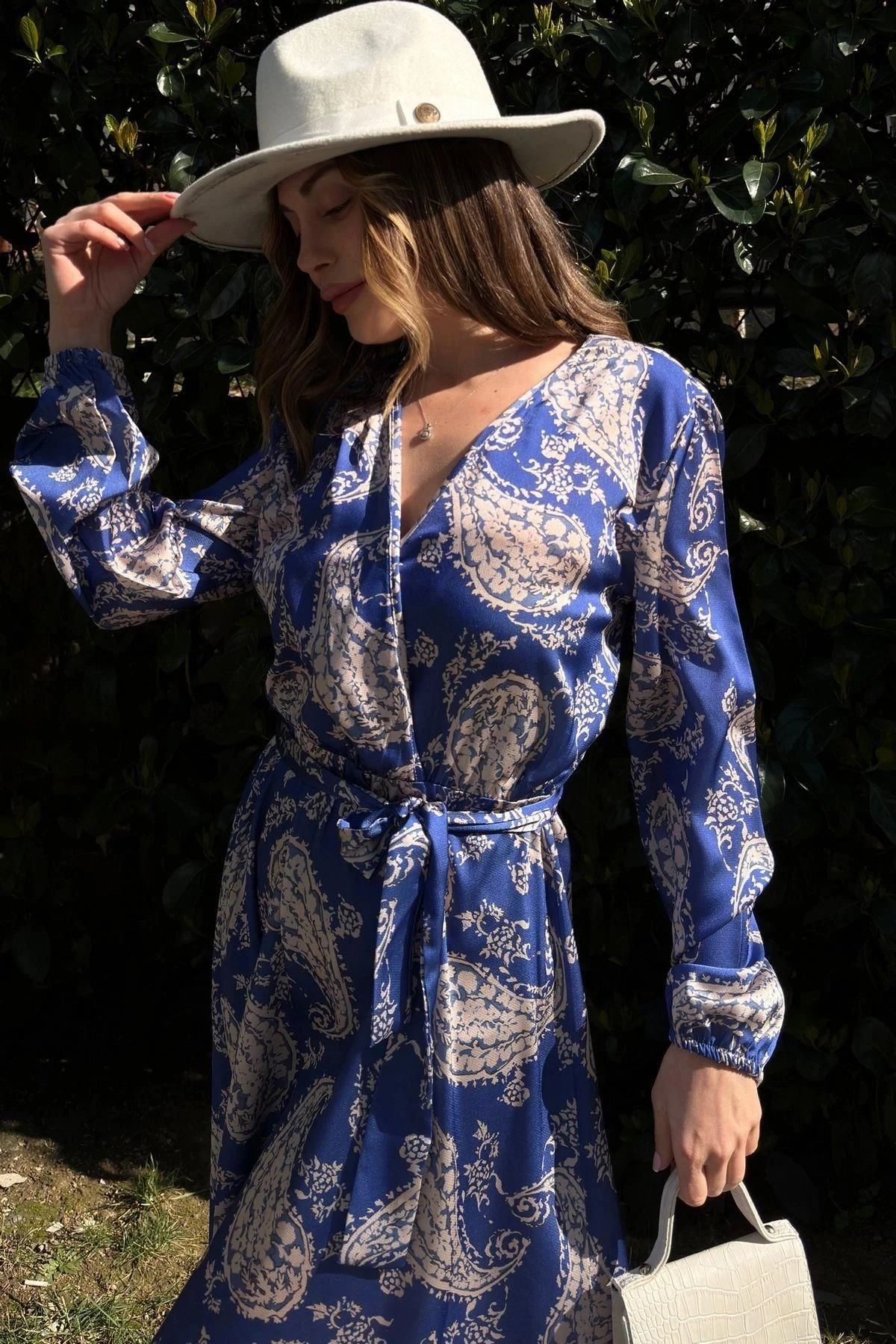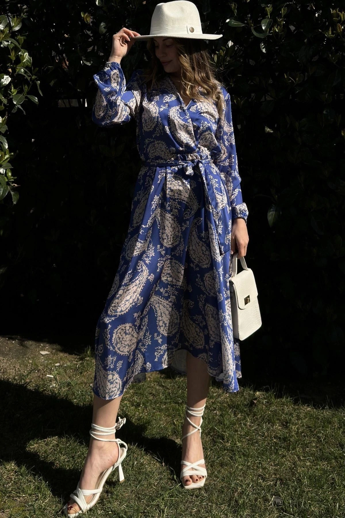Kadın Saks Kruvaze Yaka, Beli Kuşaklı, Kol Bilekleri Lastikli, Salaş, Uzun Saten Elbise