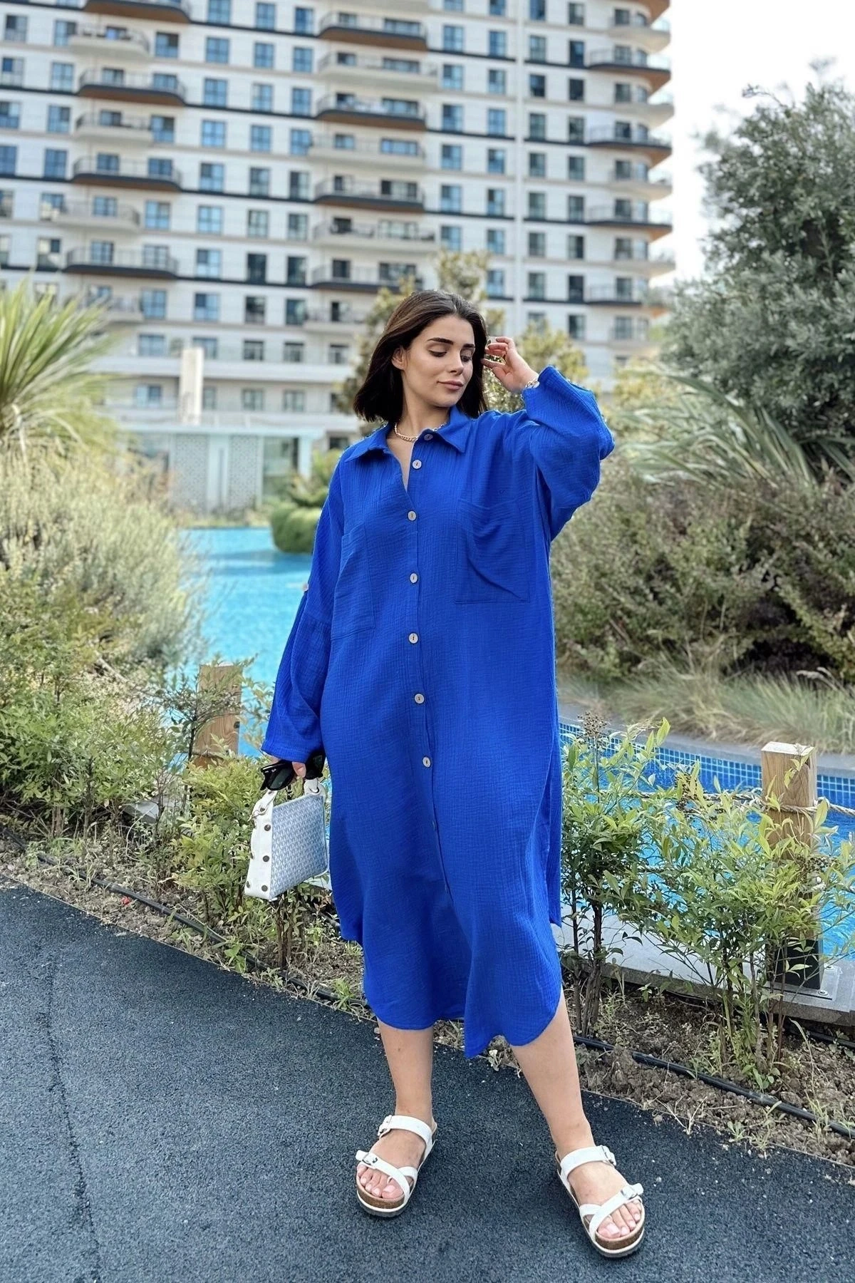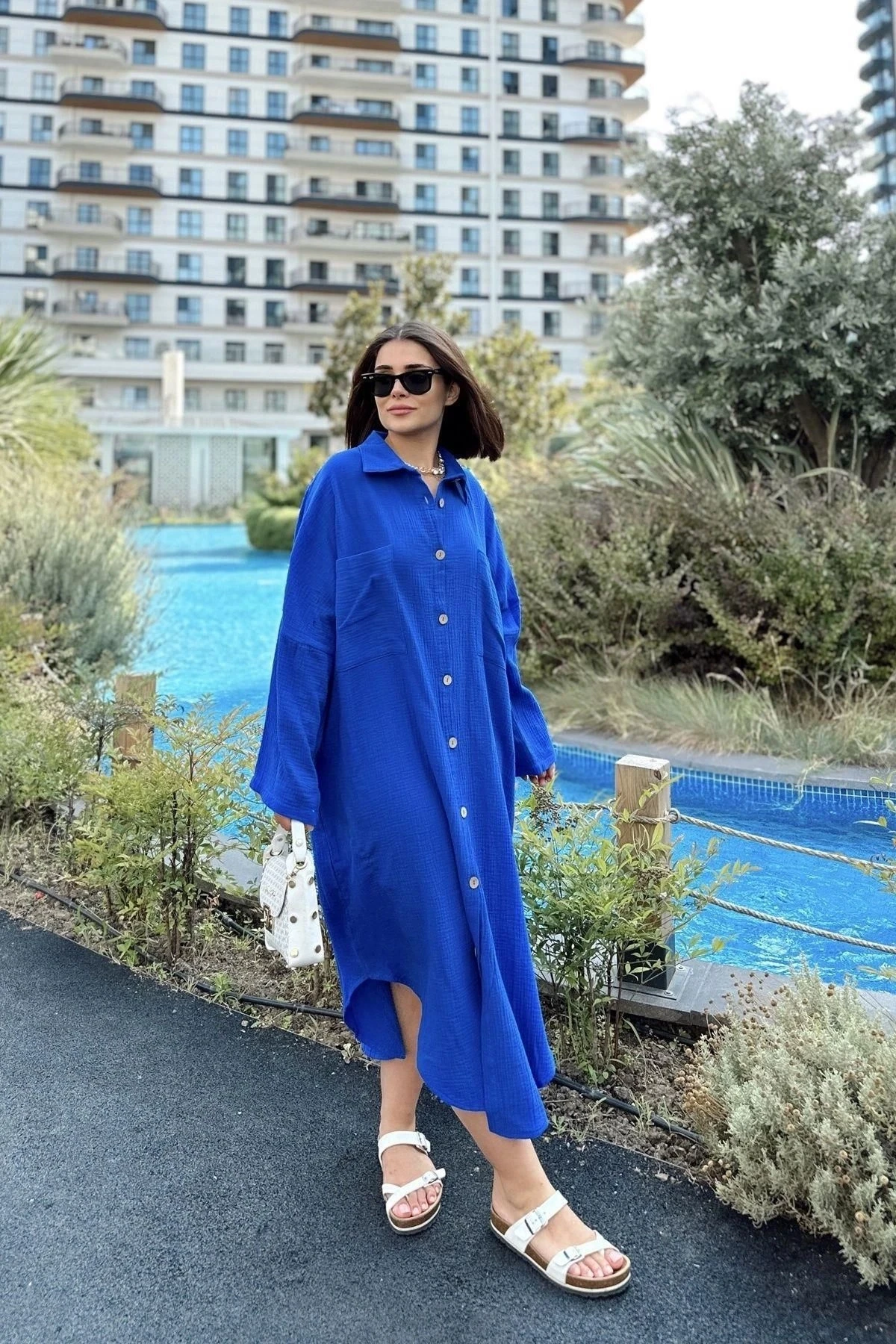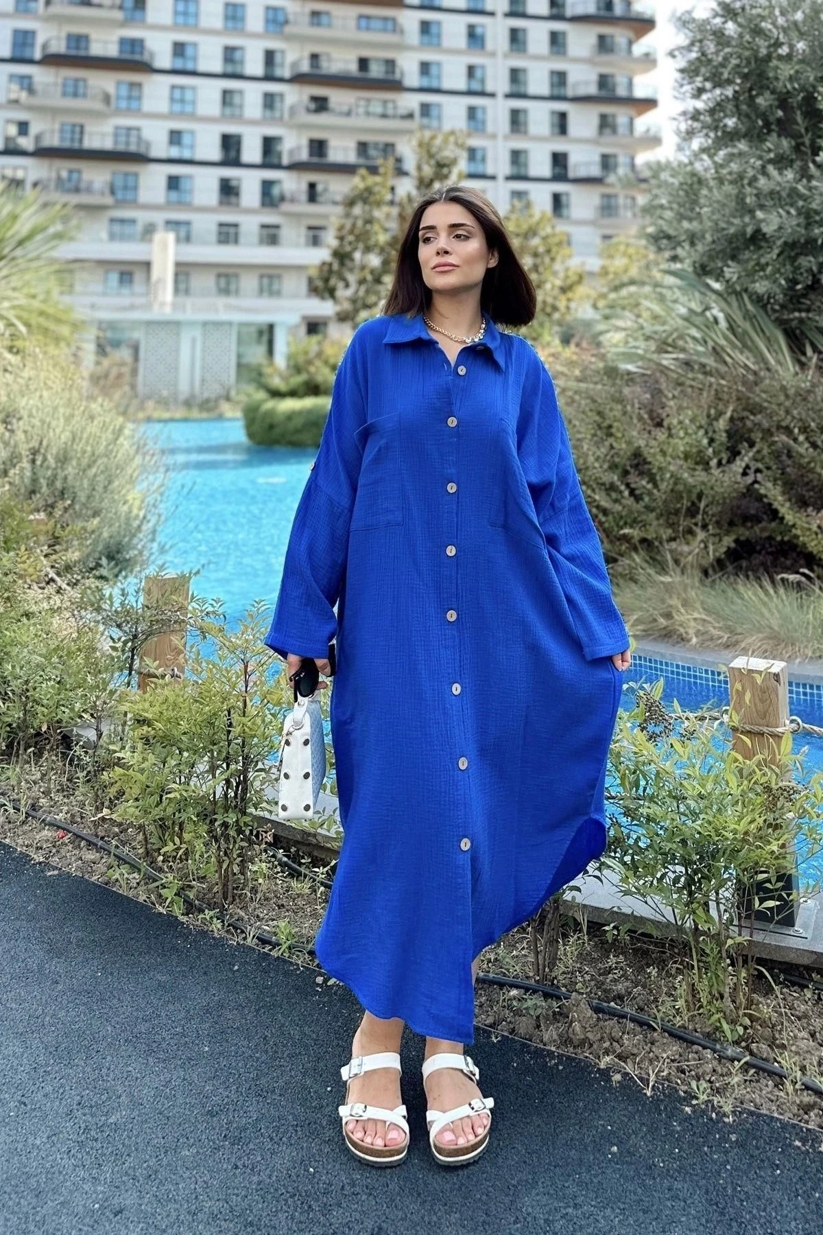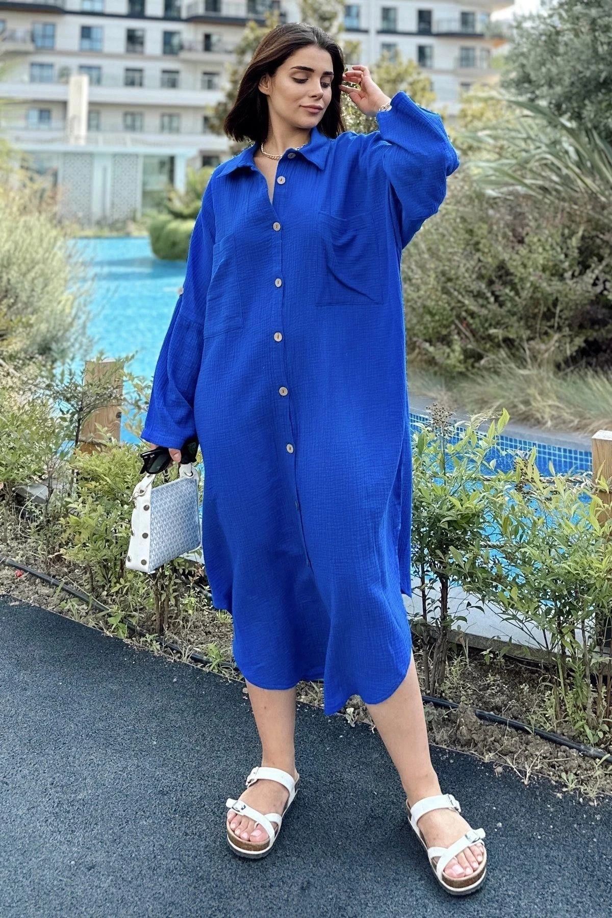 Kadın Saks Muslin Kumaş, Yarasa Kol, Eteği Oval, Çift Cepli, Uzun Oversize Salaş Gömlek Elbise