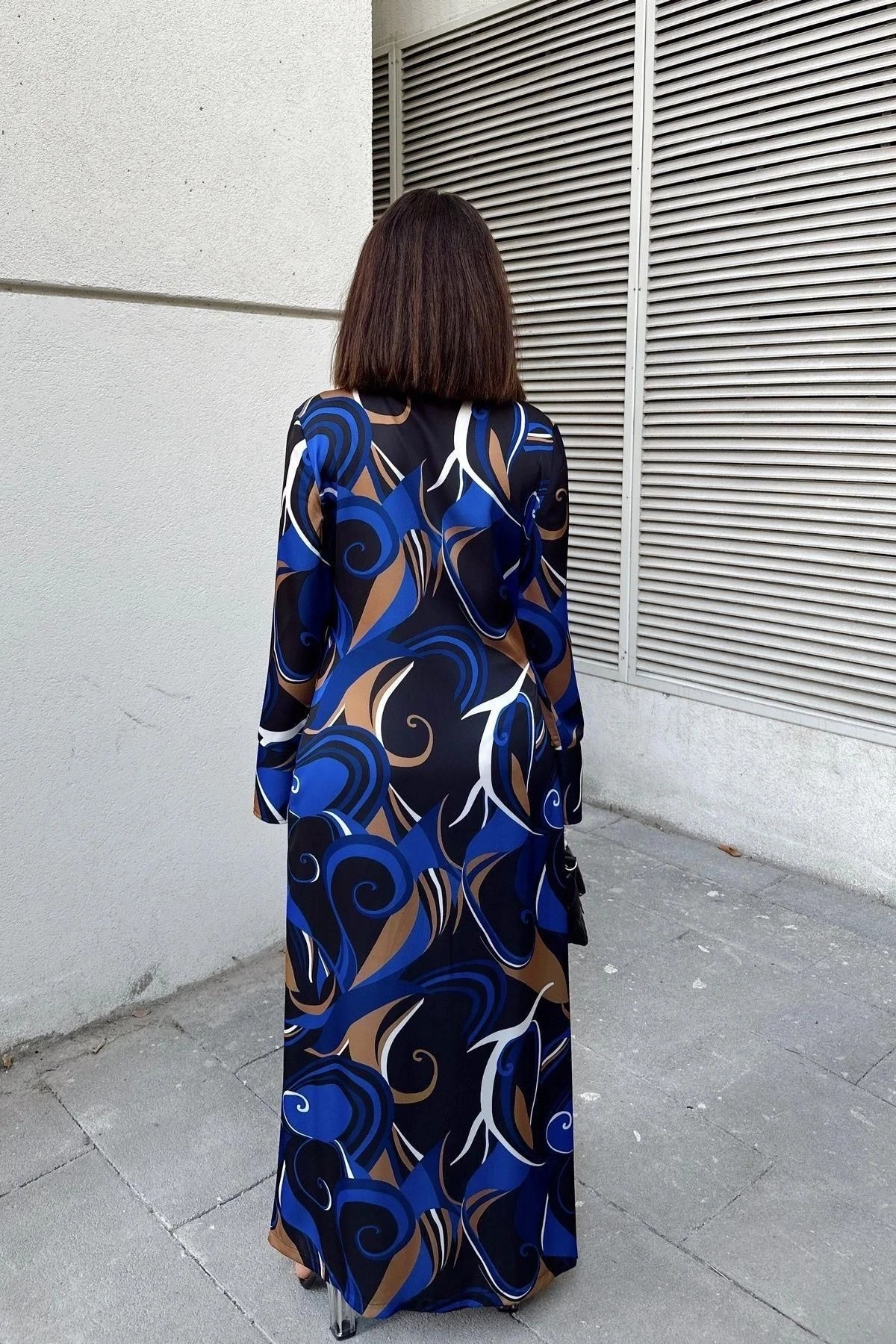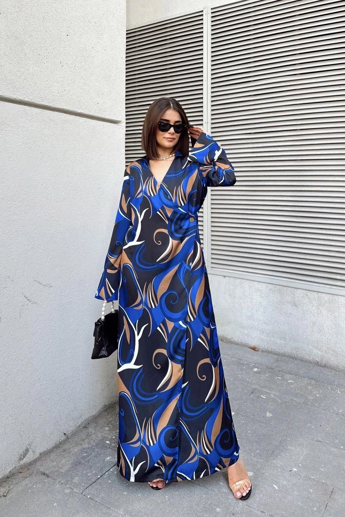 Kadın Saks & Siyah Kruvaze, Düğme Detay, Yırtmaçlı, Beli Kuşaklı, Geniş Manşet, Salaş, Uzun Elbise