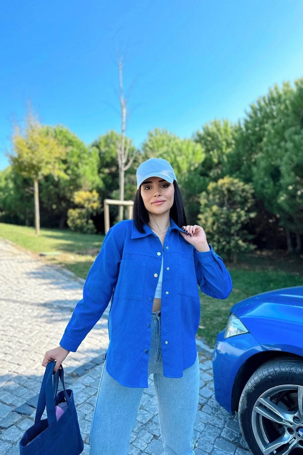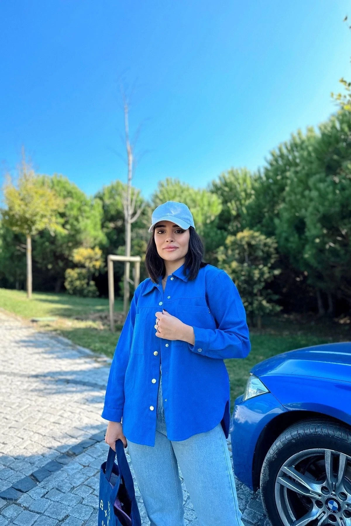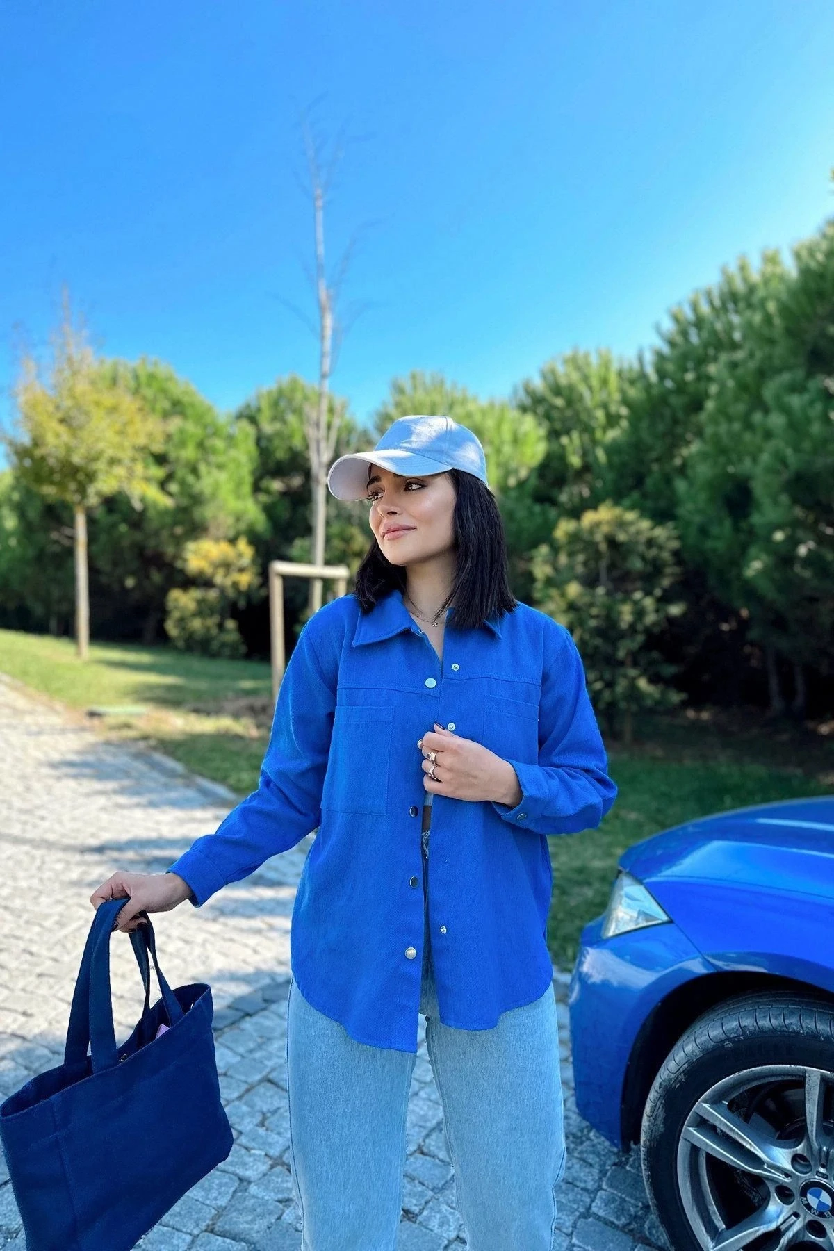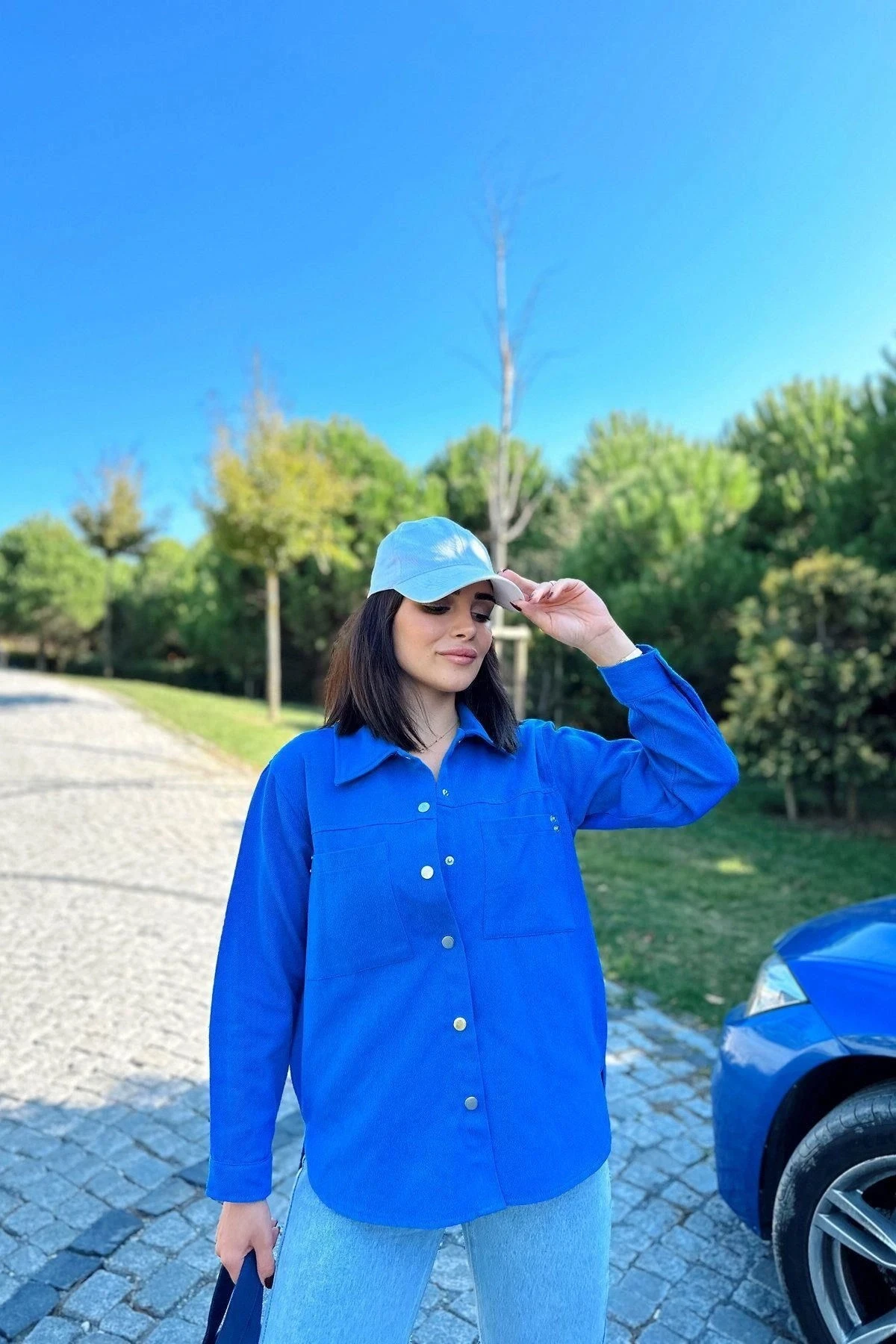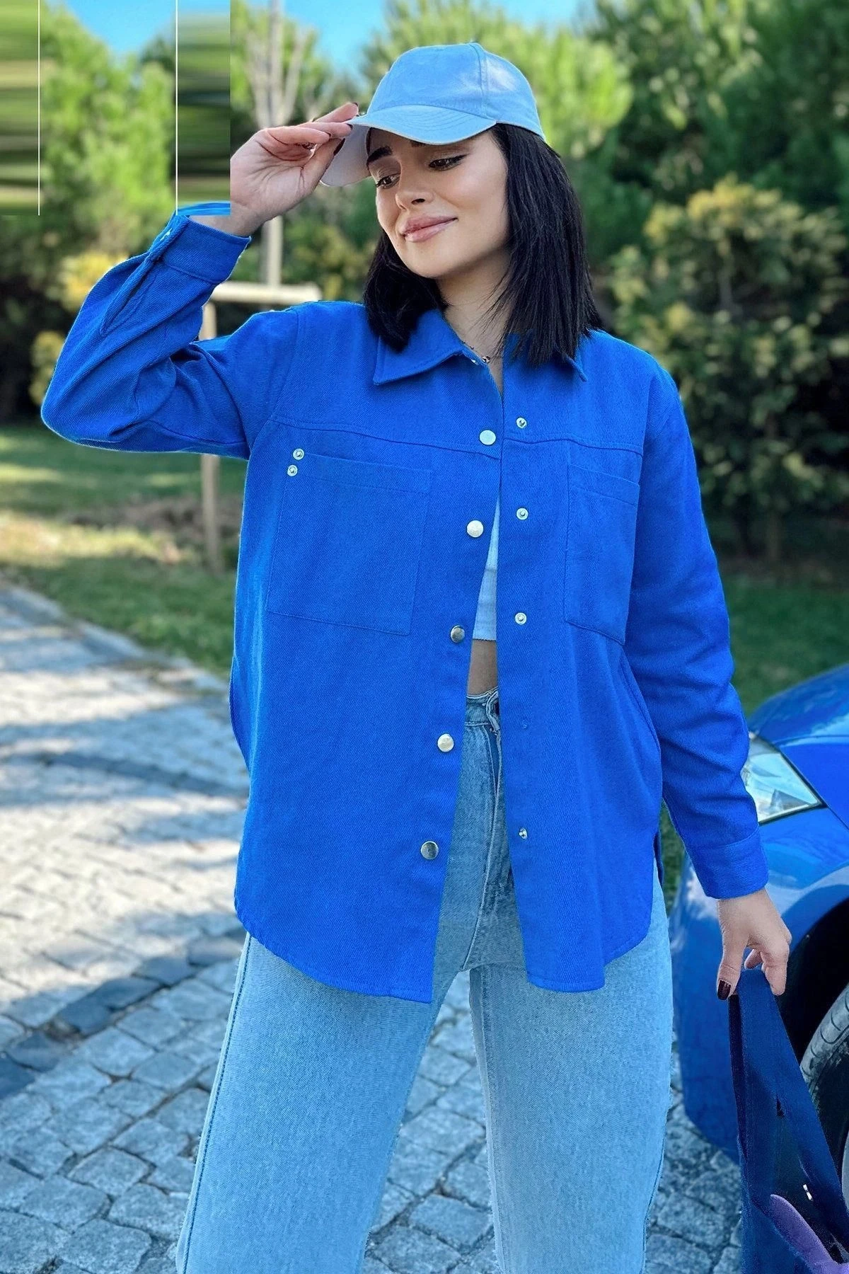 Kadın Saks Uzun Kol, Çift Cep, Arkası Pliseli, Eteği Oval Kesim, Yırtmaçlı, Gabardin Gömlek Ceket